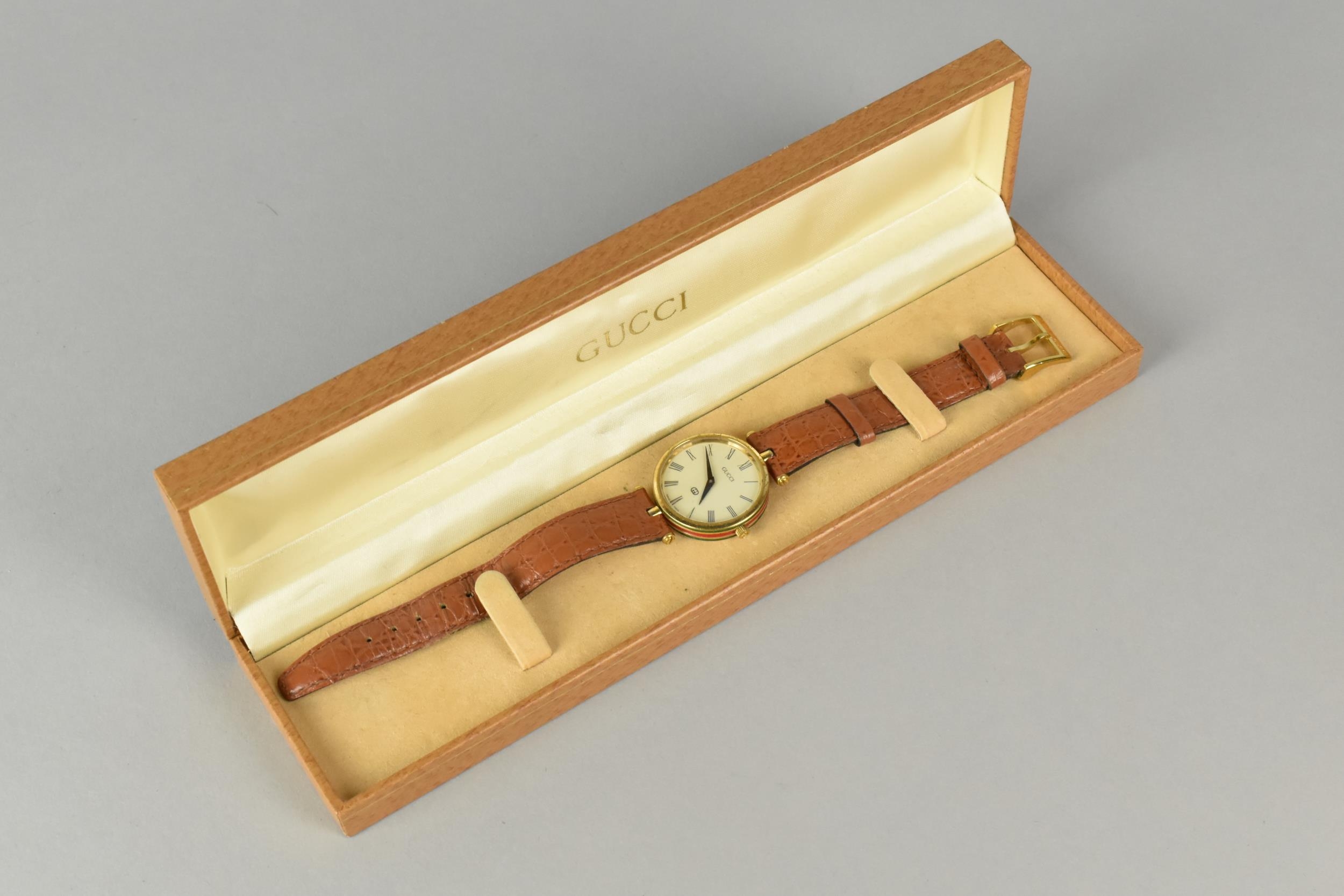 A Vintage Gucci Wrist Watch, Cream Coloured Face with Roman Numerals, Gold Coloured Case with Green and Red Enamels, Verso with Interlocking GG, Case Measuring 30mm Diameter (Excluding Crown) Upon a Faux Crocodile Skin Gucci Strap, Complete with Original Box
