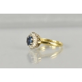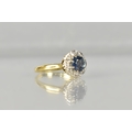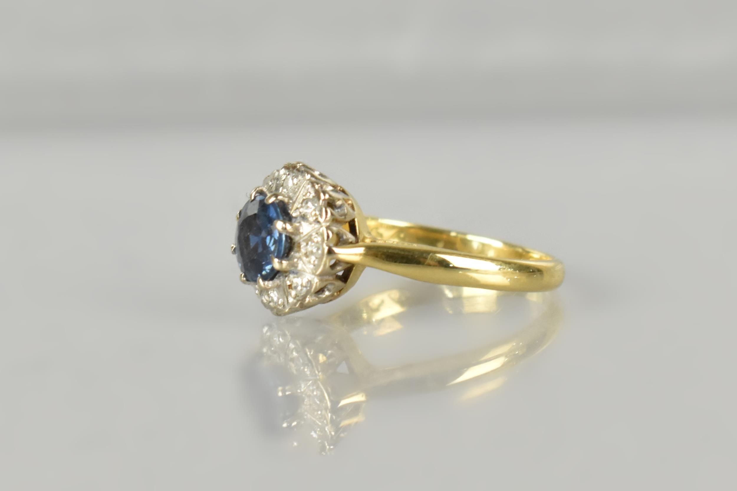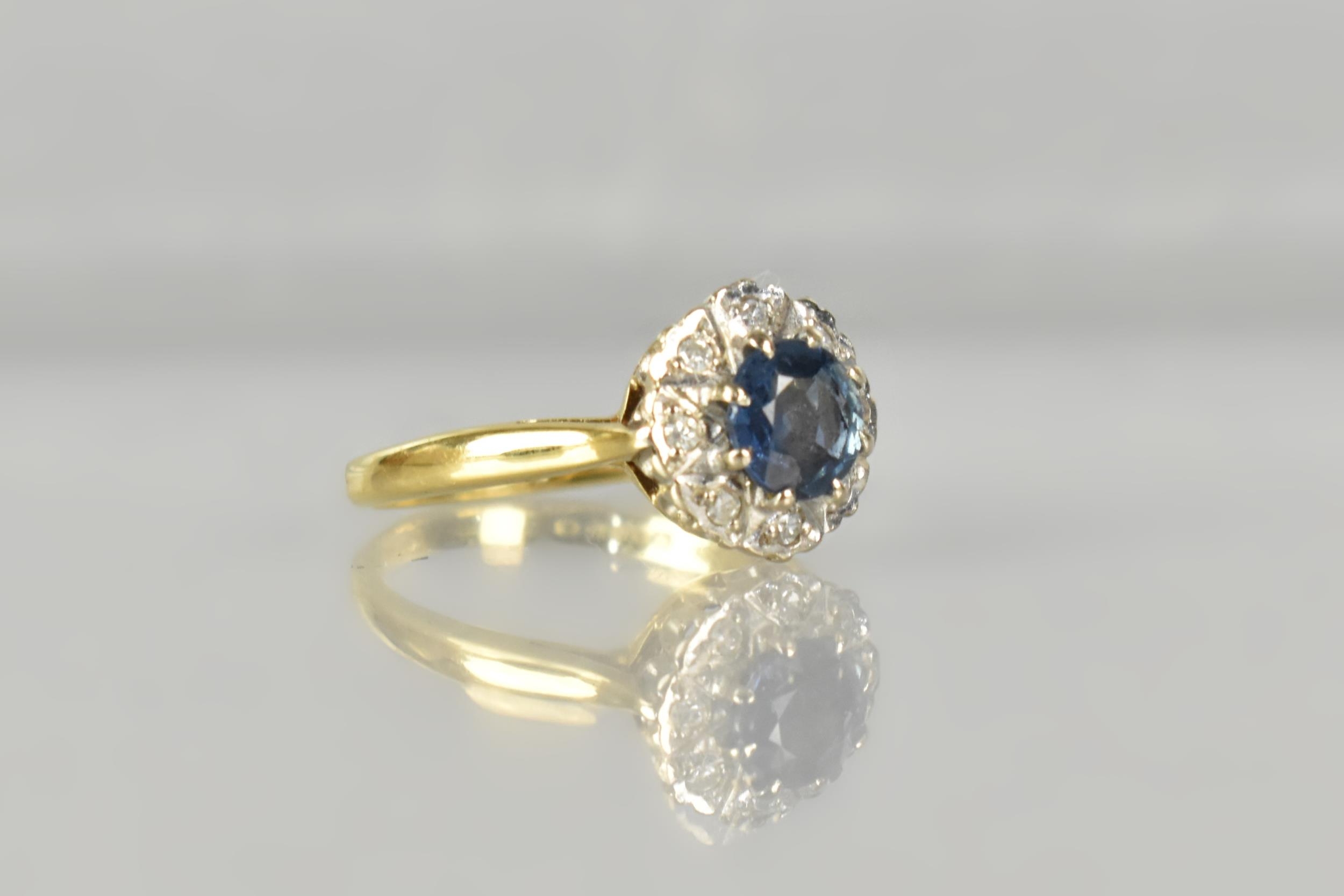 An 18ct Gold, Diamond and Blue Zircon Type Cluster Ring, Central Round Cut Stone 6.4mm Diameter, Supported in Eight Gold Metal Claws, with a Halo of Small Round Cut Diamonds Grain Set and Mounted in White Metal, Tapered Shoulders to a Polished D Shaped Band, London Hallmark for 1977, Size H, 2.9gms