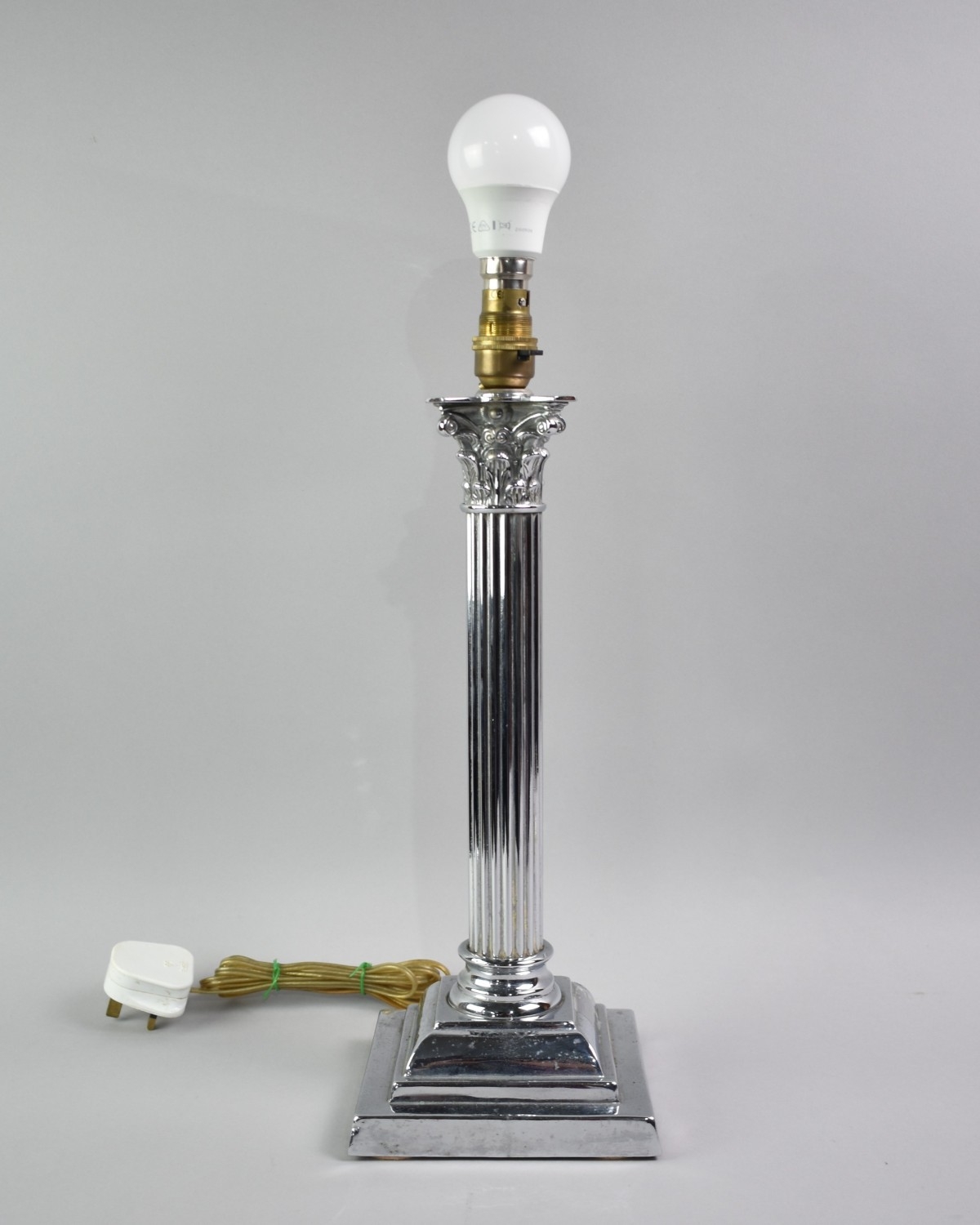A Mid 20th Century Chromed Table Lamp Base in the Form of a Reeded Corinthian Column, No Shade, 32cms High