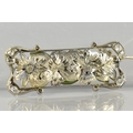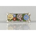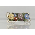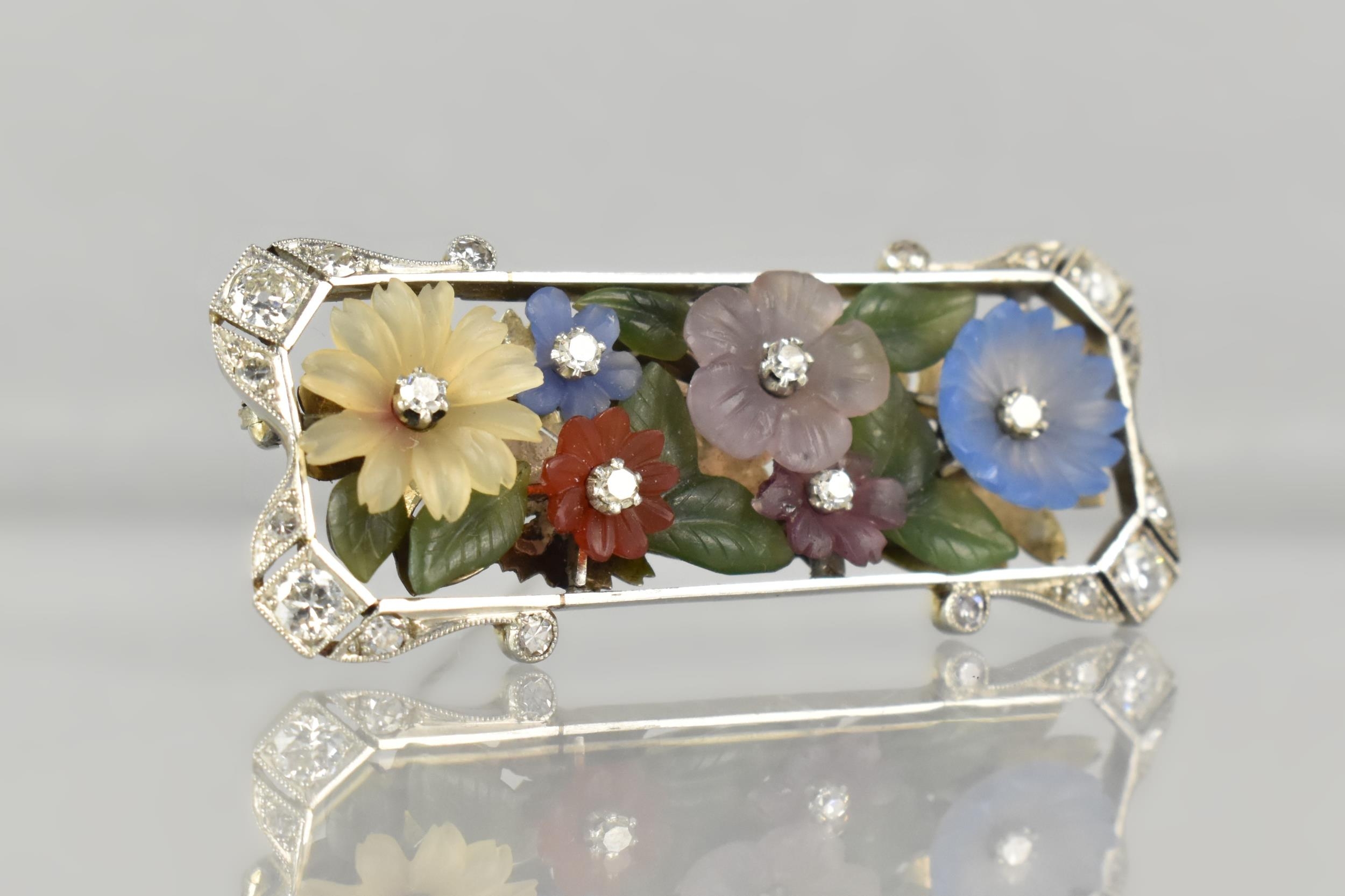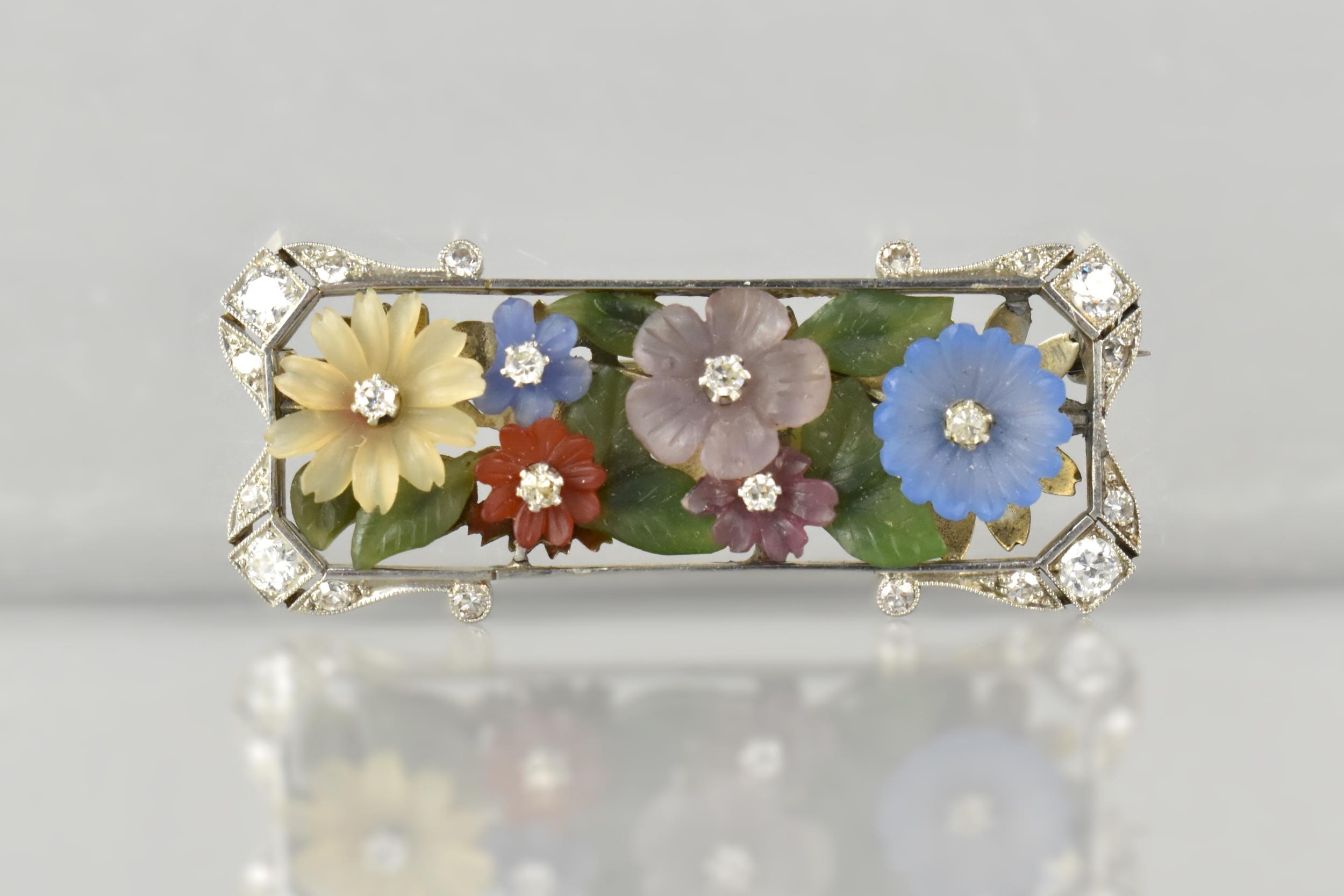 An Early 20th Century Austrian 18ct Gold, Diamond and Hardstone Mounted Floral Brooch Attributed Ernst Paltscho, Each Carved Chalcedony 'Wildflower' having Central Single Cut Diamond Raised in Six Claws, Largest Flower 11.5m Diameter, Supported on a Bed of Nephrite Jade Leaves, Rectangular White Metal Mount With Scrolled Corners having Mixed Cut Diamond Embellishments, (Largest Four Approx 2.7mm Diameter) Grain Set within Milgrain Frame and Verso with Scrolling Decoration, Stamped to Bar BS 750, 12.3gms, 49mm Wide and 19.6mm High Max, One or Two Losses to Petals, Possibly Carving Loss