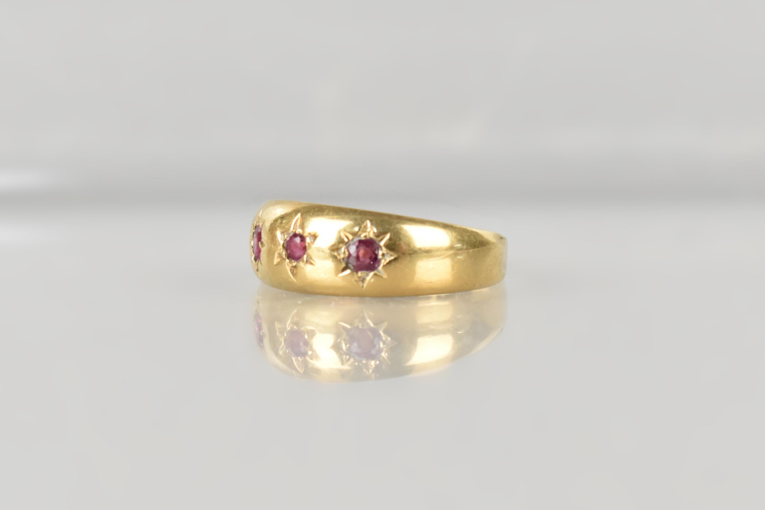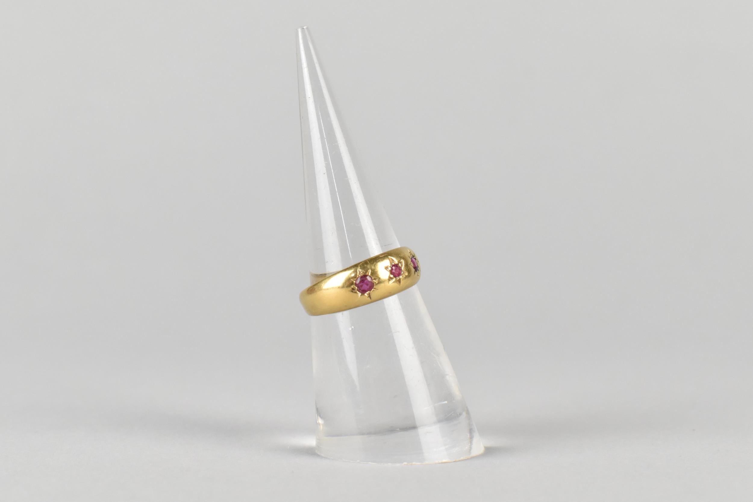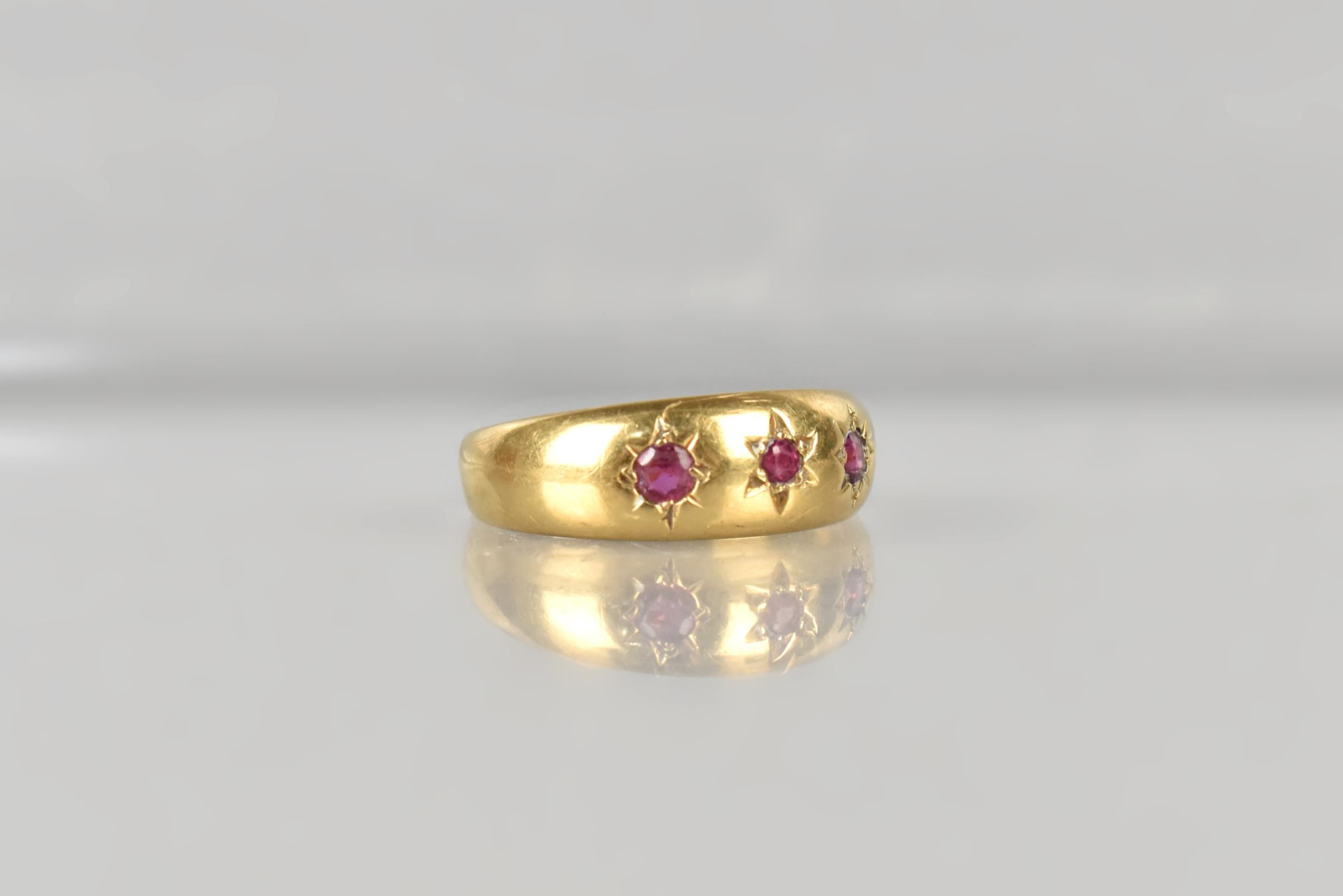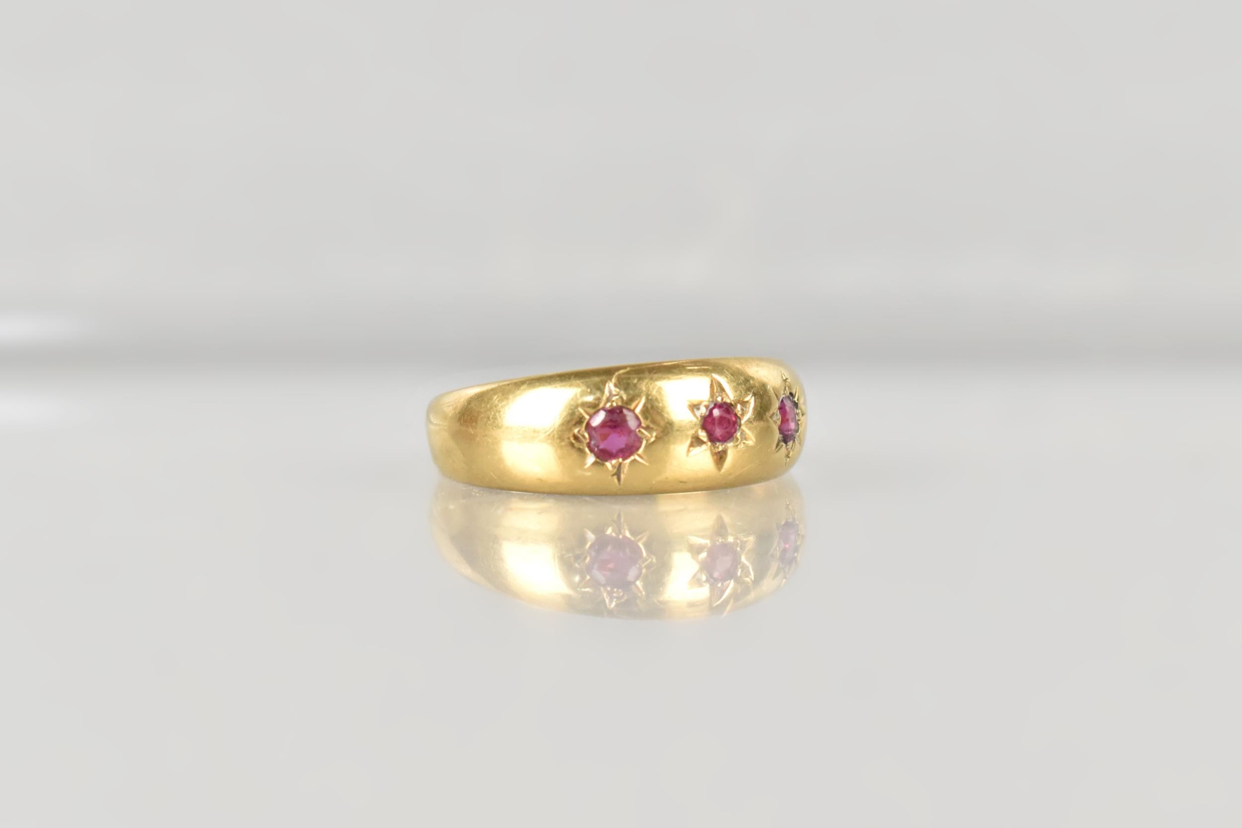 An Edwardian 18ct Gold and Ruby Gypsy Ring, Grain Set Round Cut Matched Stones, Largest Measuring 1.8mm Diameter, polished D Shape Band Stamped to the Interior for Chester 1902, and with Makers Mark Rubbed, Size M, 2.4gms