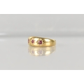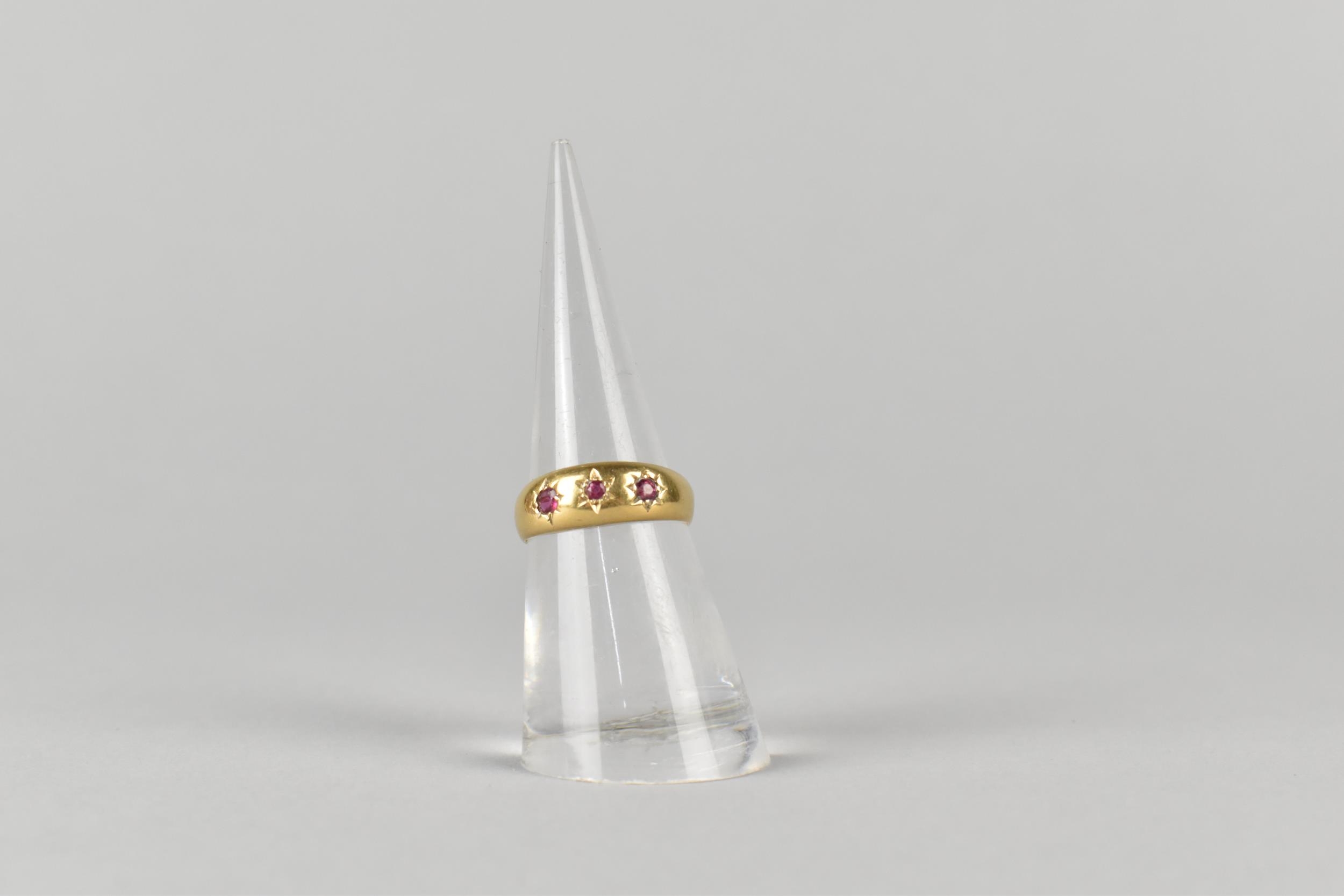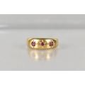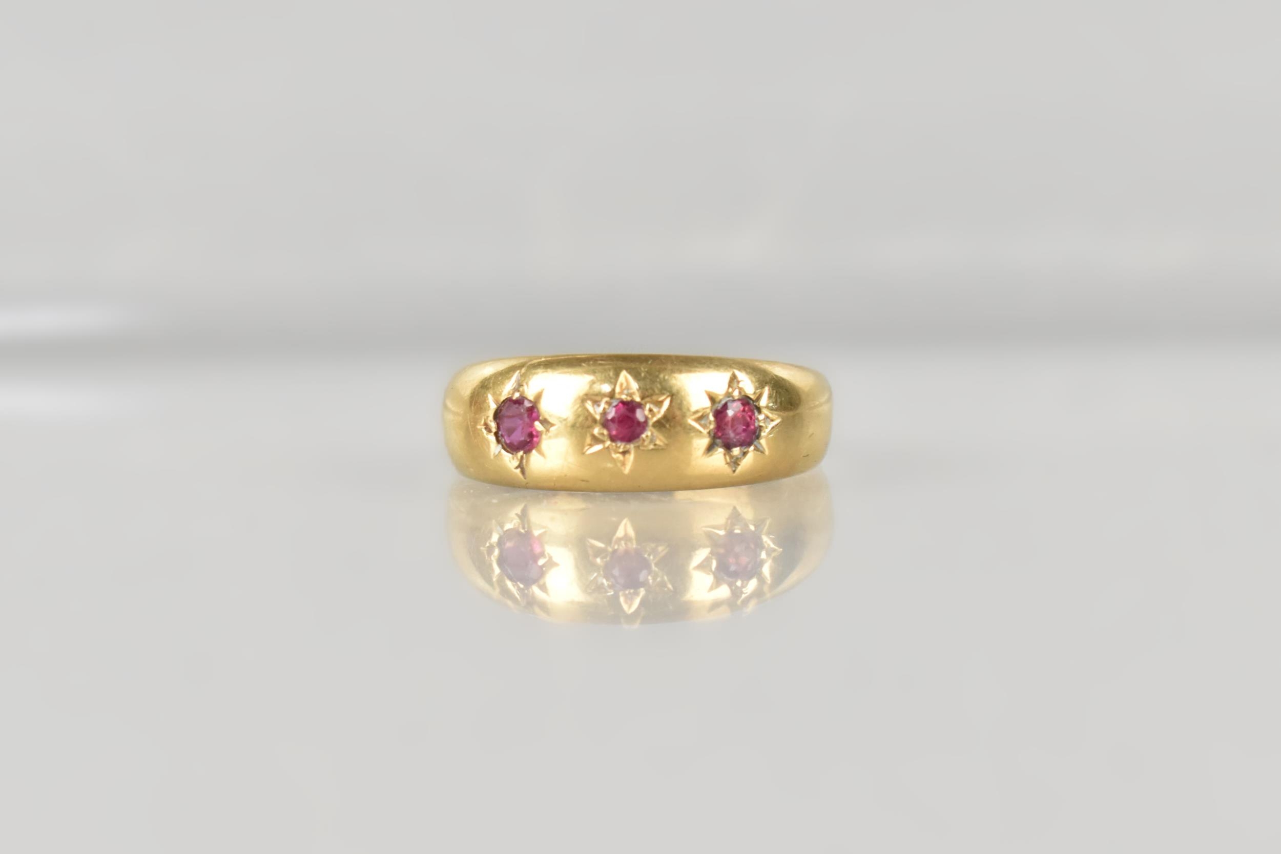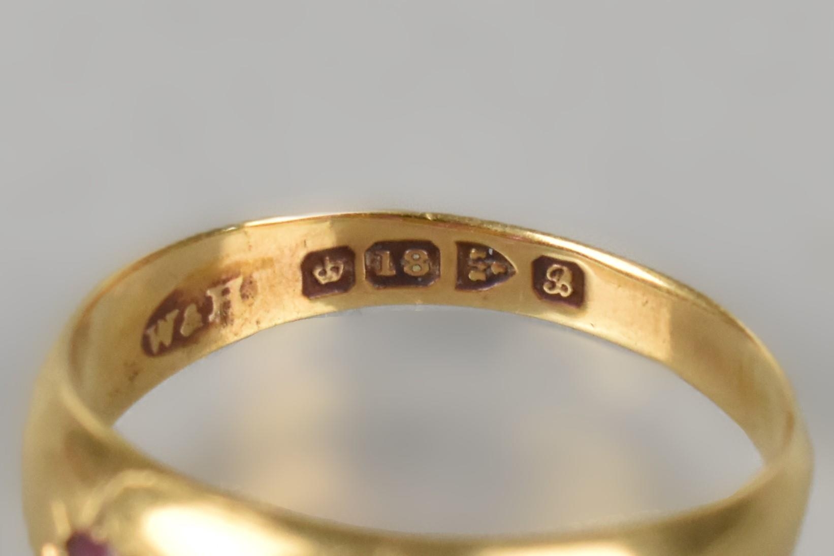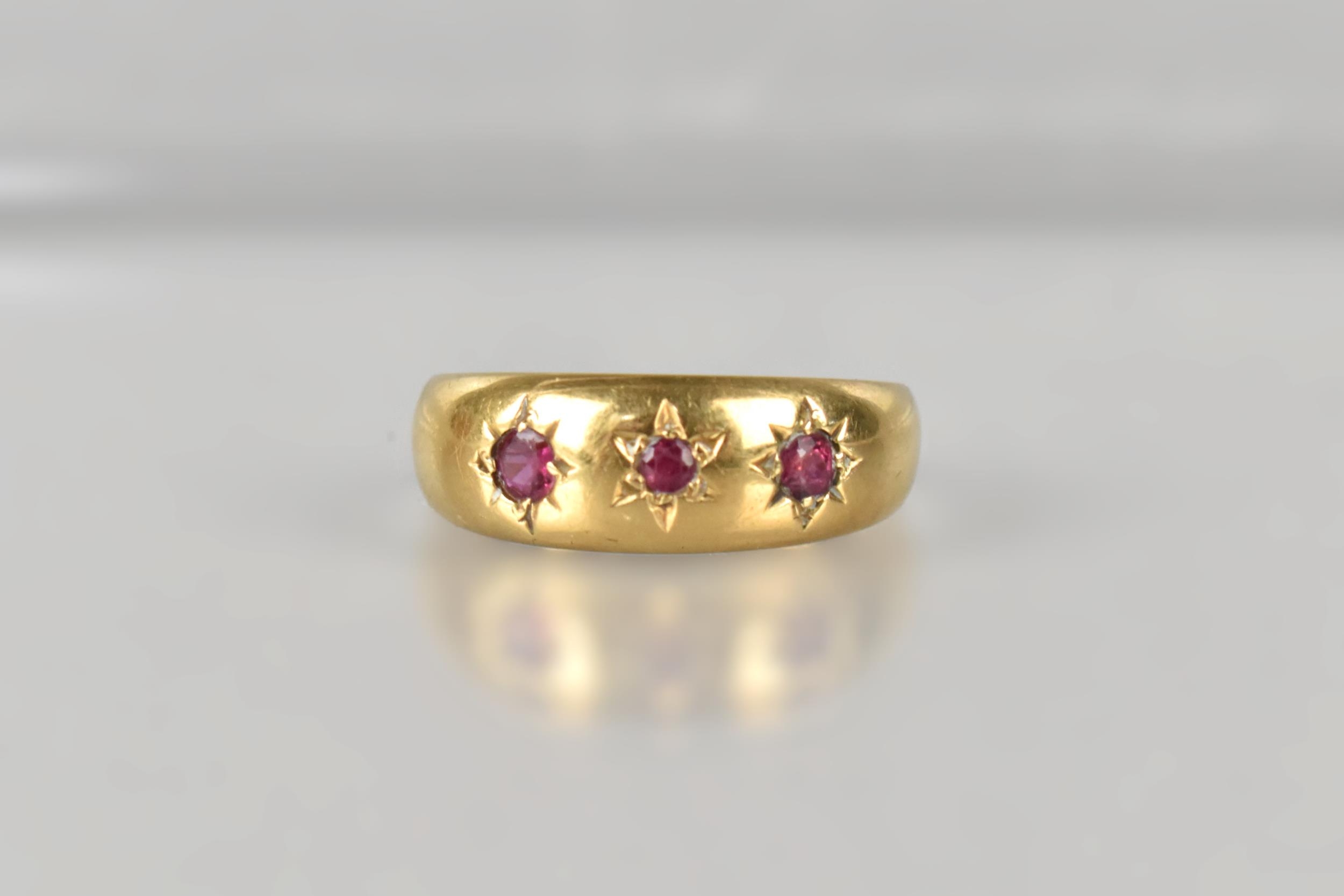 An Edwardian 18ct Gold and Ruby Gypsy Ring, Grain Set Round Cut Matched Stones, Largest Measuring 1.8mm Diameter, polished D Shape Band Stamped to the Interior for Chester 1902, and with Makers Mark Rubbed, Size M, 2.4gms