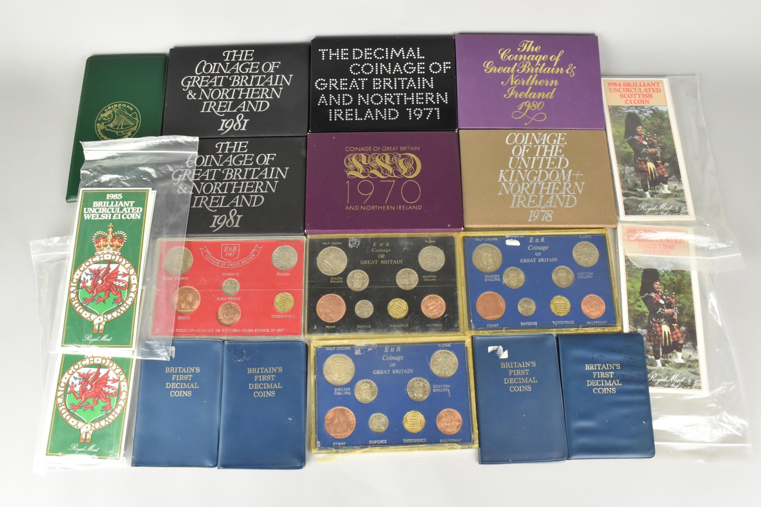 A Collection of Great Britain & Northern Ireland Coin Set to Include 1970, 1971, 1978, 1980, 1981x2, Together with Further Coin Set to Include 2x Brilliant Uncirculated Scottish £1 Coin Sets, 2x Brilliant Uncirculated Welsh £1 Coin Set, 4x Britain's First Decimal Coin Sets, 1971 Irelands Decimal Coin Set and Four Further Elizabeth II Cased Examples