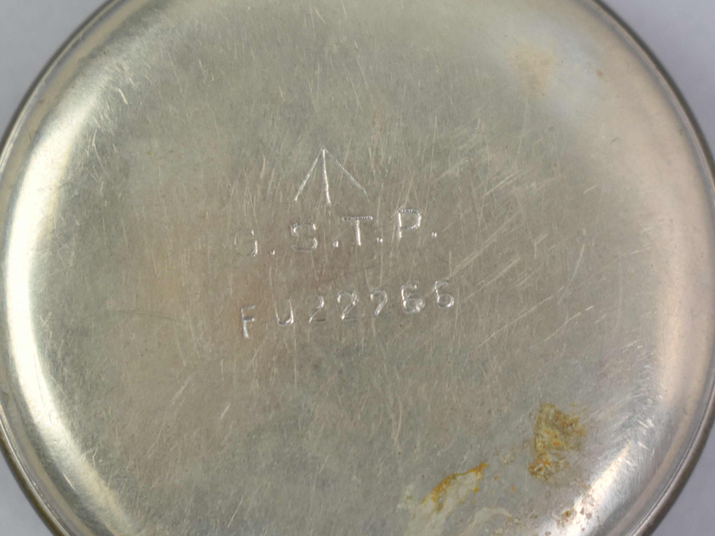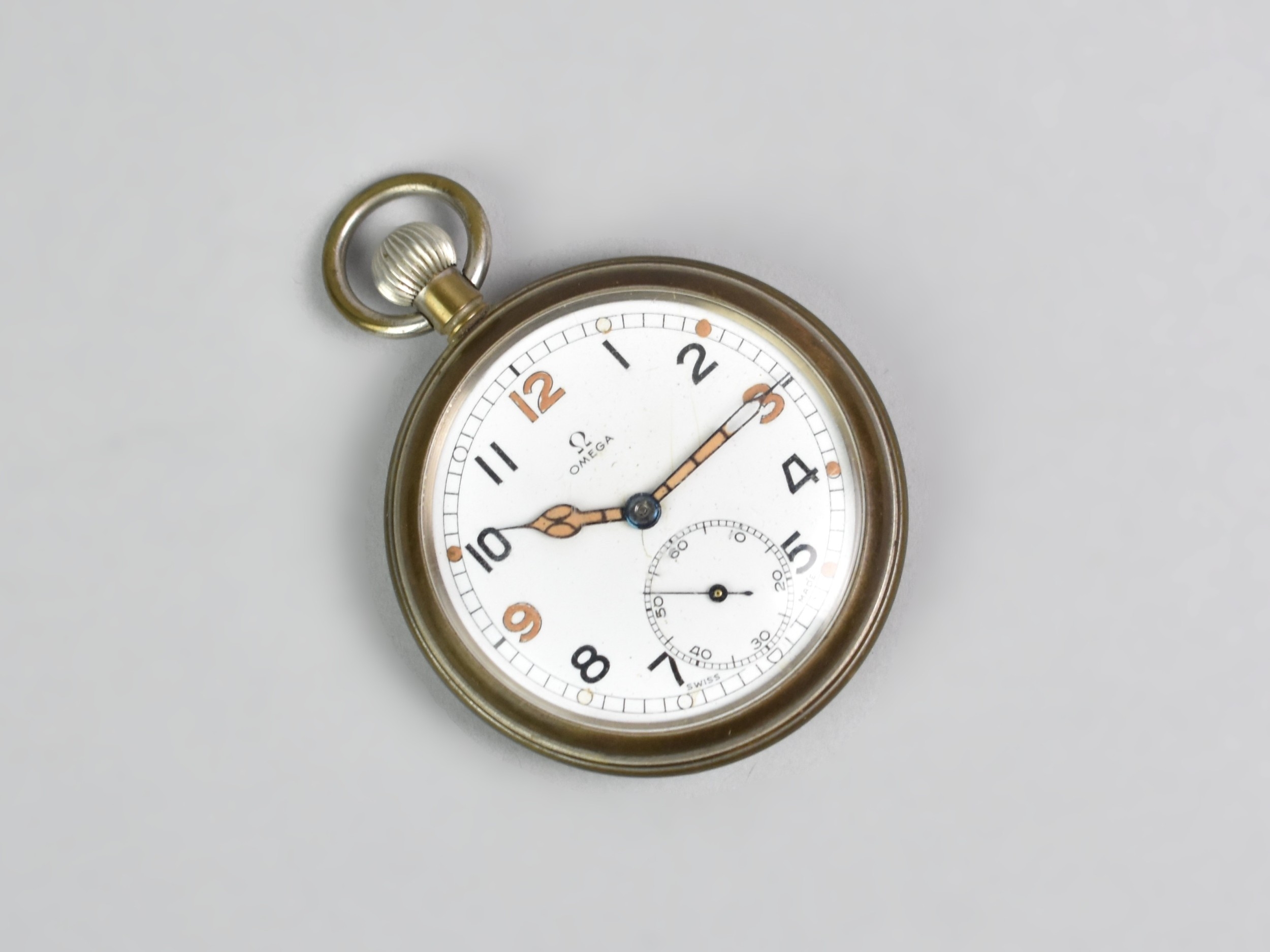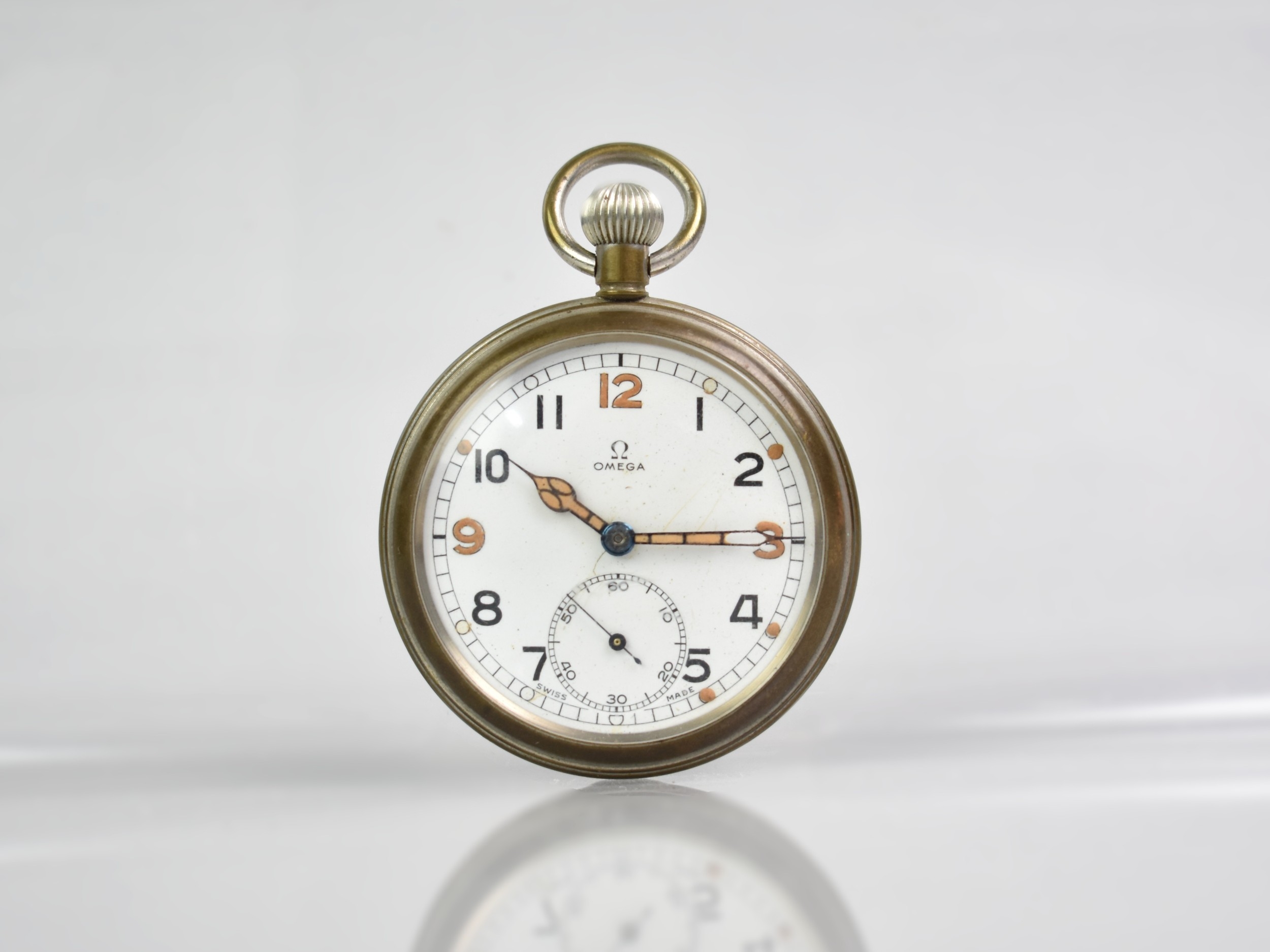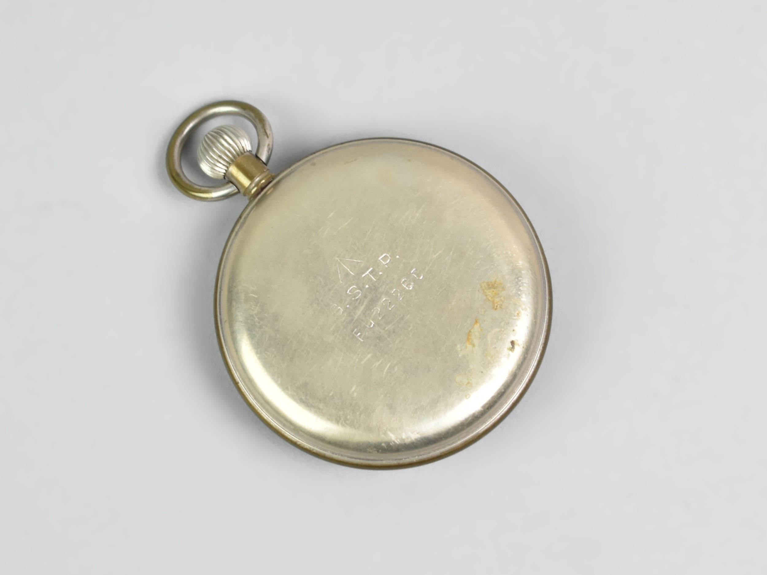 A Military Issue WWII Period Nickel Cased Omega Pocket Watch, White Enameled Fase with Red and Black Arabic Numerals and Subsidiary Dial at 6 o'Clock, Outer Minute Chapter Ring, Stamped to Back with Broad Arrow and GSTP for 'General Service Time Piece', Interior having 15 Jewel Movement Numbered 9979903 and Signed, Case Numbered 1140 to the Interior, 51.8mm Wide