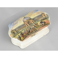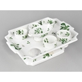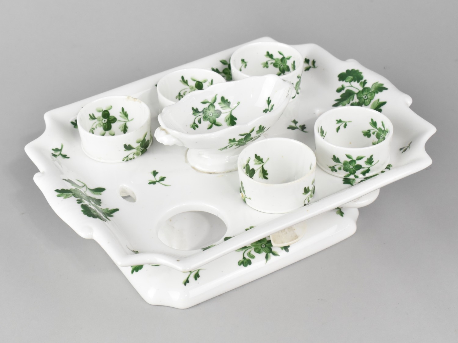 A 19th Century English Porcelain Egg Cruet Comprising Stand Incorporating Salt and Five Egg Cups Decorated with Green Foliate Design (Some Condition Issues)