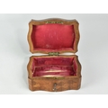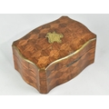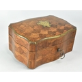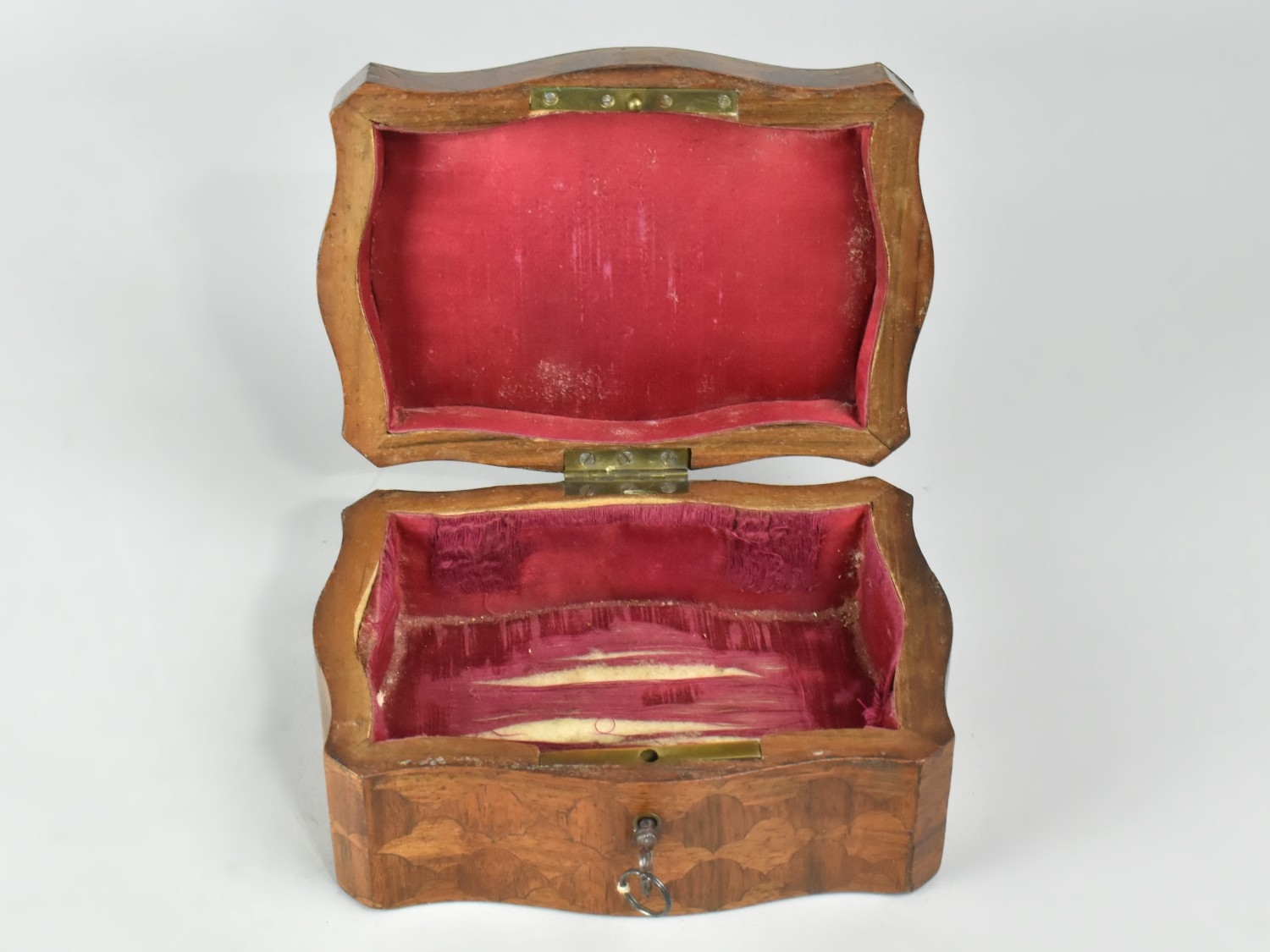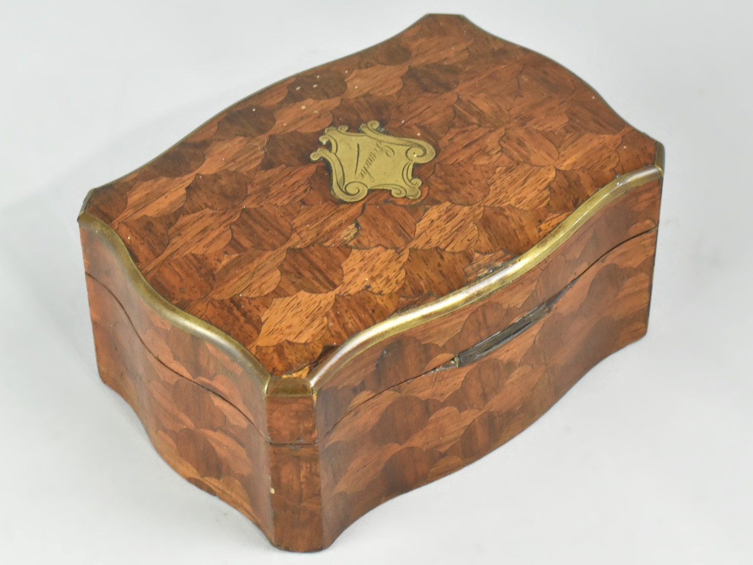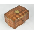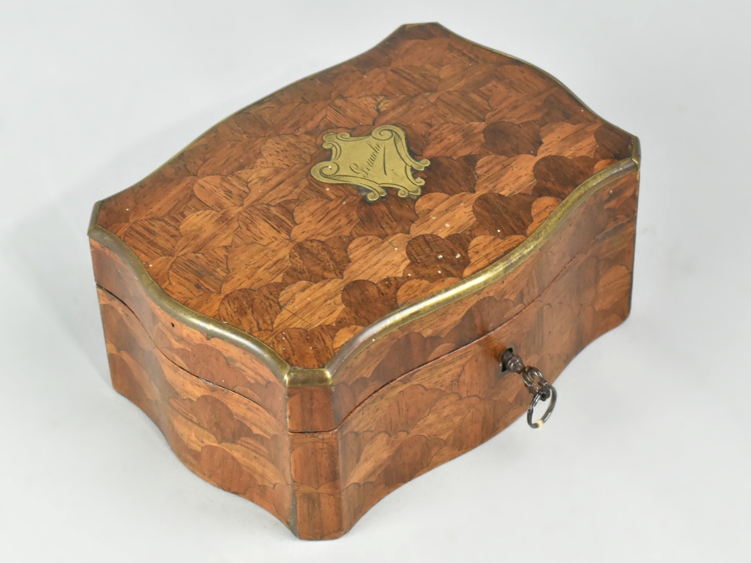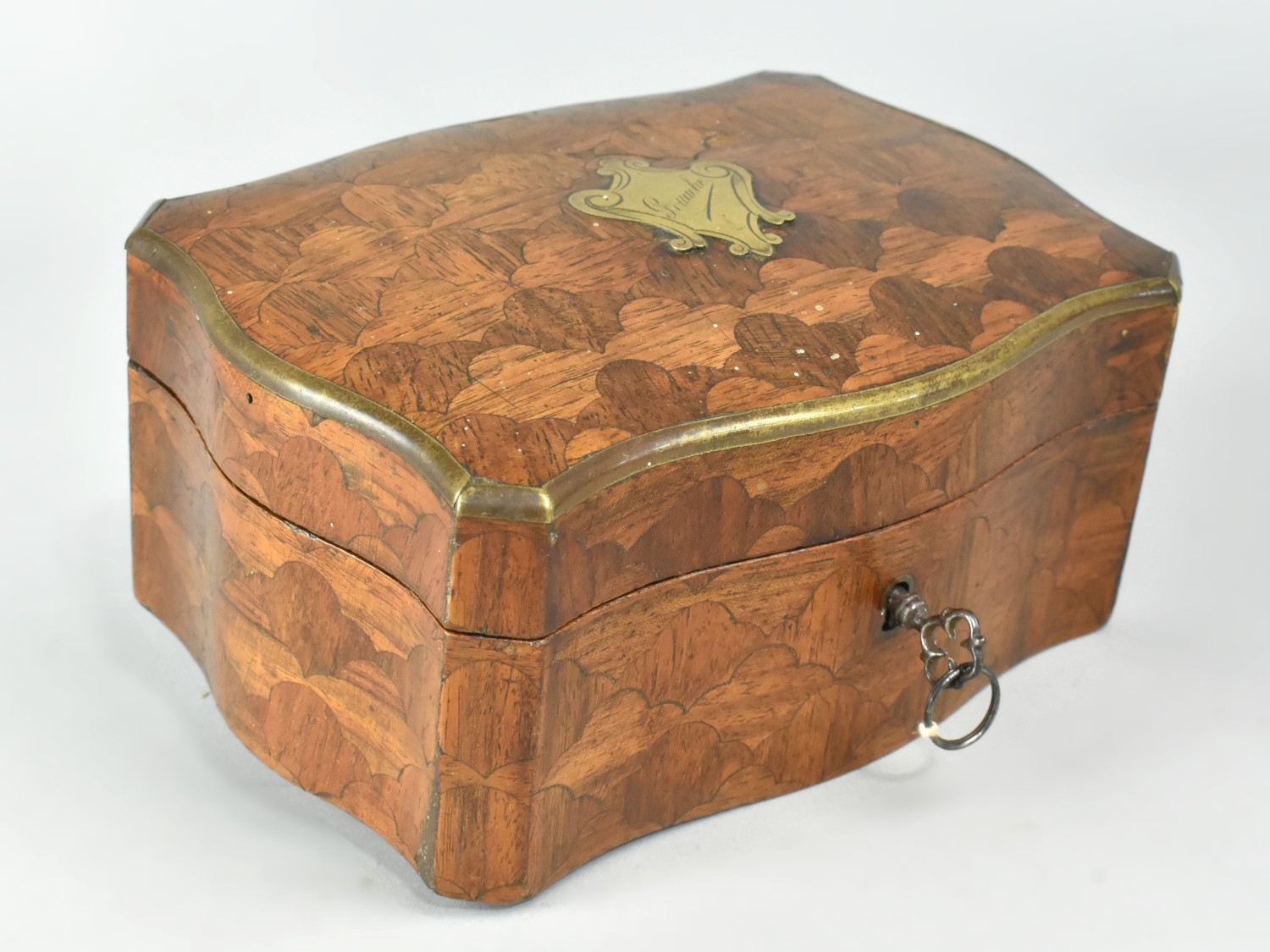 A Continental Parquetry Silk Lined Serpentine Fronted Jewellery Box with Brass Escutcheon inscribed Gouache, with Key. 15cms Wide