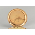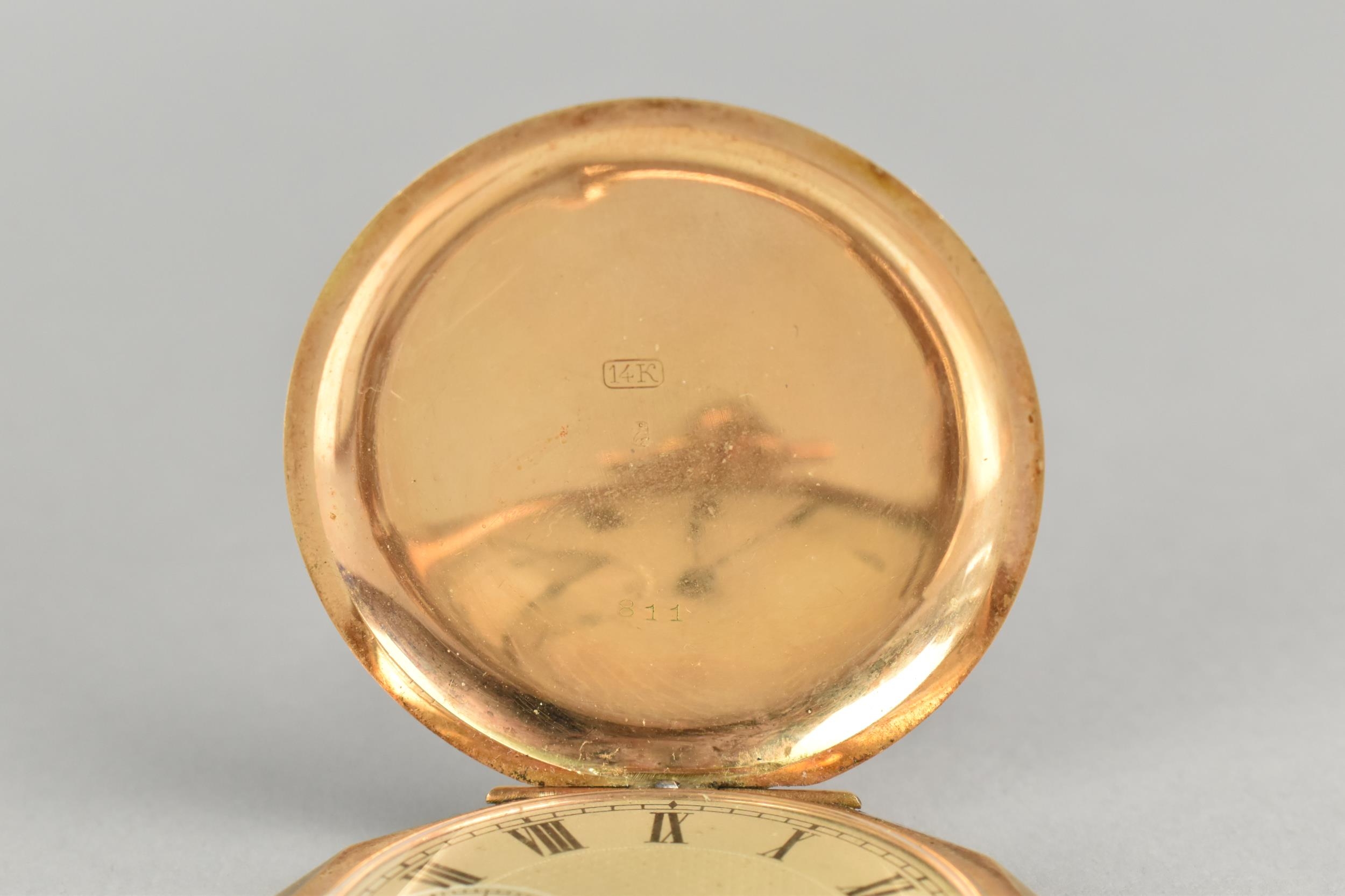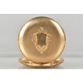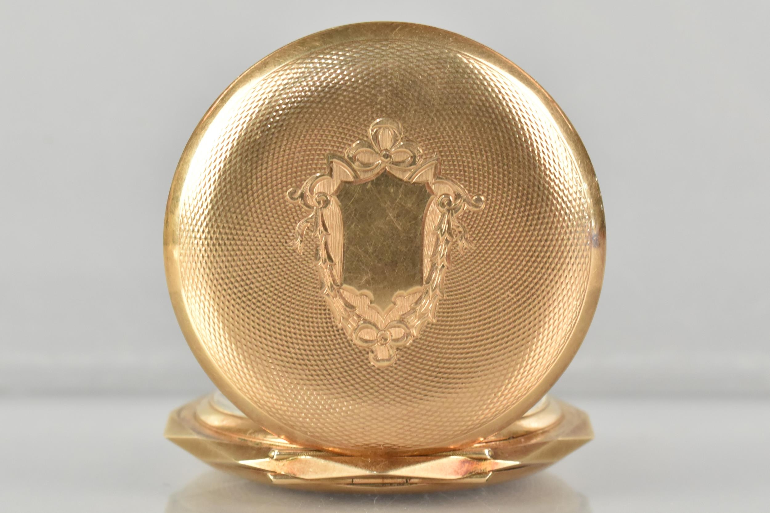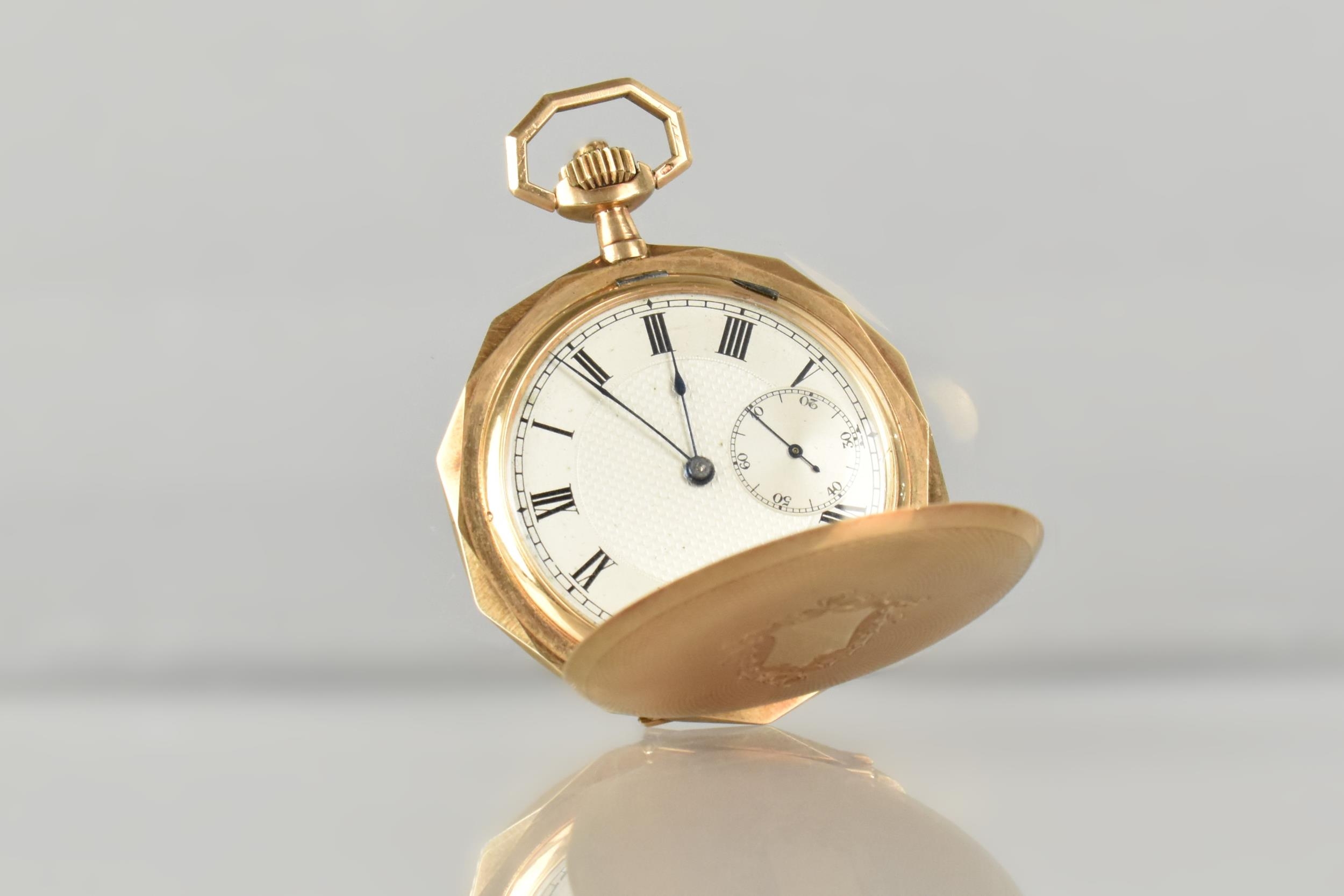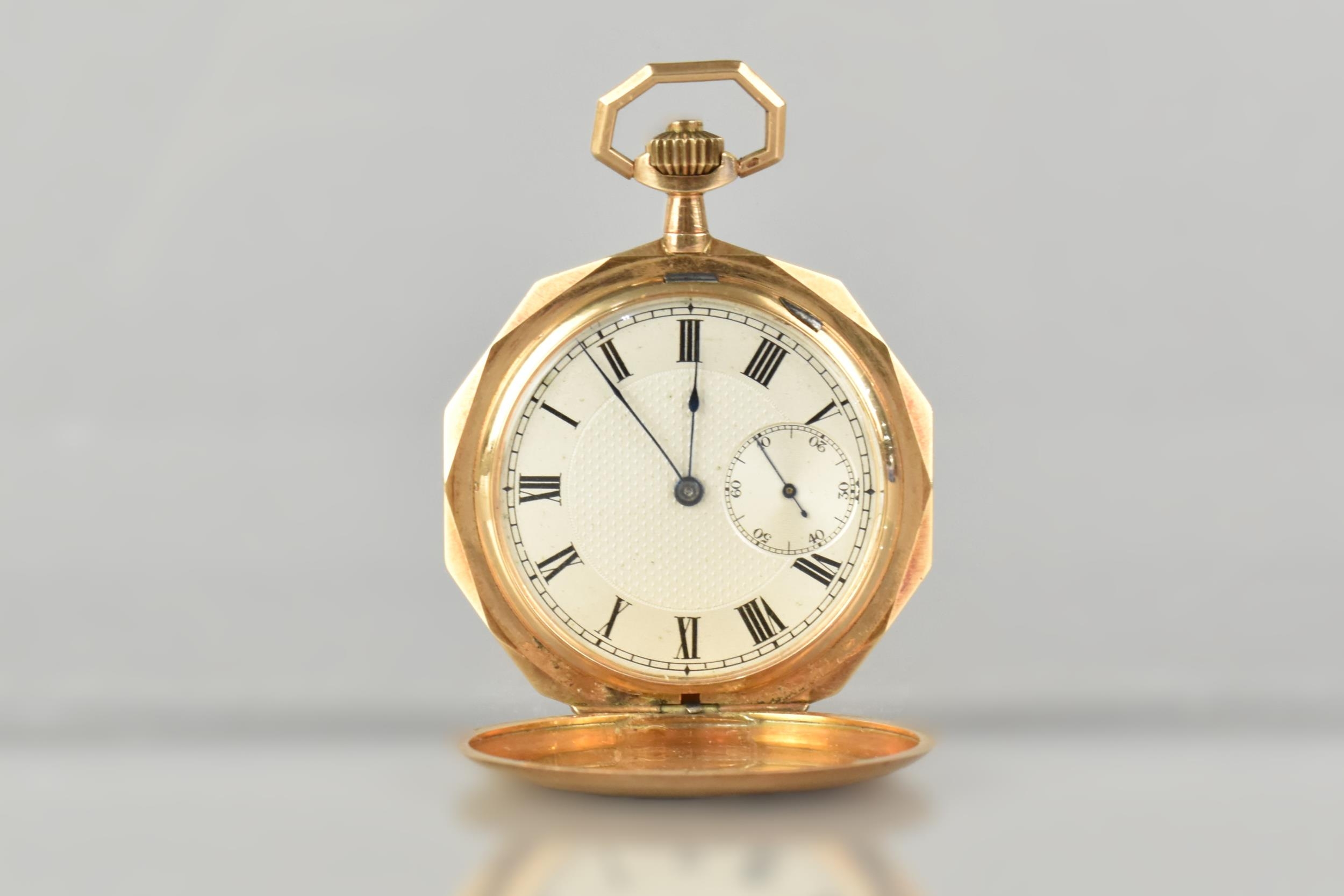 A 14ct Gold Cased Swiss Full Hunter Pocket Watch, Textured Dial Measuring 39.8mm Diameter Having Black Roman Numeral Hour Indicators, Subsidiary Seconds Dial at 6 O'Clock, Blue Spade Hands, Cuvette Inscribed 'Seneta Ancre Ligne Droite Levees Visibles Double Plateau, Spiral Breguet 15 Rubis', Ten Sided Case with Engine Turned Decoration and Blank Shield Shaped Cartouche To Front with Scrolling Decoration to Frame, 52.1mm Wide, Interior with Swiss Hallmark and Stamped 14k, 72.1gms, Currently Ticking