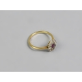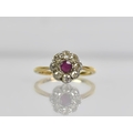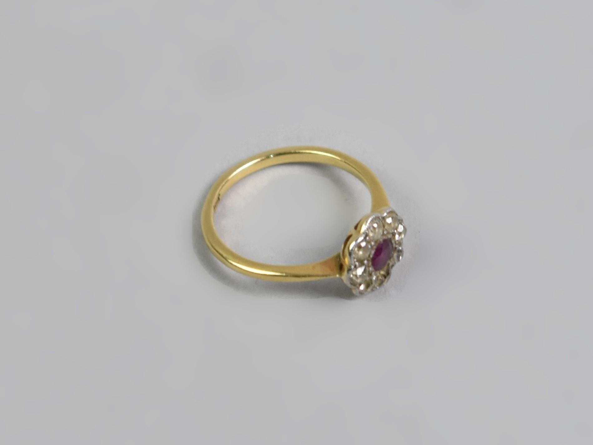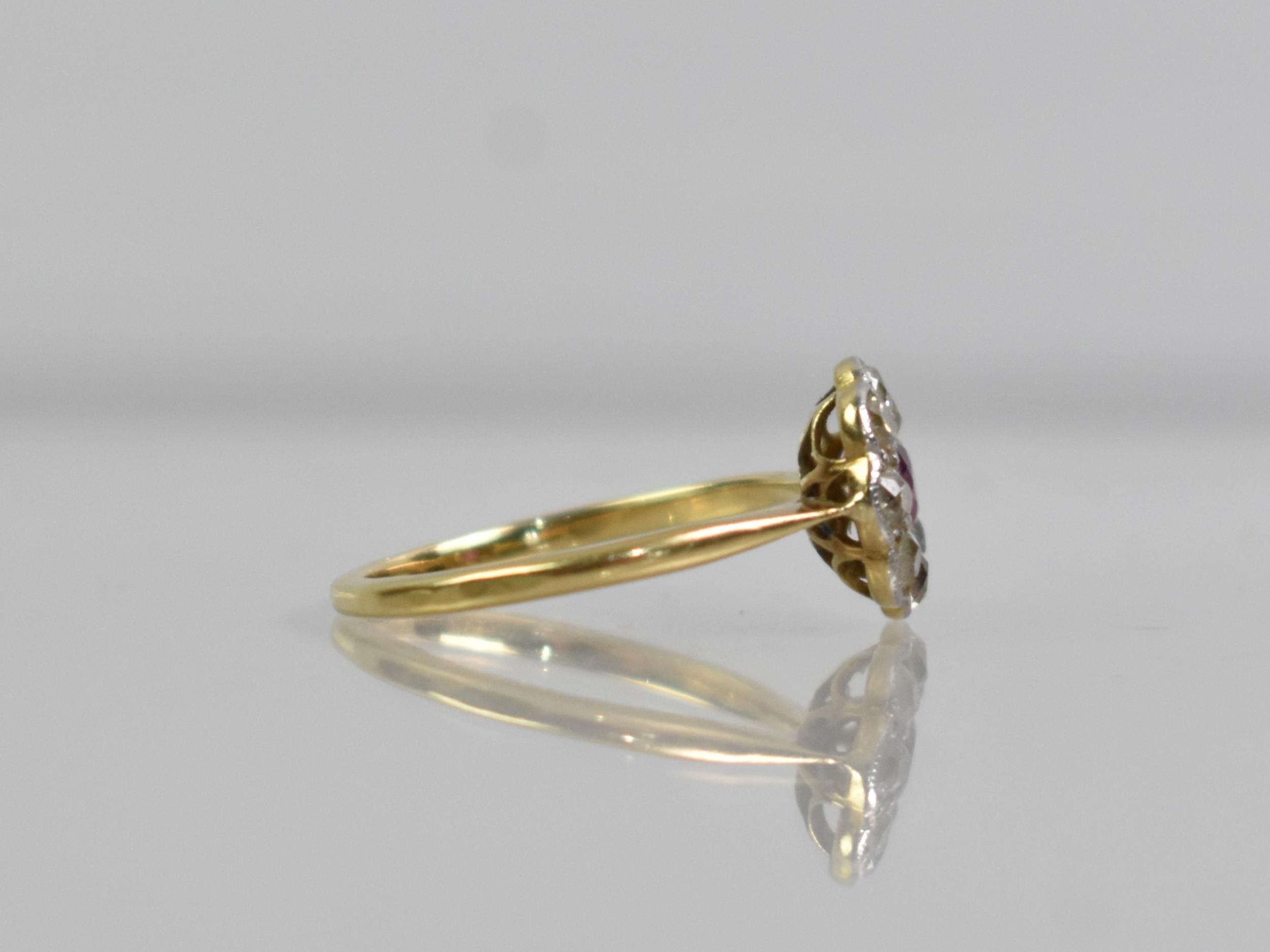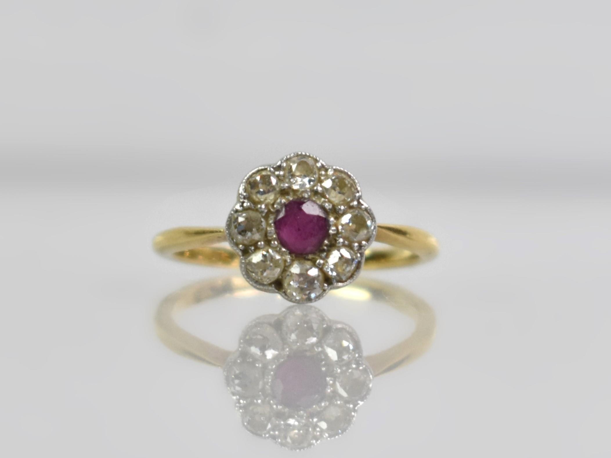 An 18ct Gold, Platinum, Ruby and Diamond Daisy Ring, Old European Cut Ruby Measuring 3.1mm by 3.5mm and Flanked by Similar Cut Diamonds, Each Approx 1.8mm Diameter (Varying), All in Milgrain White Metal Mounts, Head Measuring 10mm Diameter and Upon Tapered Shoulders to a Polished D Shape Band, Stamped to the Interior 18ct, PT, 2.4gms, Size M