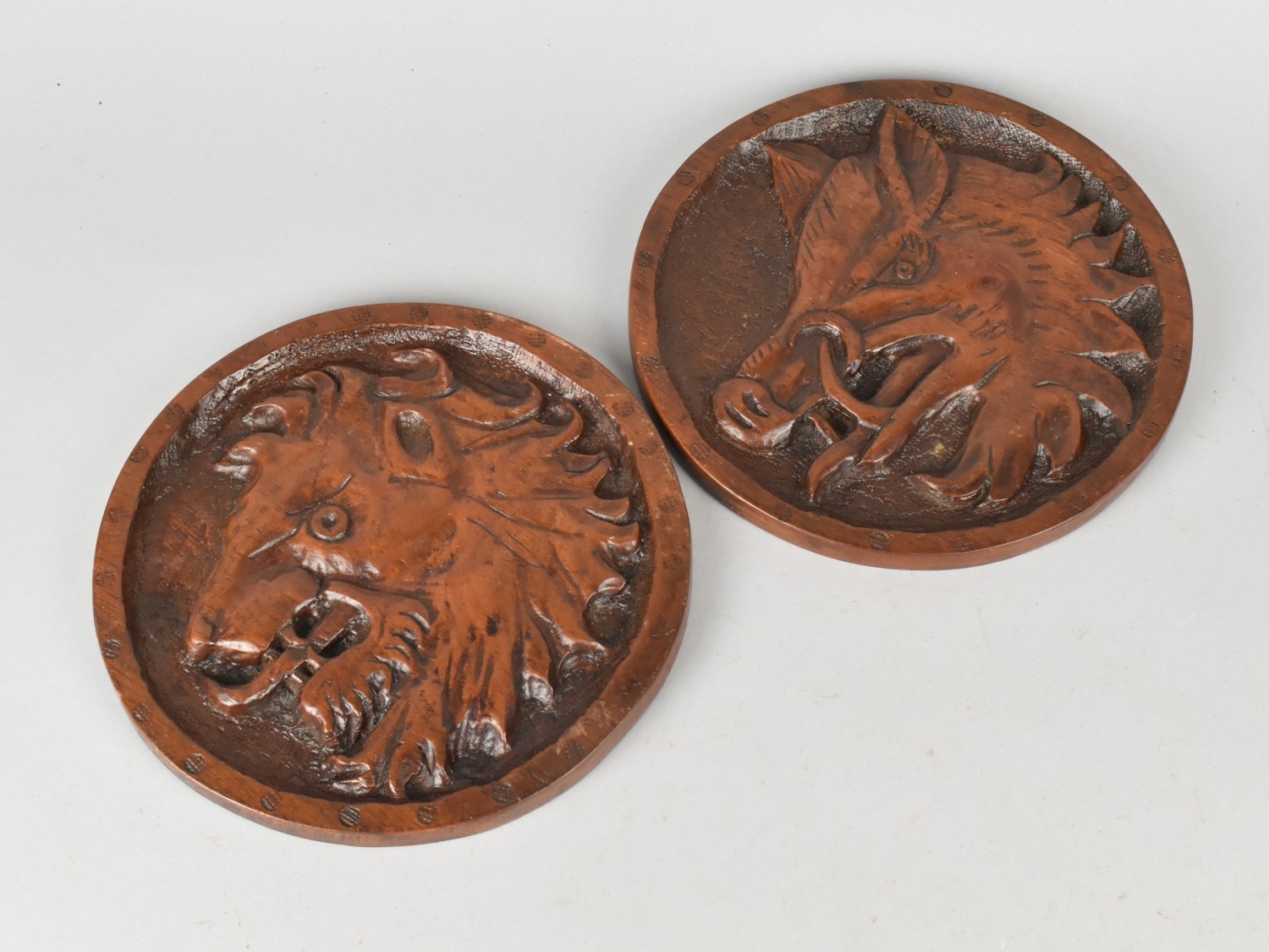 A Pair of Circular Carved Wooden Medallions Decorated with Boar and Lion, 16.5cms Diameter