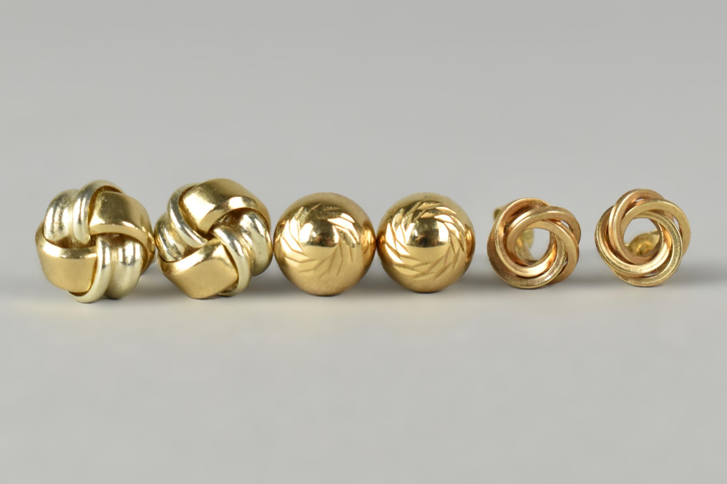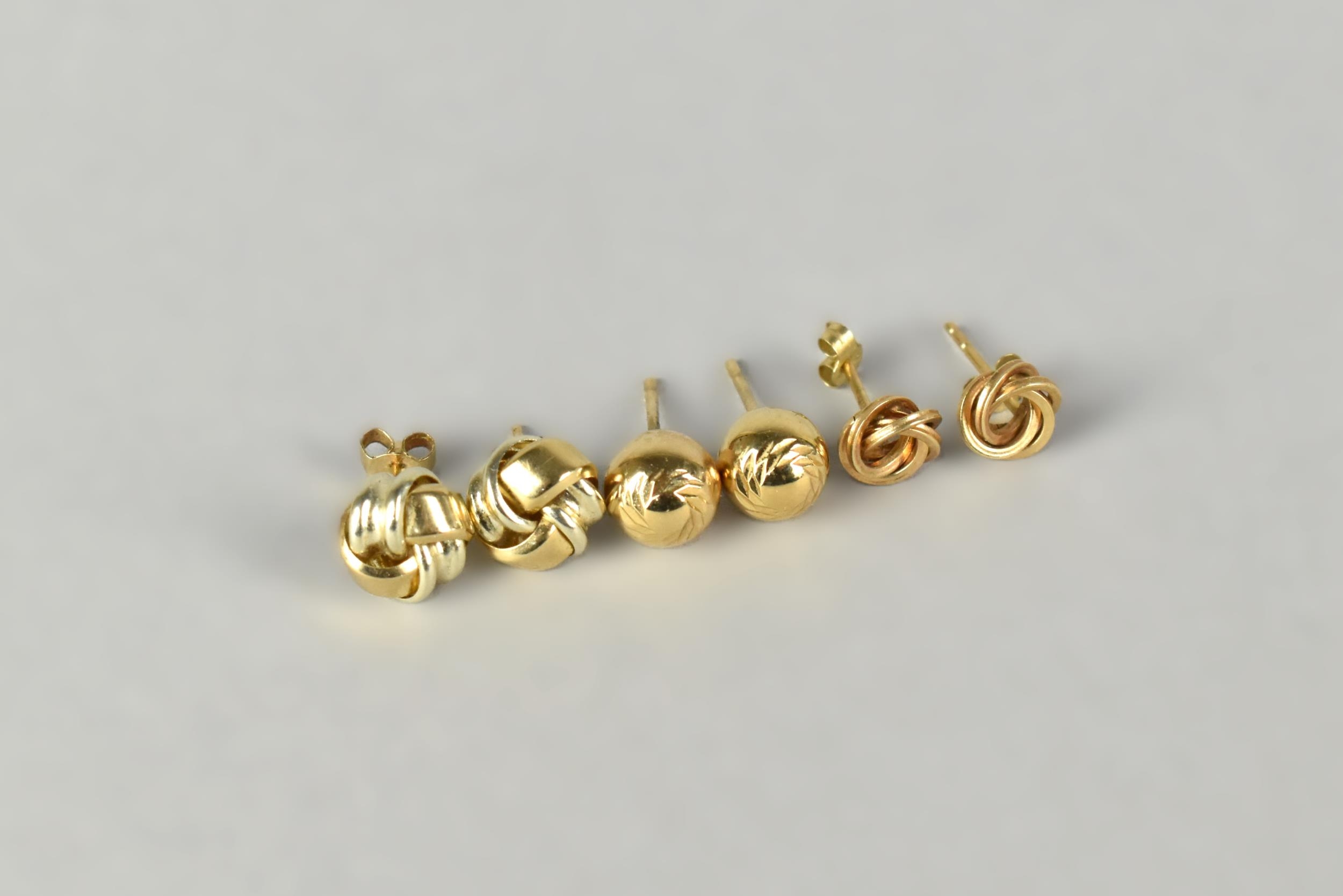 Three Pairs of 9ct Gold Earrings to Comprise Two Knot Examples and a Spherical Pair with Fluted Decoration, 2.5gms total