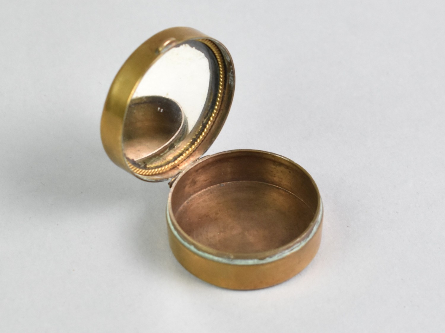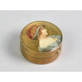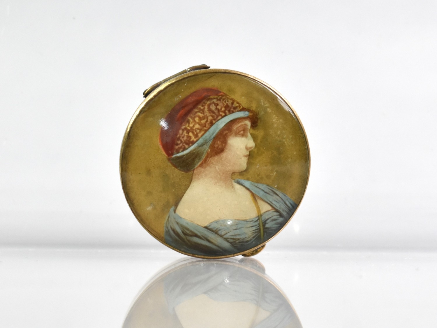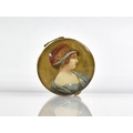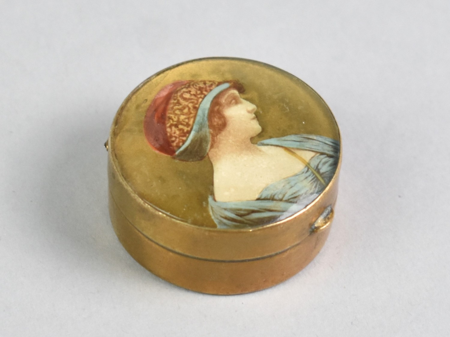 A Small Edwardian Circular Pill Box, Hinged Lid Decorated with Maiden and Having Inner Mirror, 3.5cms Diameter