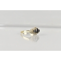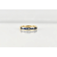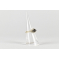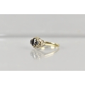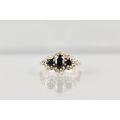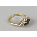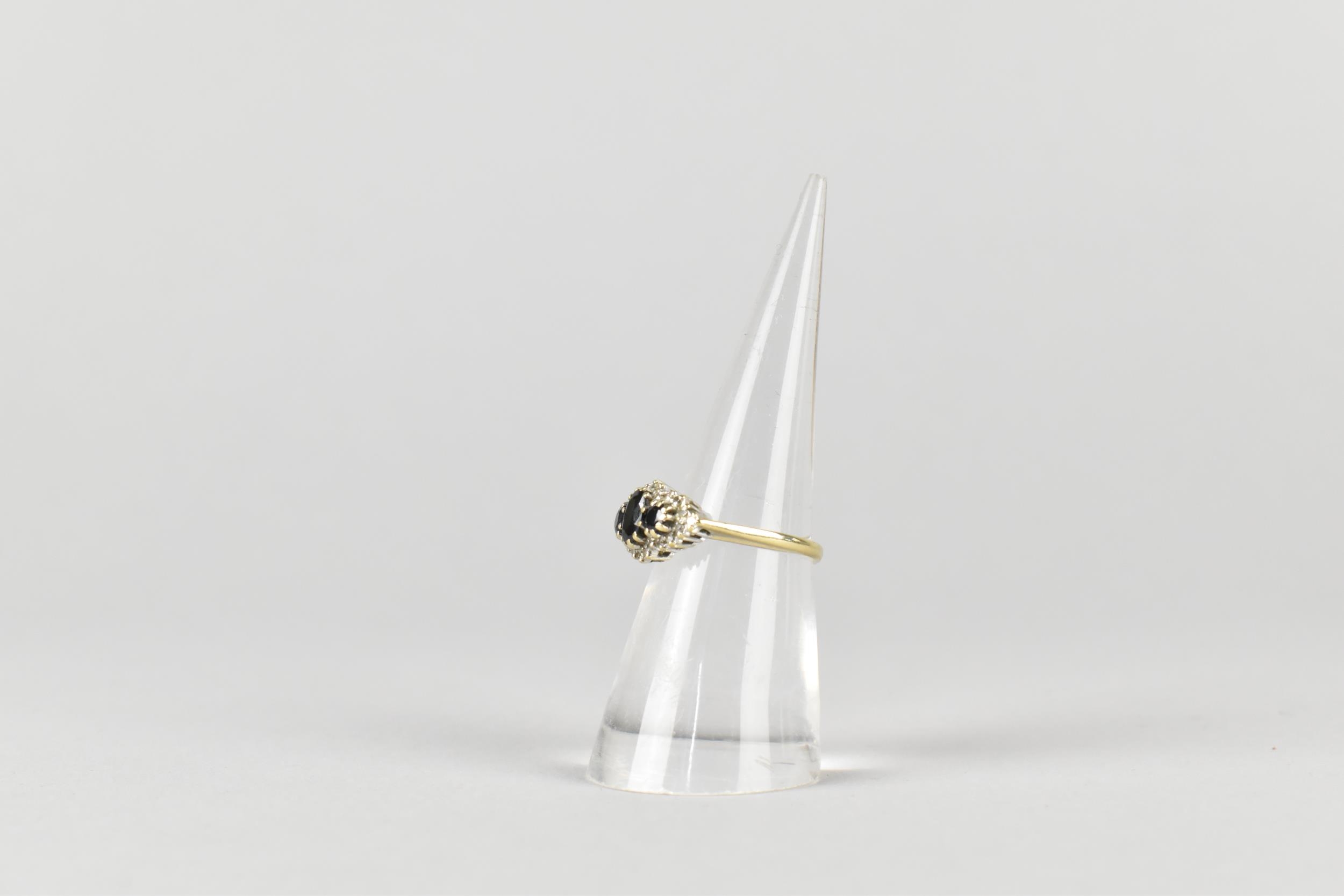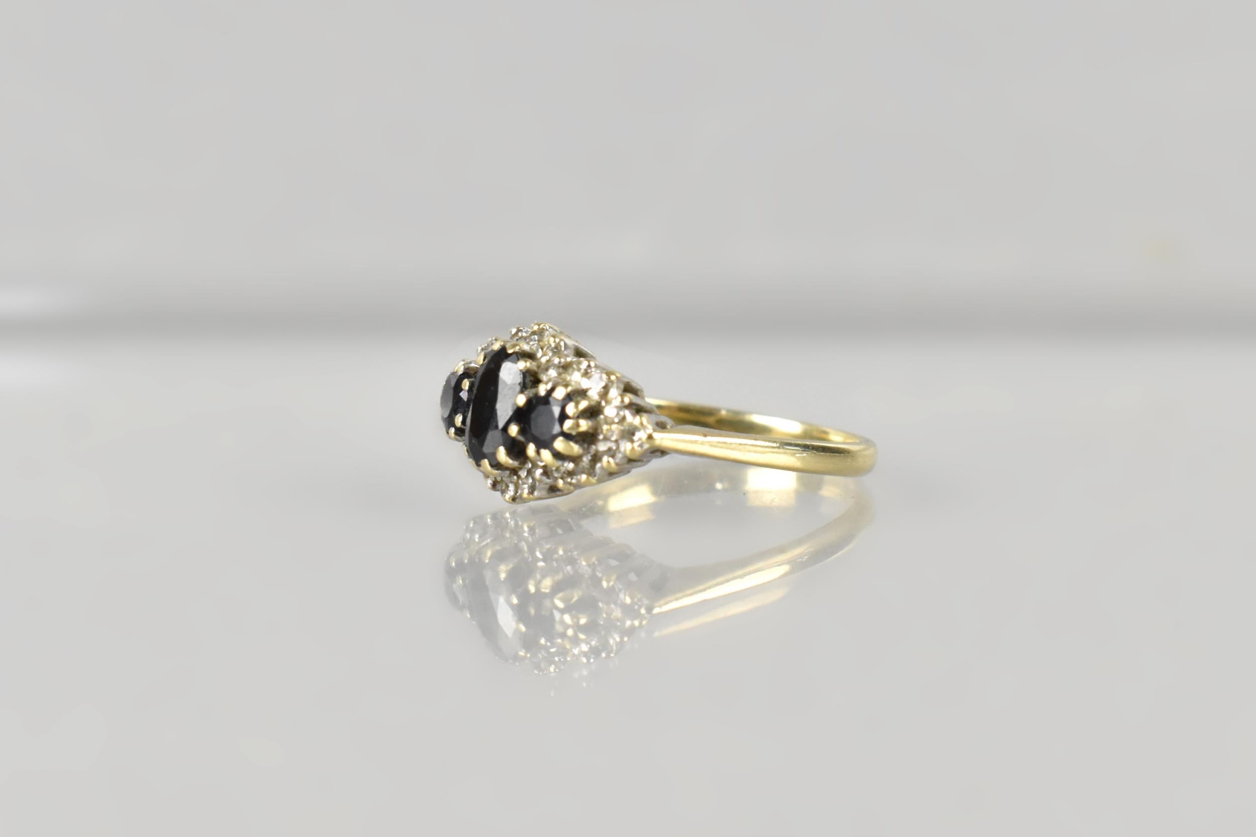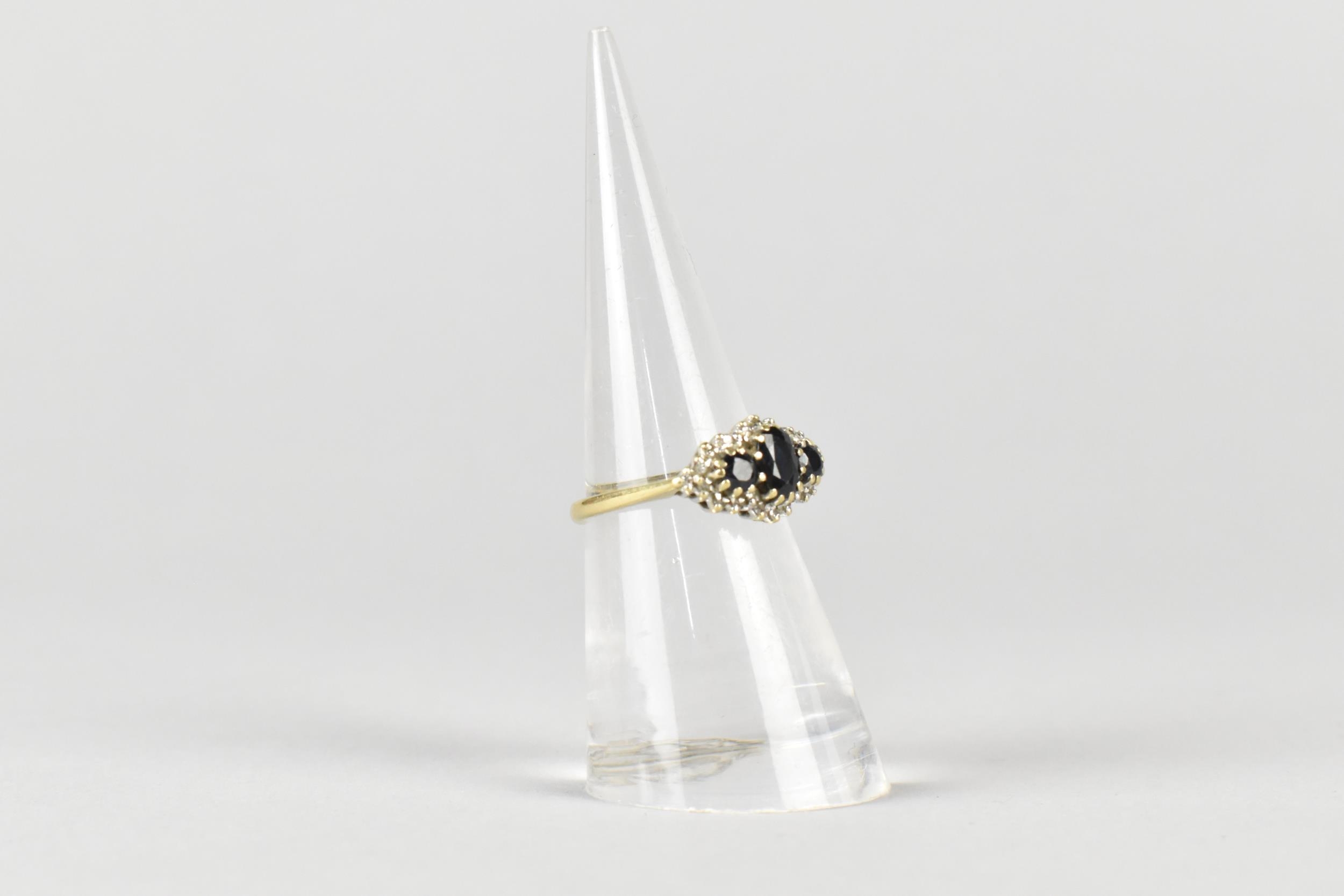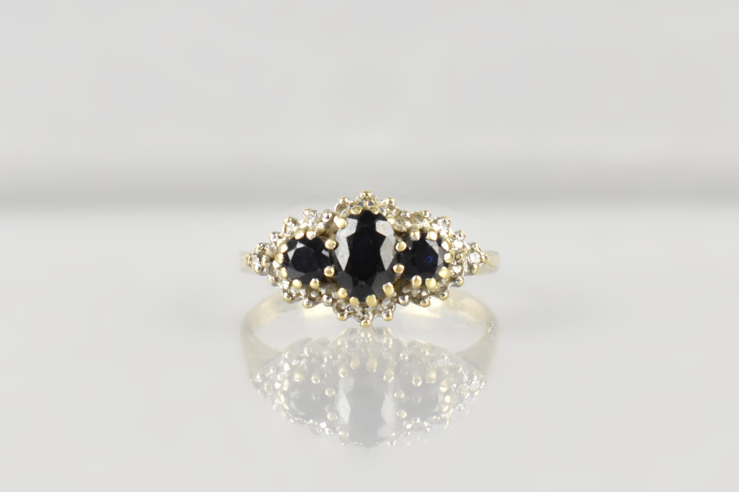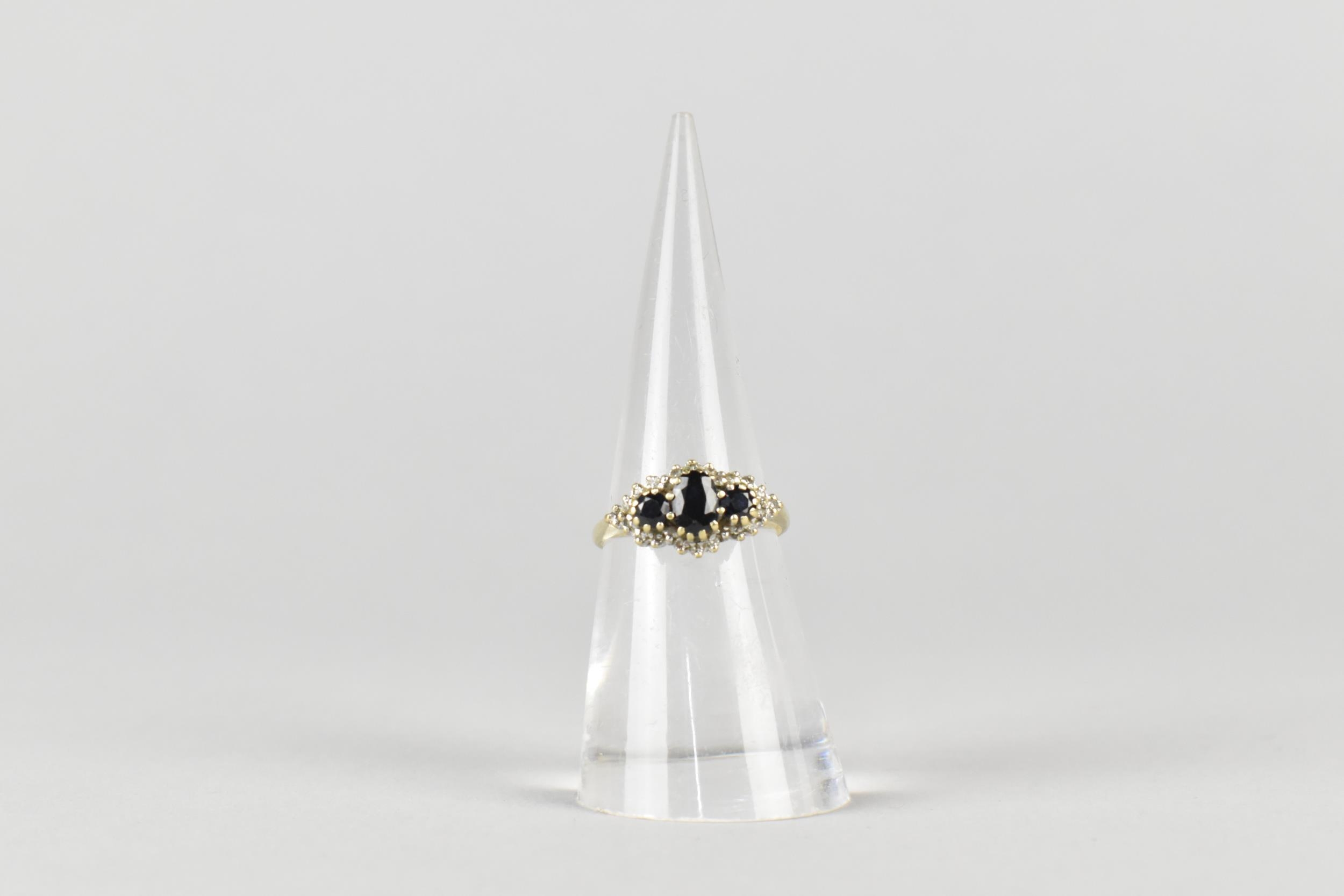 A 9ct Gold, Sapphire and Diamond Cluster Ring, Primary Oval Cut Sapphire Measuring 5.2mm by 3.5mm, Supported in Twelve Yellow Metal Claws, Flanked by Two Similarly Set Smaller Round Cut Sapphires and with a Halo of Small Round Cut Diamonds, Tapered Shoulders to a Plain Polished Band, 2.5gms, Size M, Makers Mark AT Ltd and Hallmarked for 1986