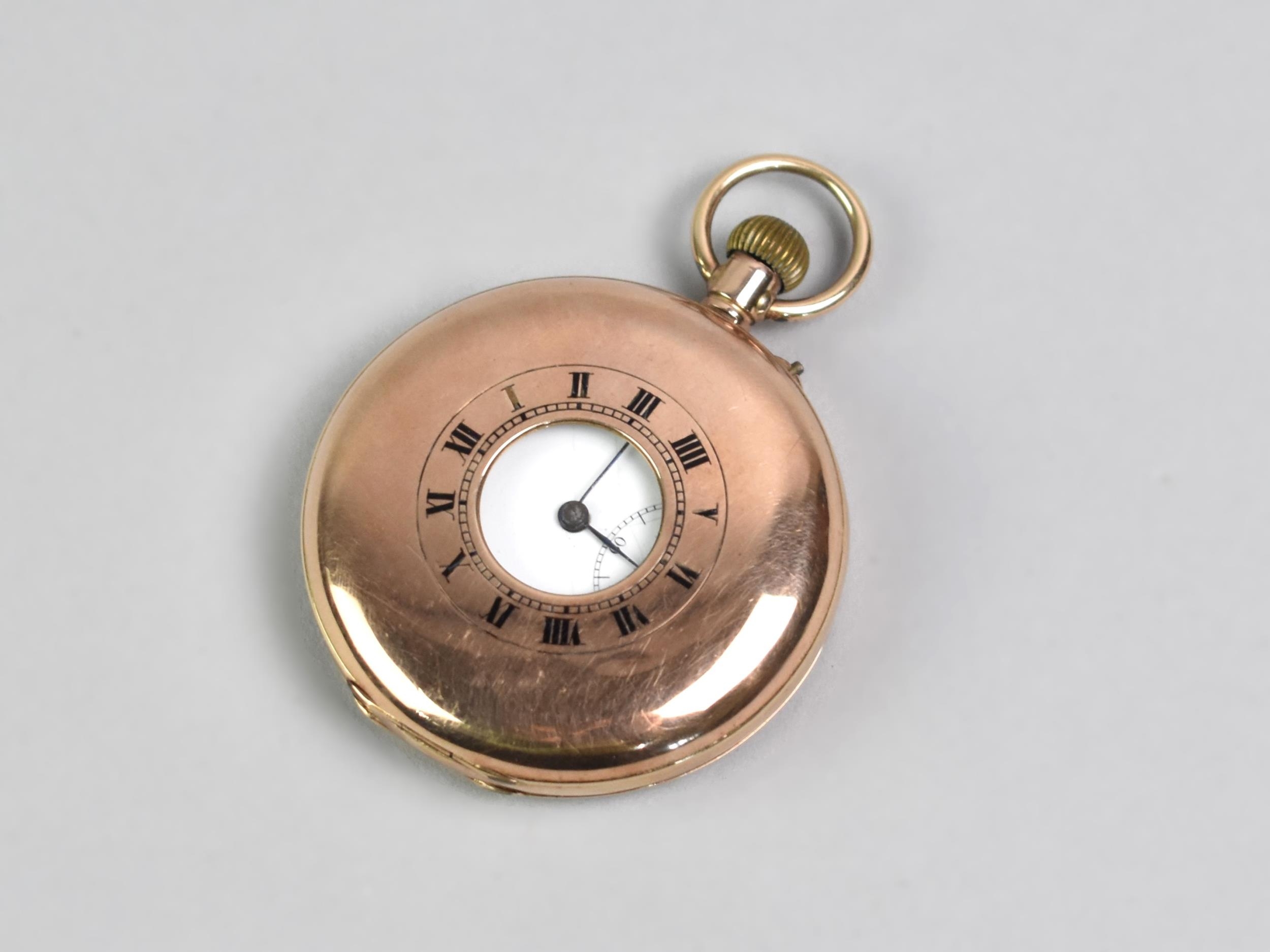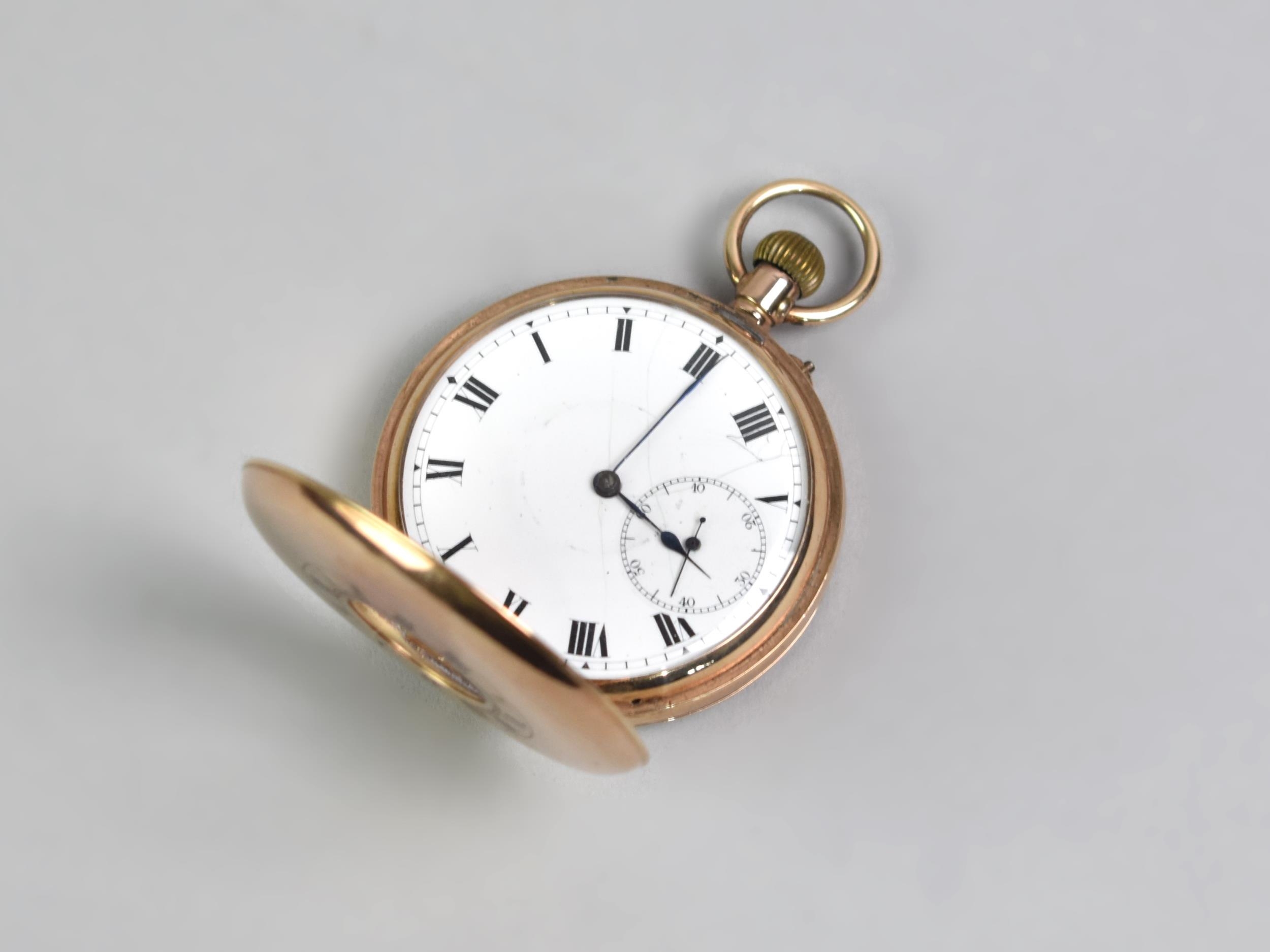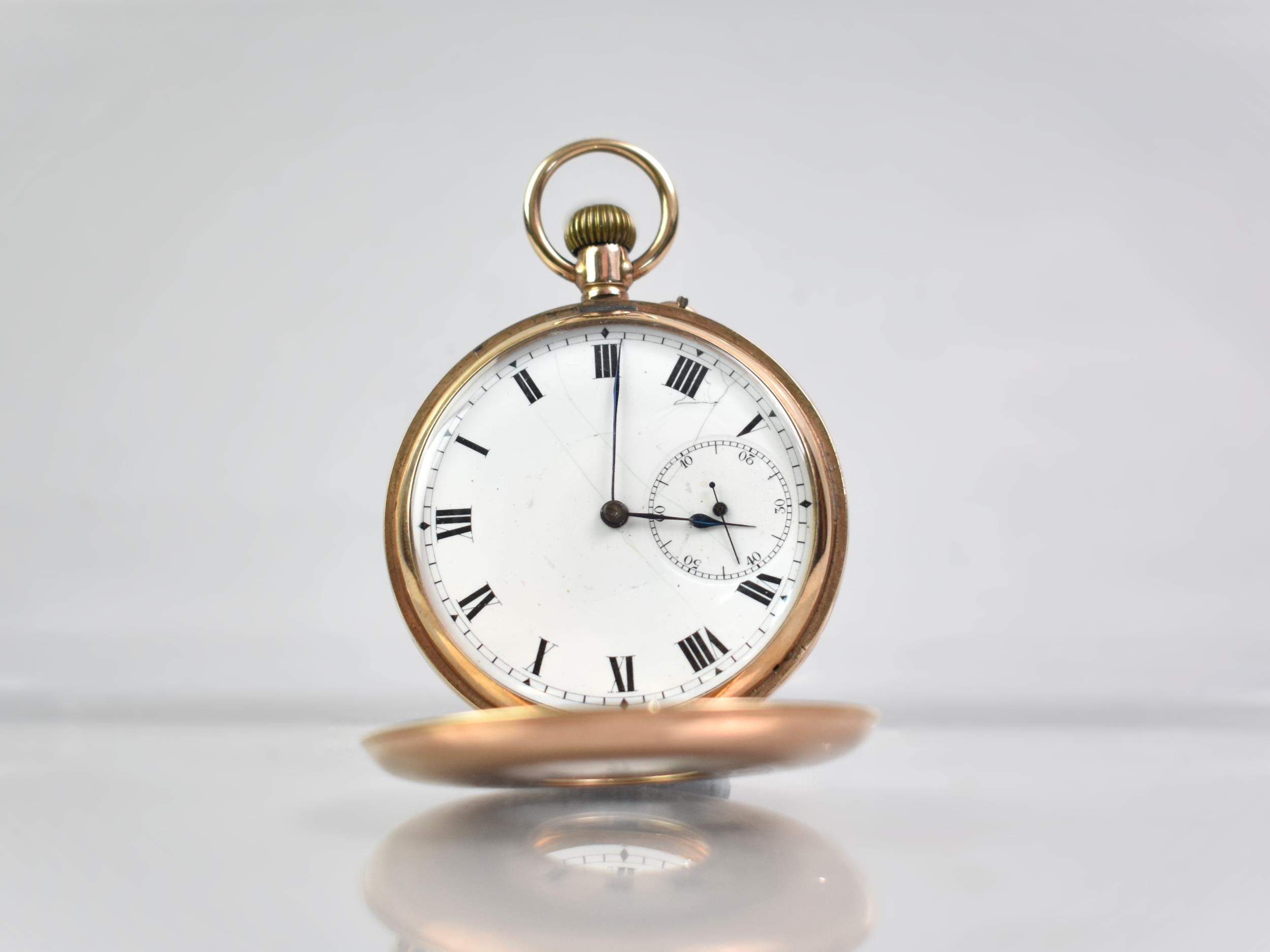 A 9ct Gold Cased Half Hunter Pocket Watch, Enamelled Face with Roman Numerals and Steel Blue Spade Hands, Subsidiary Dial at 6 O'Clock and Having Outer Chapter Ring, Case Front with Roman Numeral Enamels, Polished Back Plate, Hallmarked with London Import Mark, Rubbed, Possibly 1929, Total Weight 89.3gms, 50.1mm Wide, Currently Ticking