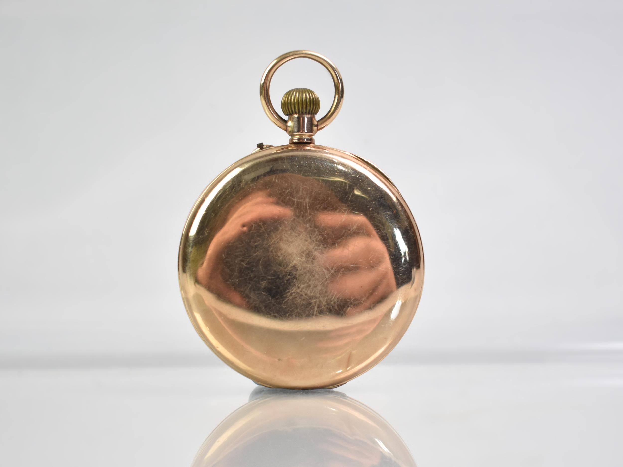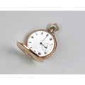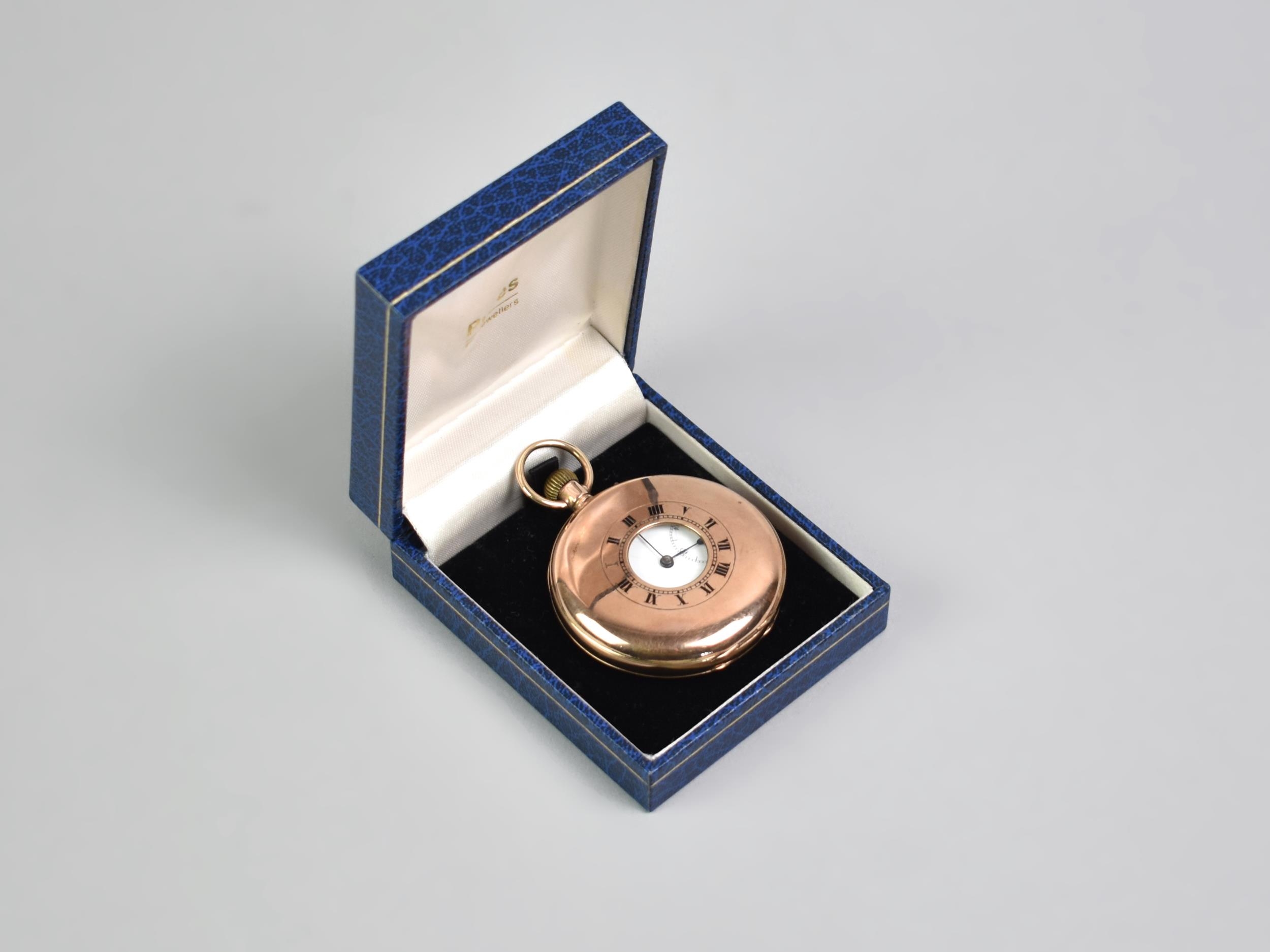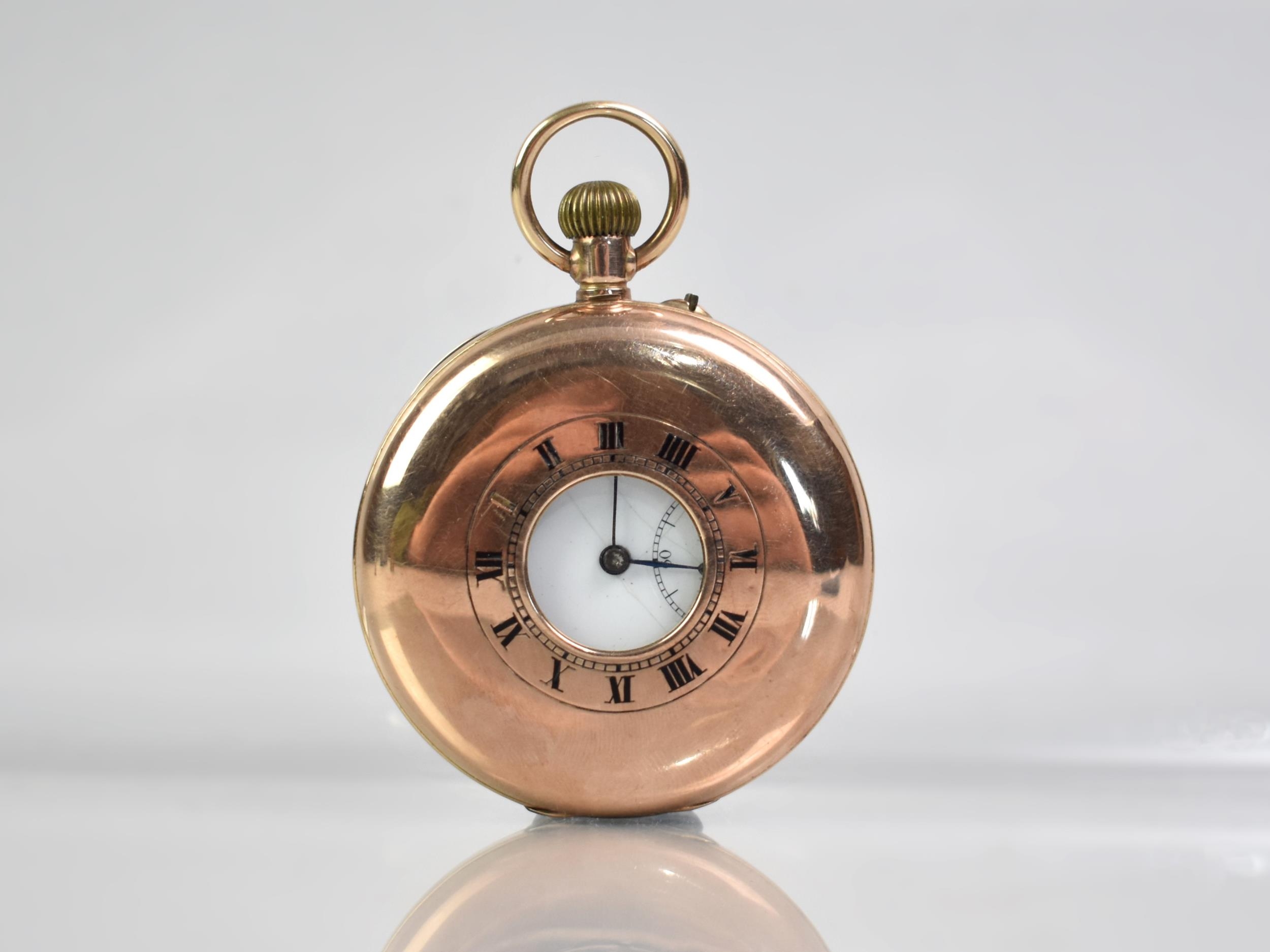 A 9ct Gold Cased Half Hunter Pocket Watch, Enamelled Face with Roman Numerals and Steel Blue Spade Hands, Subsidiary Dial at 6 O'Clock and Having Outer Chapter Ring, Case Front with Roman Numeral Enamels, Polished Back Plate, Hallmarked with London Import Mark, Rubbed, Possibly 1929, Total Weight 89.3gms, 50.1mm Wide, Currently Ticking
