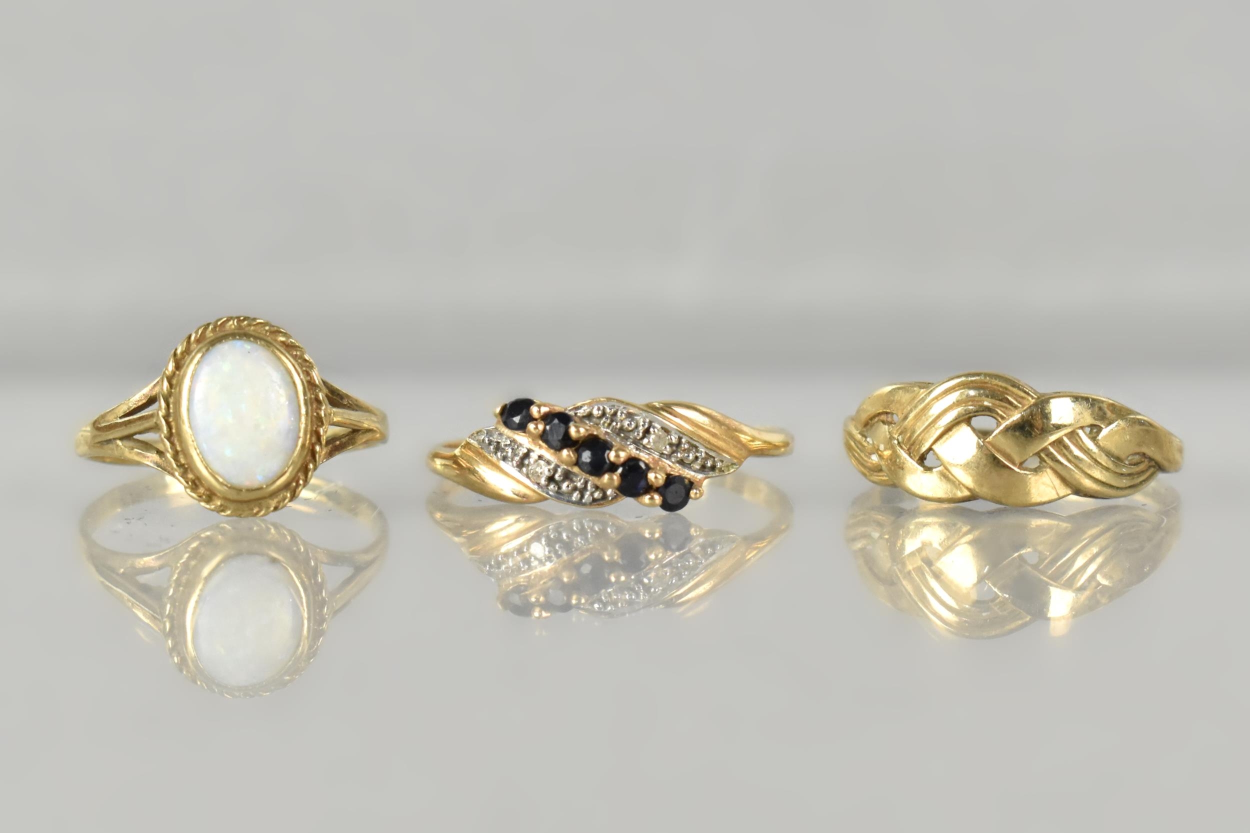 A Collection of Three 9ct Gold Rings to include Sapphire and Diamond Mounted Example, Size P, Opal Cabochon, Size I, and a Celtic Knot Ring, Size J, Total Weight 3.7gms