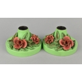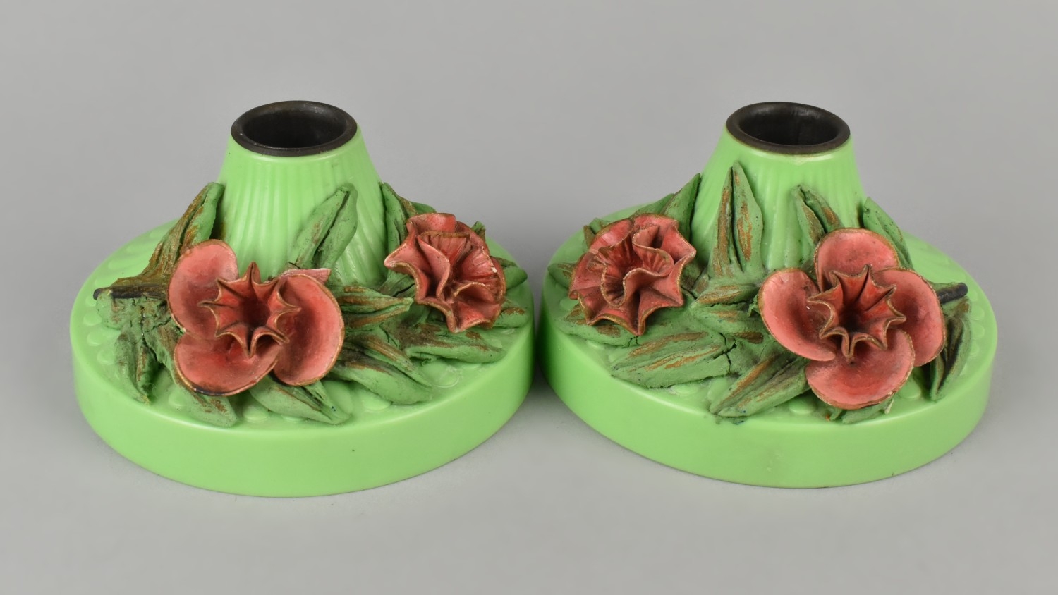 A Pair Of Vintage Coloured Bakelite Circular Candle Sticks with Moulded Floral Mounts, 11cm Diameter.