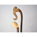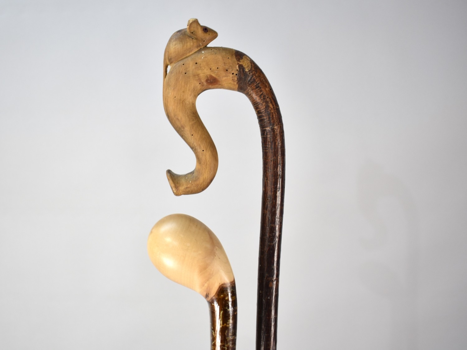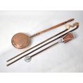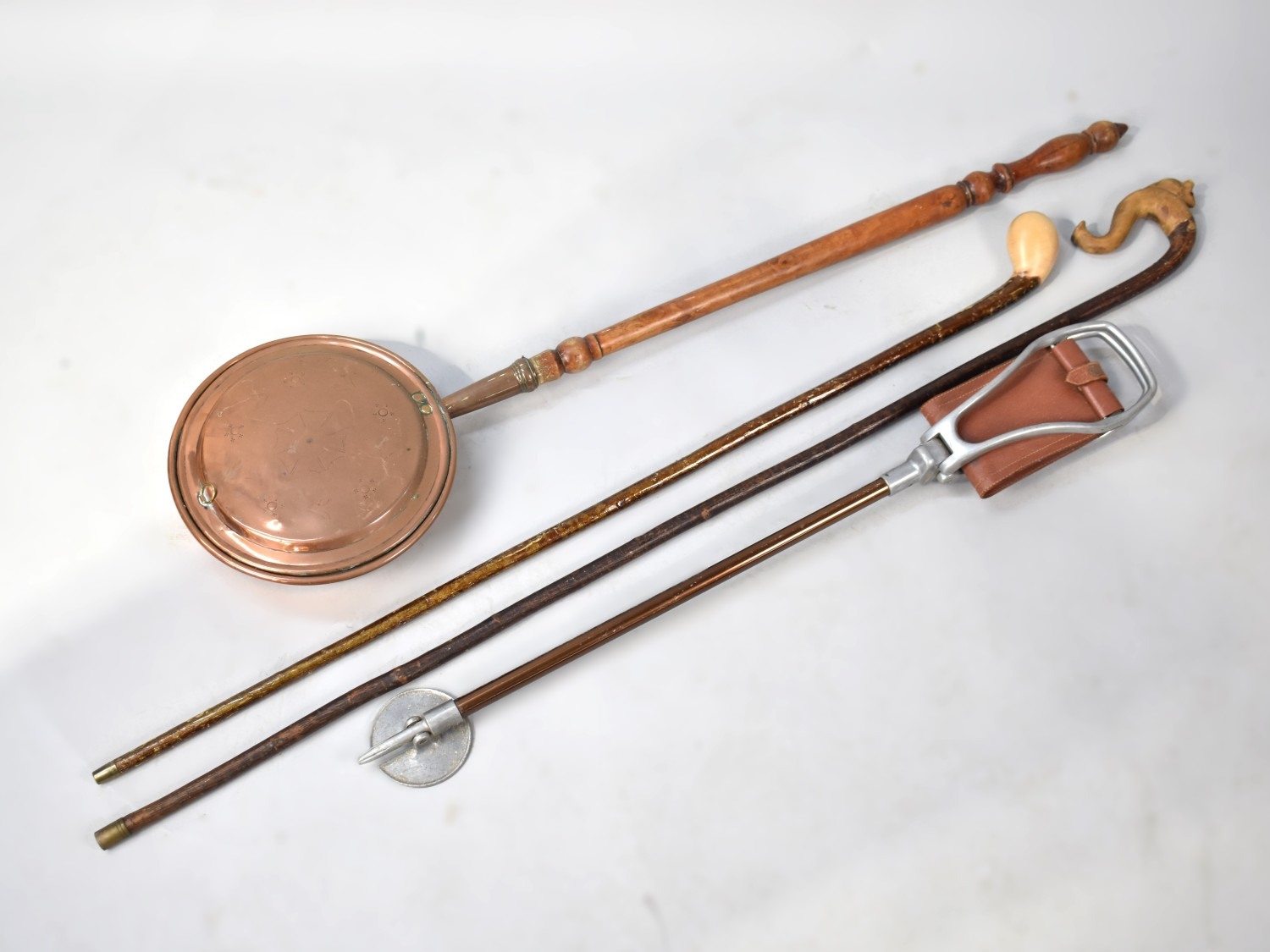 A Mid Century Shooting Stick together with Two Further Walking Sticks and a 19th Century Copper Bed Pan with Turned Wooden Handles