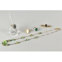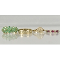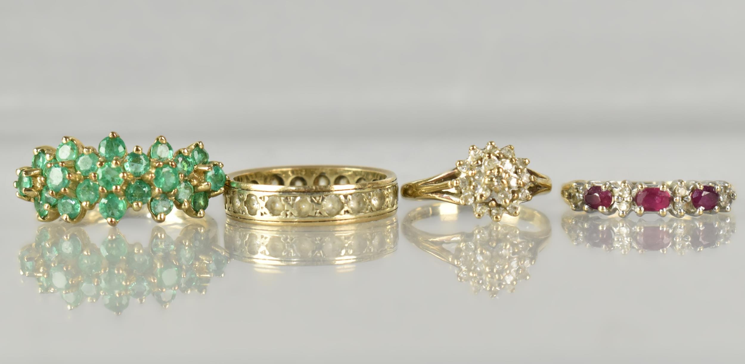 A Collection of 9ct Gold Mounted Jewelled Rings to include Diamond Cluster Size E.5, Ruby Mounted Example, Size I.5, Emerald Cluster, Size J, together with an Unmarked Yellow Metal Eternity Ring Size J.5, with Paste Stones, Total Weight 7.5gms