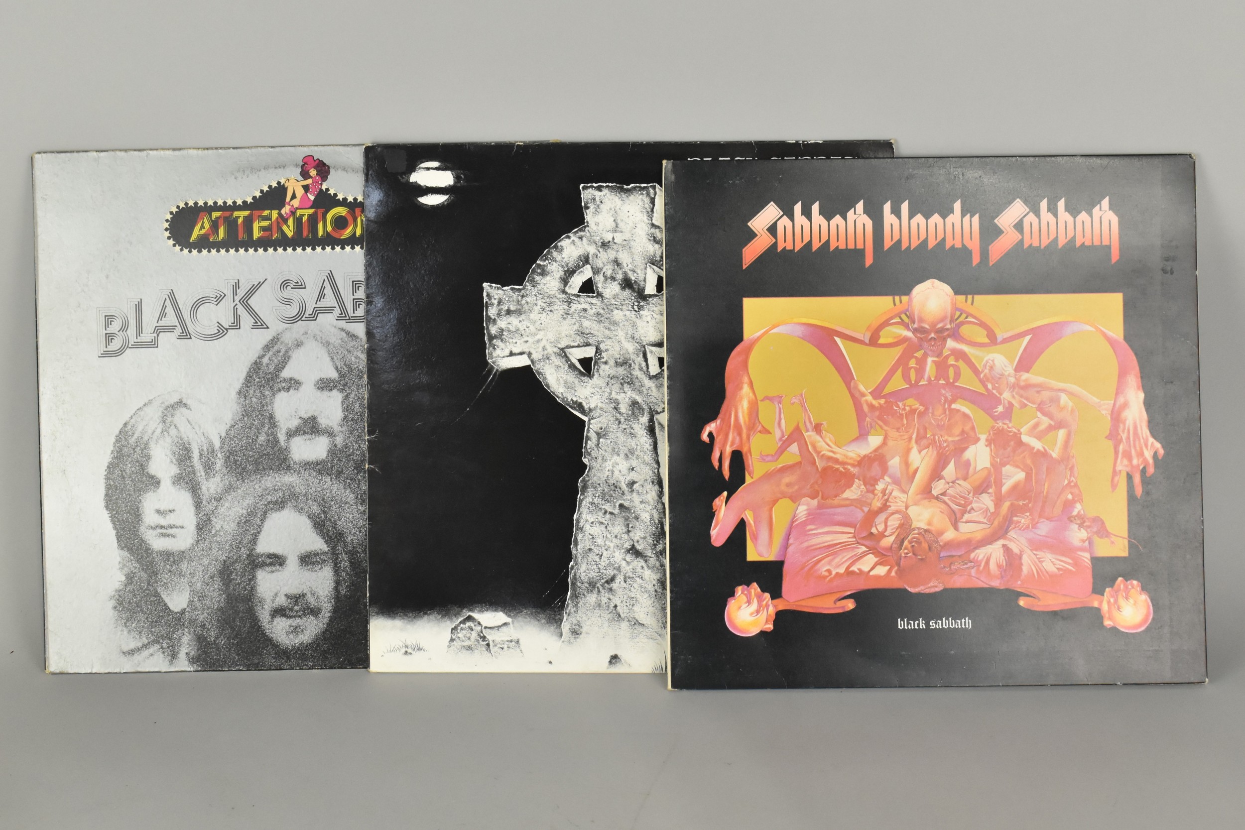 Three Black Sabbath L.P's 'Headless Cross' (IRS EIRSA 1002), 'Sabbath Bloody Sabbath' (WWA 005 Super De Luxe) with Printed Lyric Sleeve, 'Attention!' (Fontana Special 6438 057)