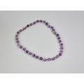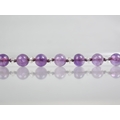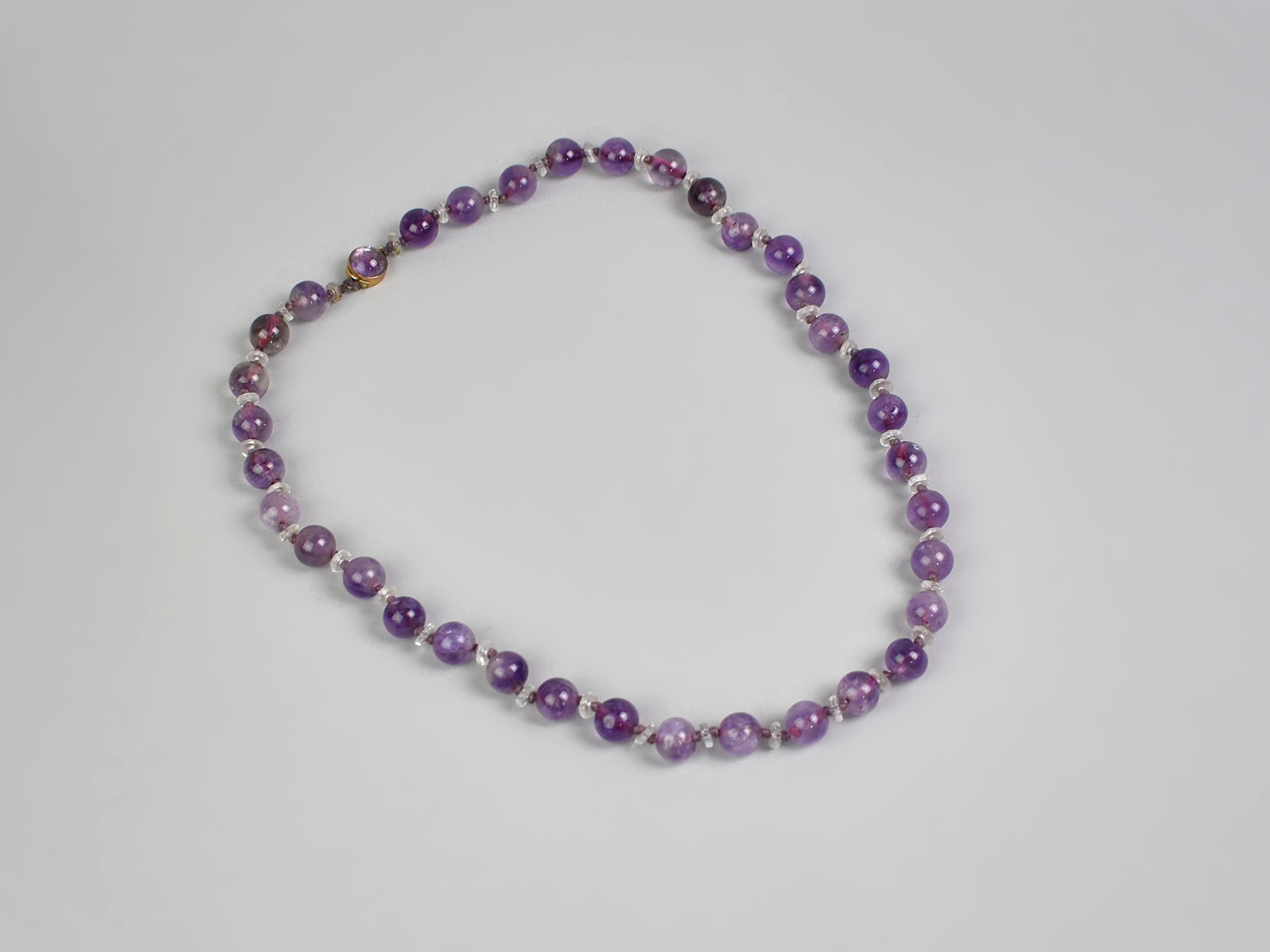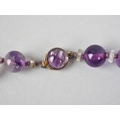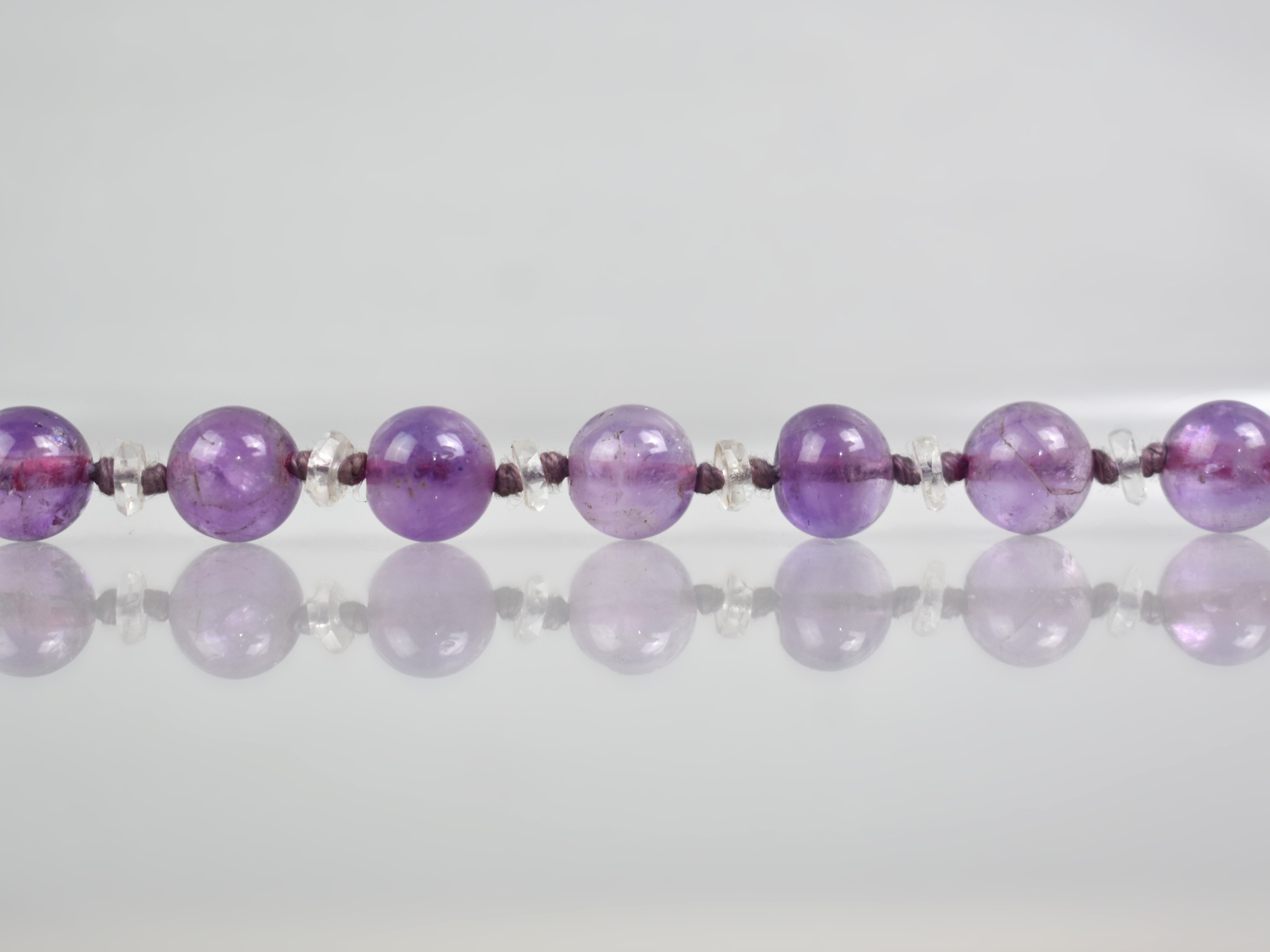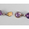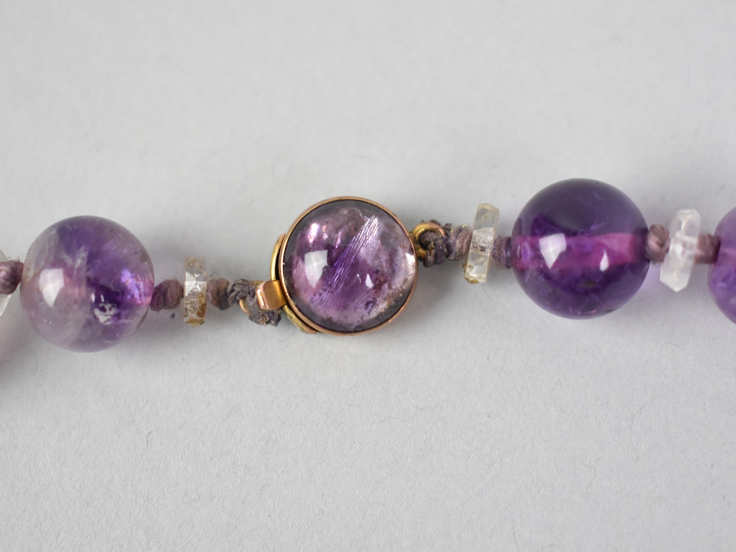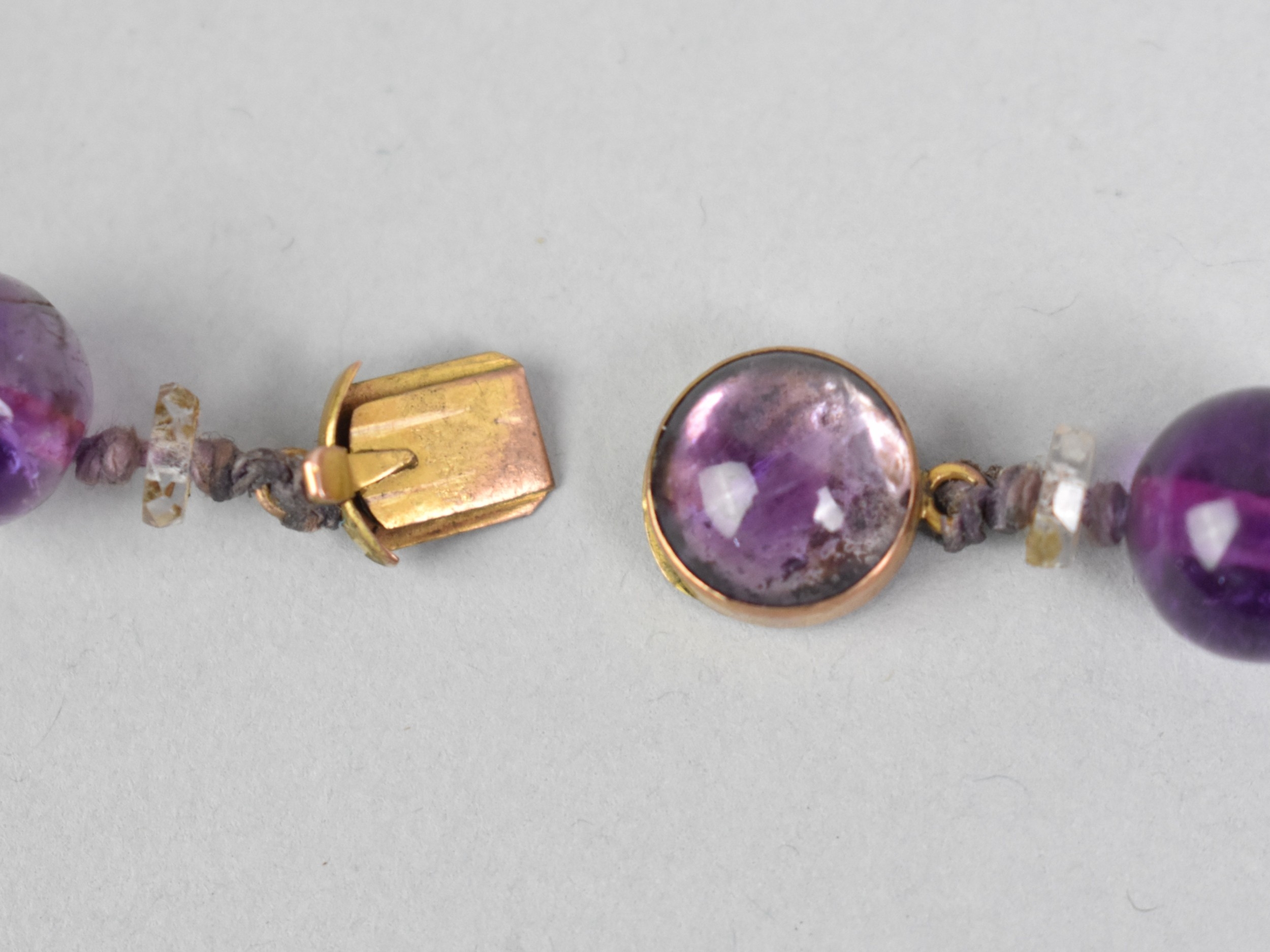 A Late 19th/Early 20th Century String of Spherical Amethyst Beads with a 9ct Gold Clasp, Beads Approx 11.2mm Diameter and on Knotted Purple Thread with Octagonal Carved Rock Crystal Spacers, 61cms Long, Tongue and Box Clasp Stamped 9ct with Cabochon Amethyst Mount