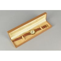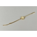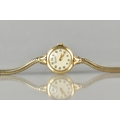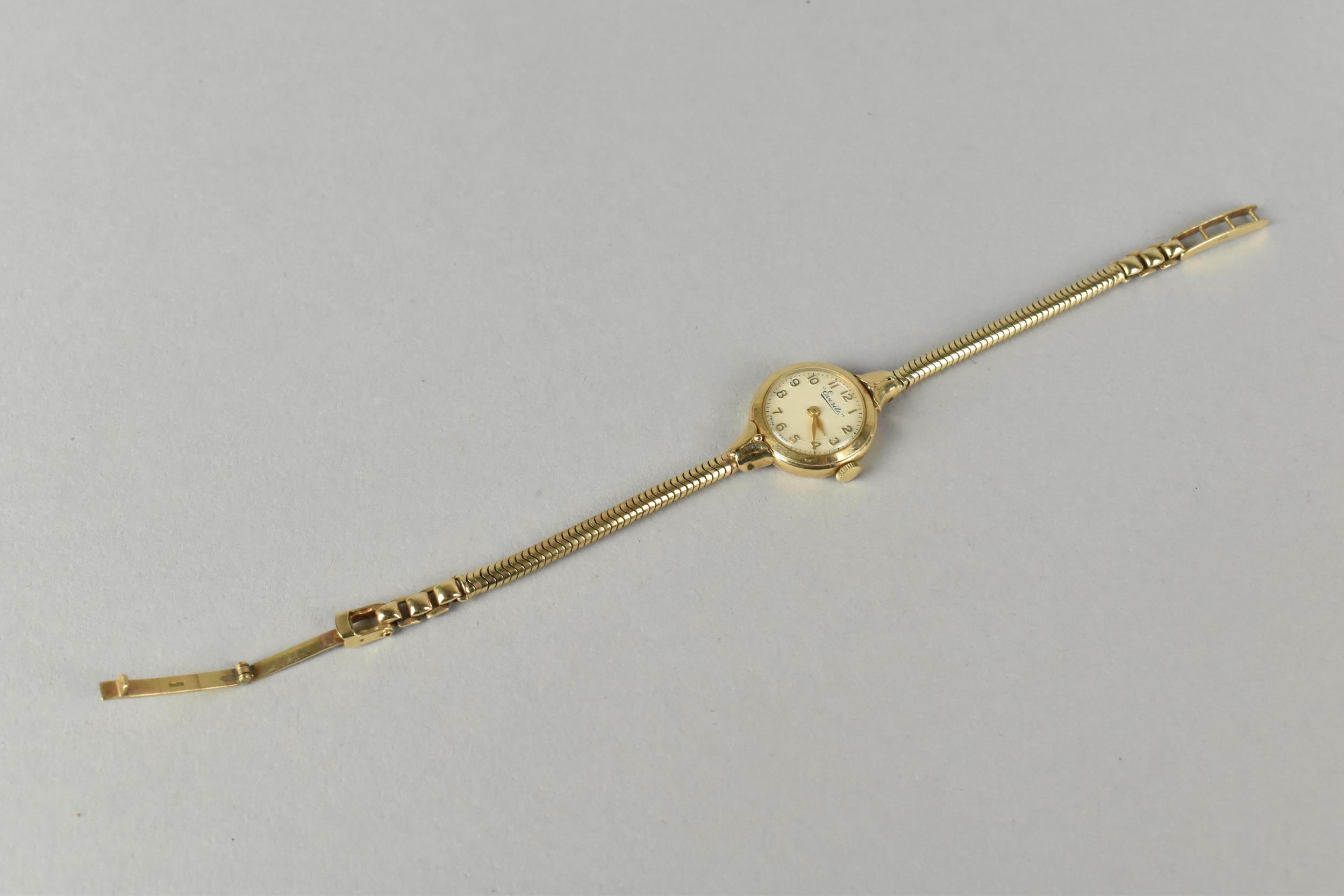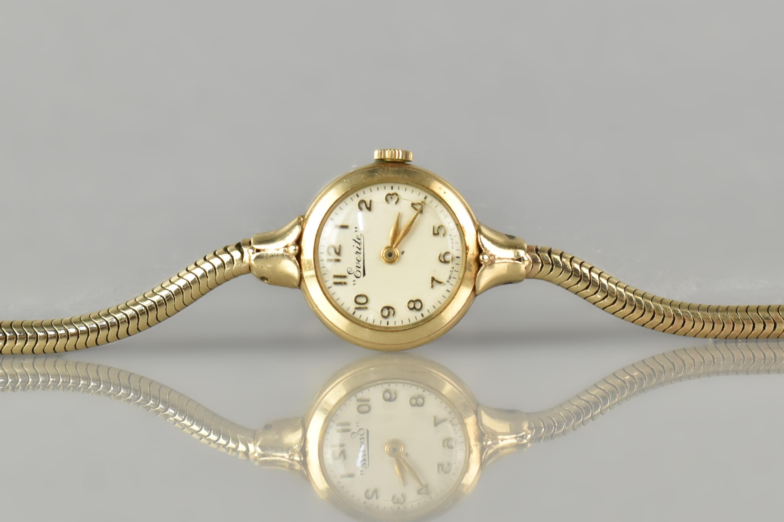 A 9ct Gold Cased Ladies 'Everite' Wristwatch, Champagne Face with Gilt Arabic Numerals and Hands, Case Measuring 19.5mm Wide and Hallmarked for London 1960, Swiss Movement with 15 Jewels, Stylised Lugs and Upon a Snake Link Bracelet Hallmarked for Birmingham 1960 and with Makers Mark SD, 15.2gms Total