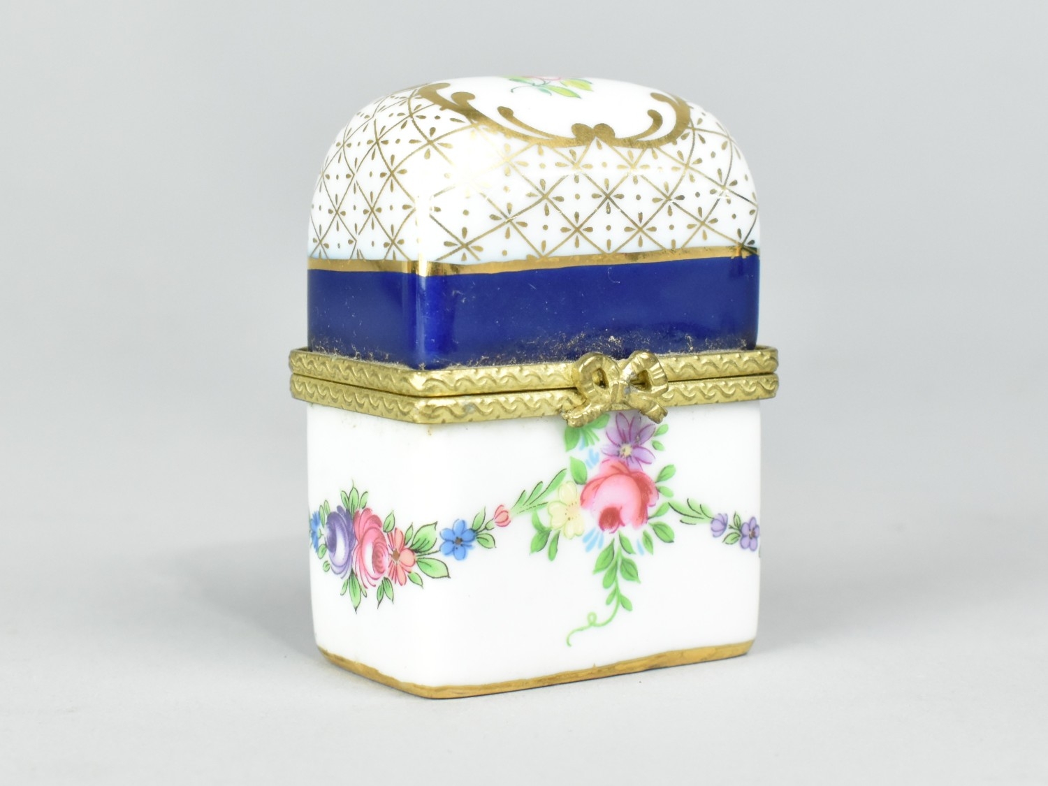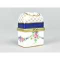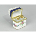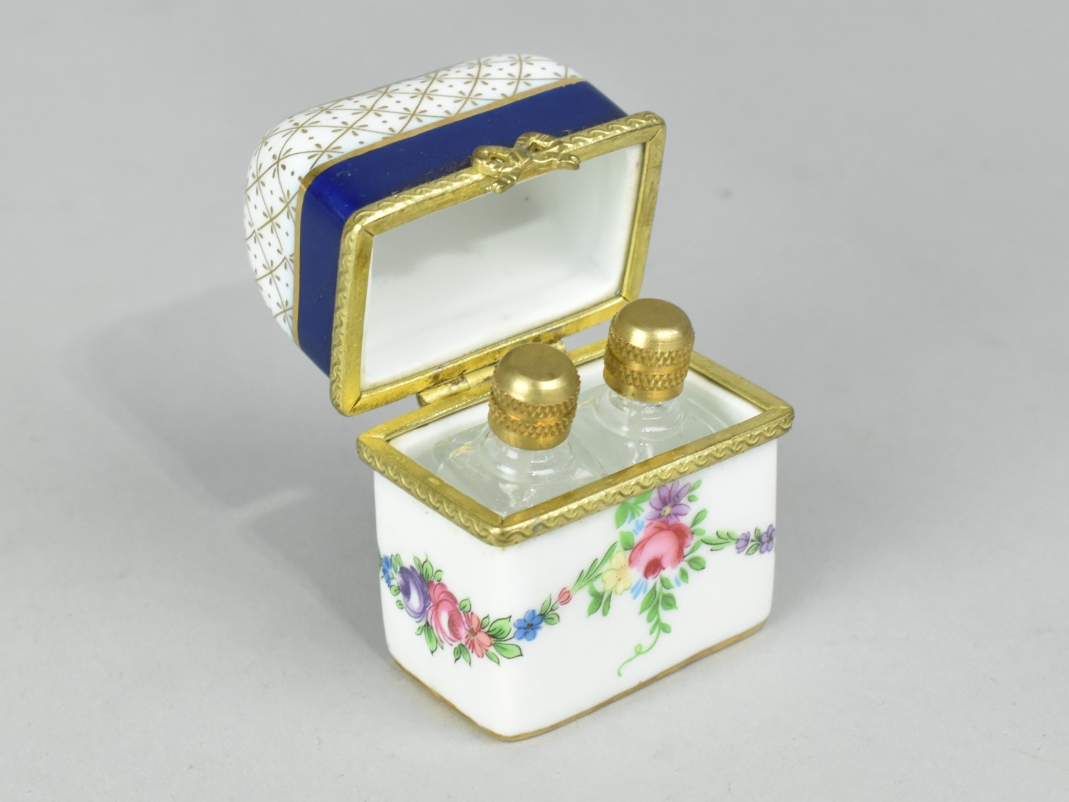 A Past Times Porcelain Miniature Scent Casket Containing Two Small Glass Scent Bottles, the Casket Decorated with Floral Swag and Rose Burst Enriched with Gilt Highlights and Having Blue Inset, 5.5cm high