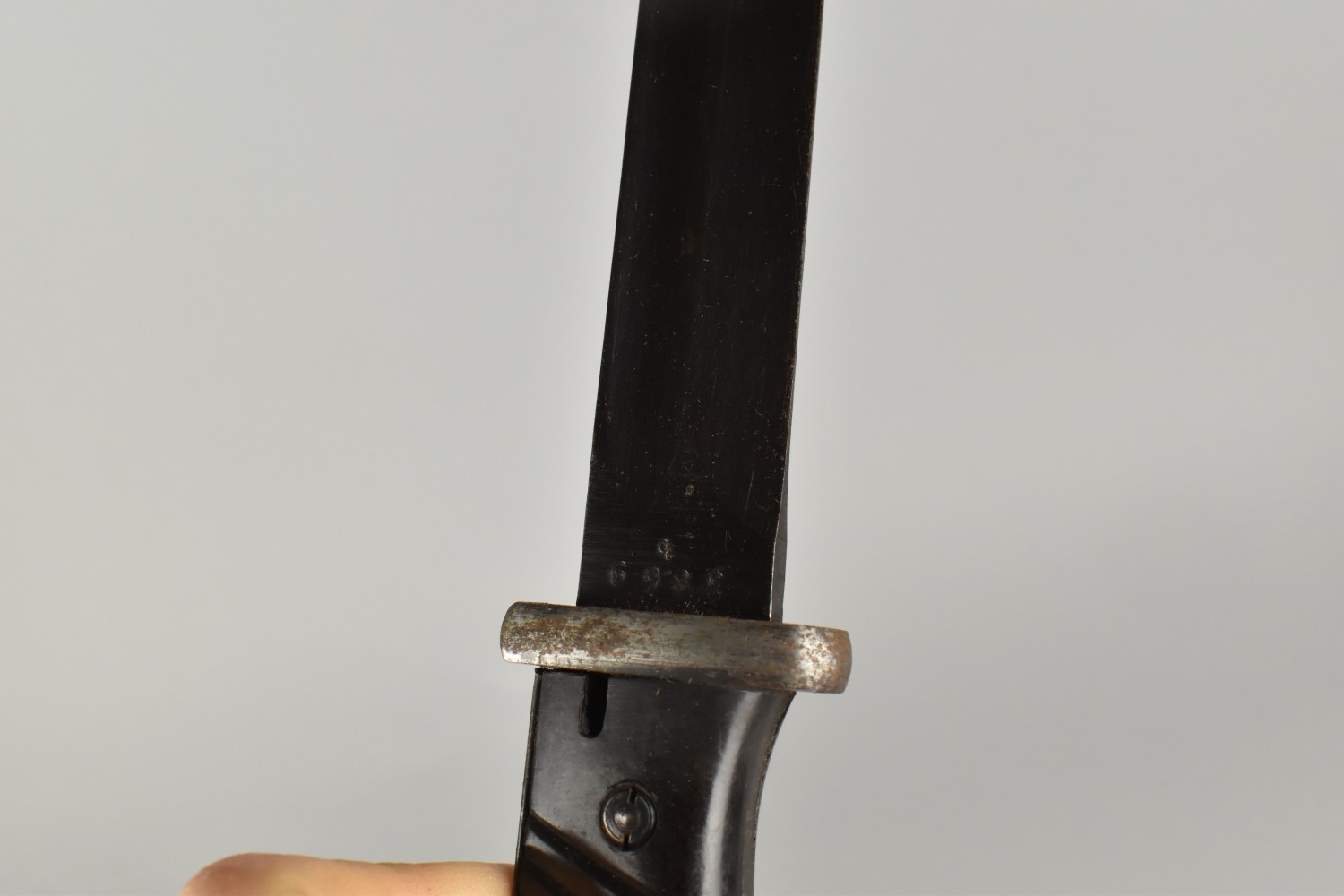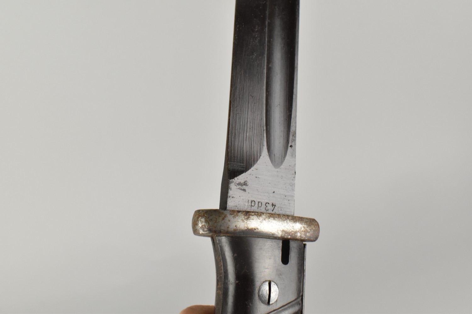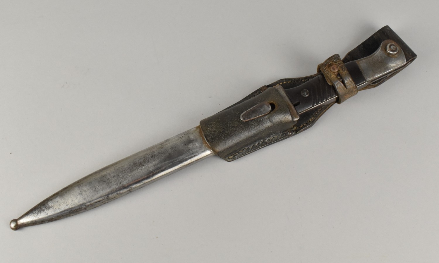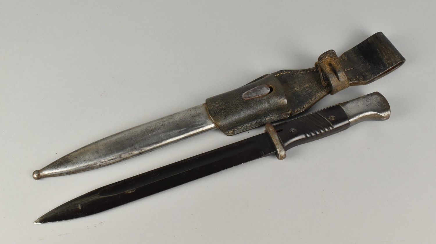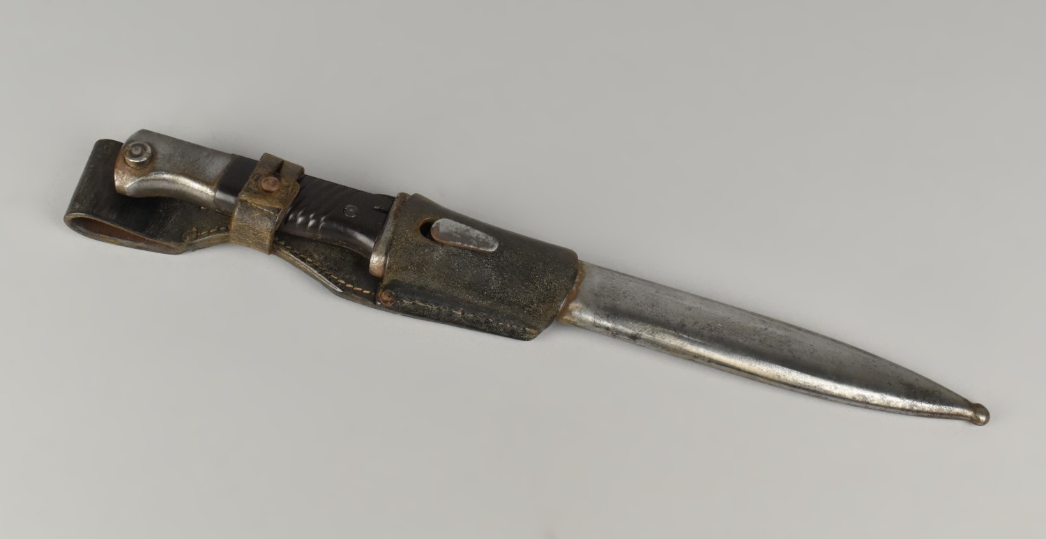 A WWII German K98 Bayonet with Steel Scabbard and Leather Frog, Blade Numbered 3869 and Stamped 43ddl