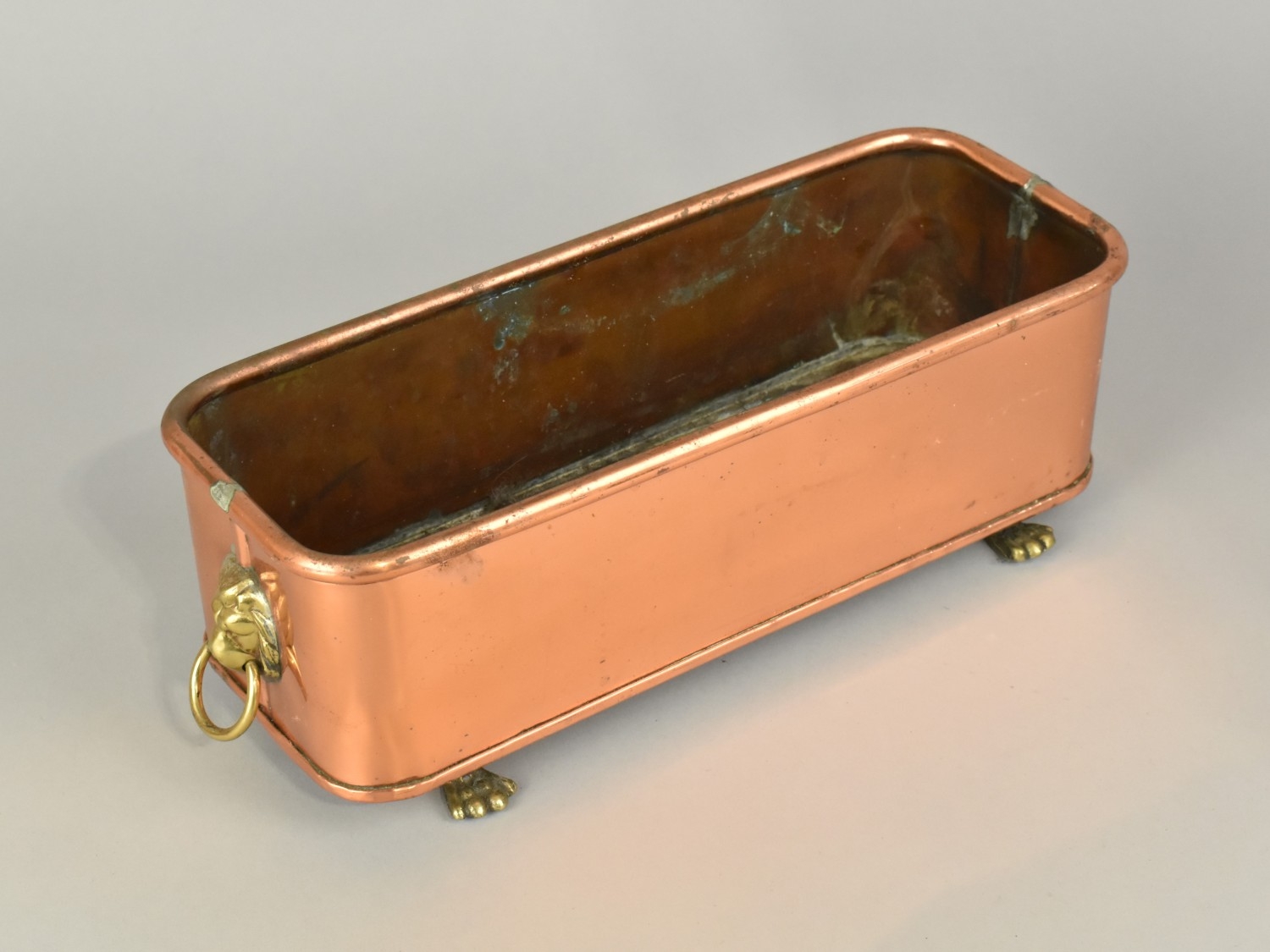 A Copper Rectangular Planter with Lion Mask Ring Handles, 29...