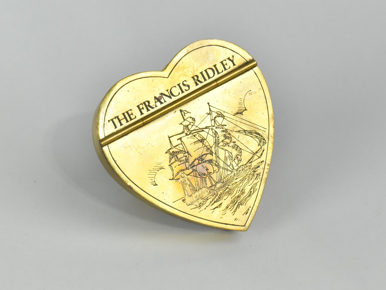 A Vintage Brass Heart Shaped Snuff Box Inscribed with "The Francis Ridley" Tall Ship, 9cms High
