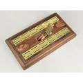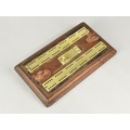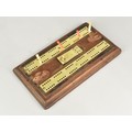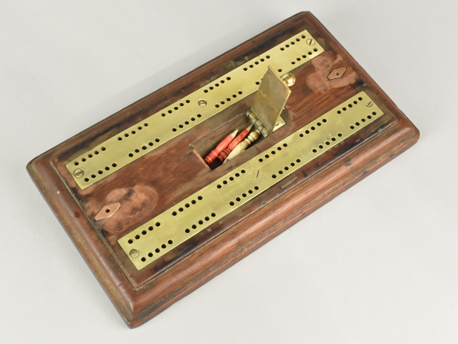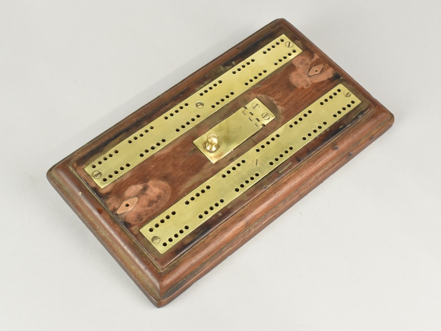 A Late Victorian/Edwardian Brass Mounted Cribbage Board on Stepped Wooden Plinth with Pegs in Hinged Recessed Store, 22cms Long