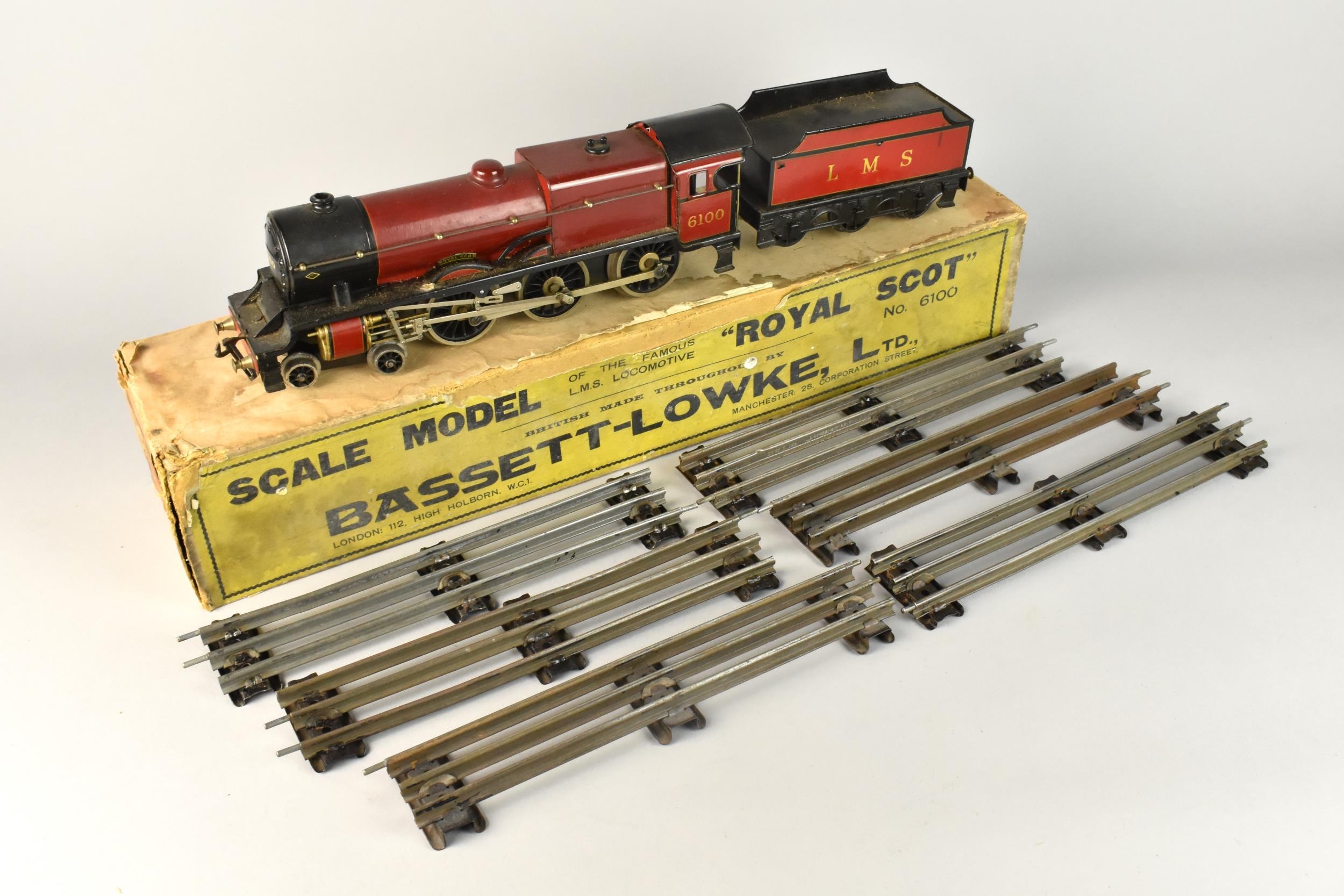 A Vintage Boxed Bassett-Lowke O Gauge 4-6-0 Loco and Tender "The Royal Scot" in Maroon. 3 Rail 12 Volt DC. Together with Small Quantity of 3 Rail Track.