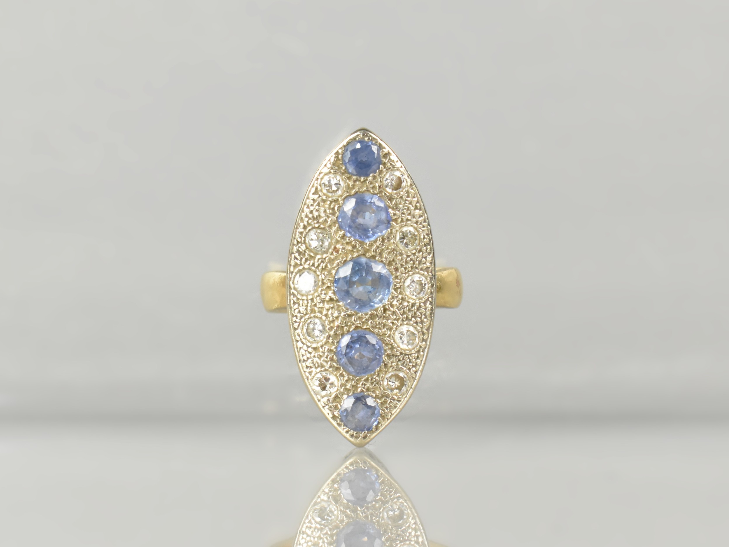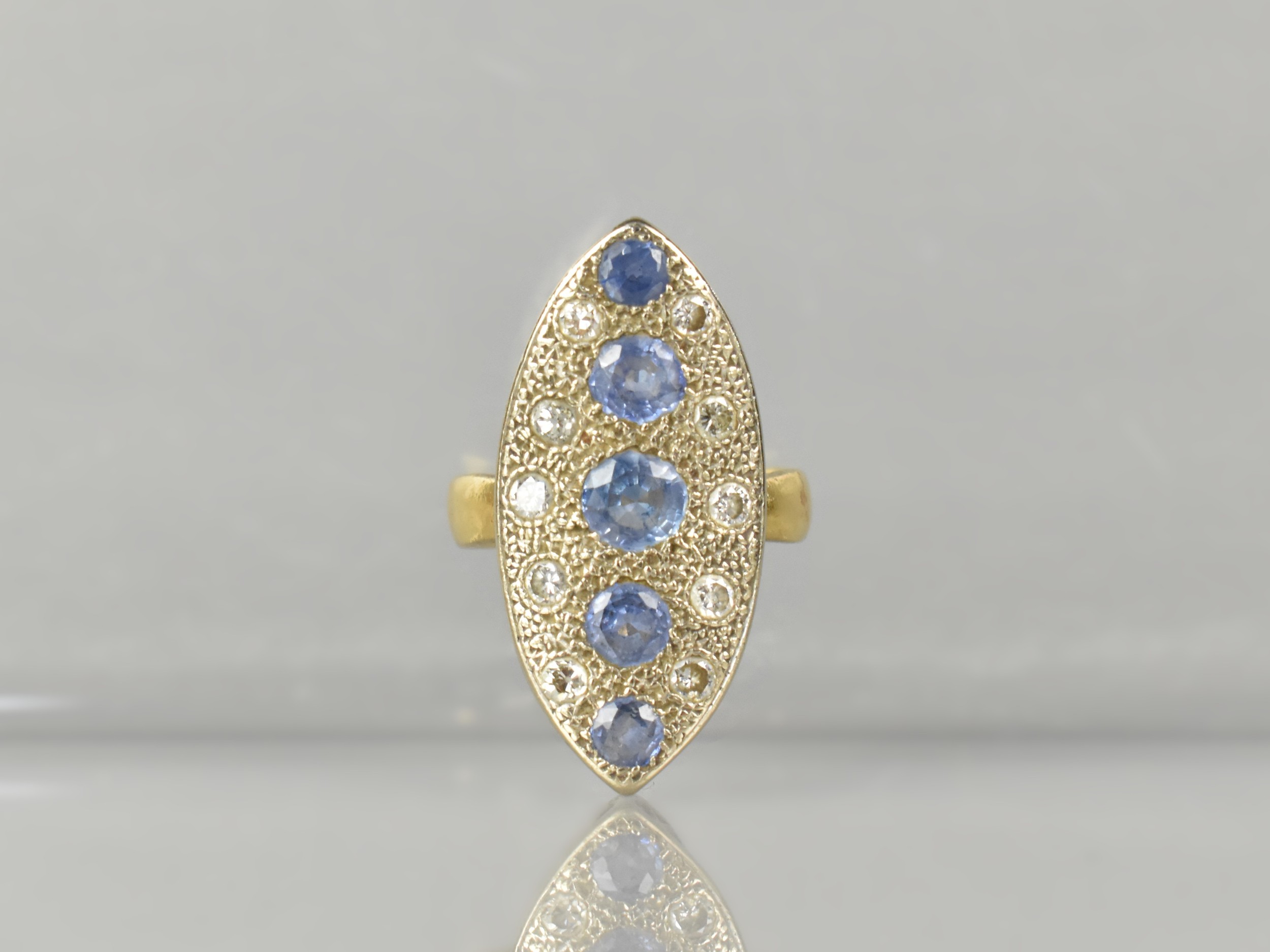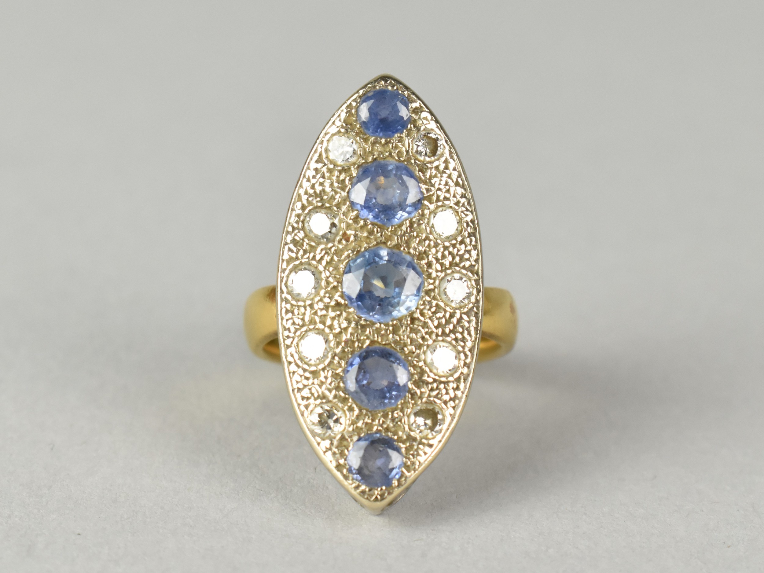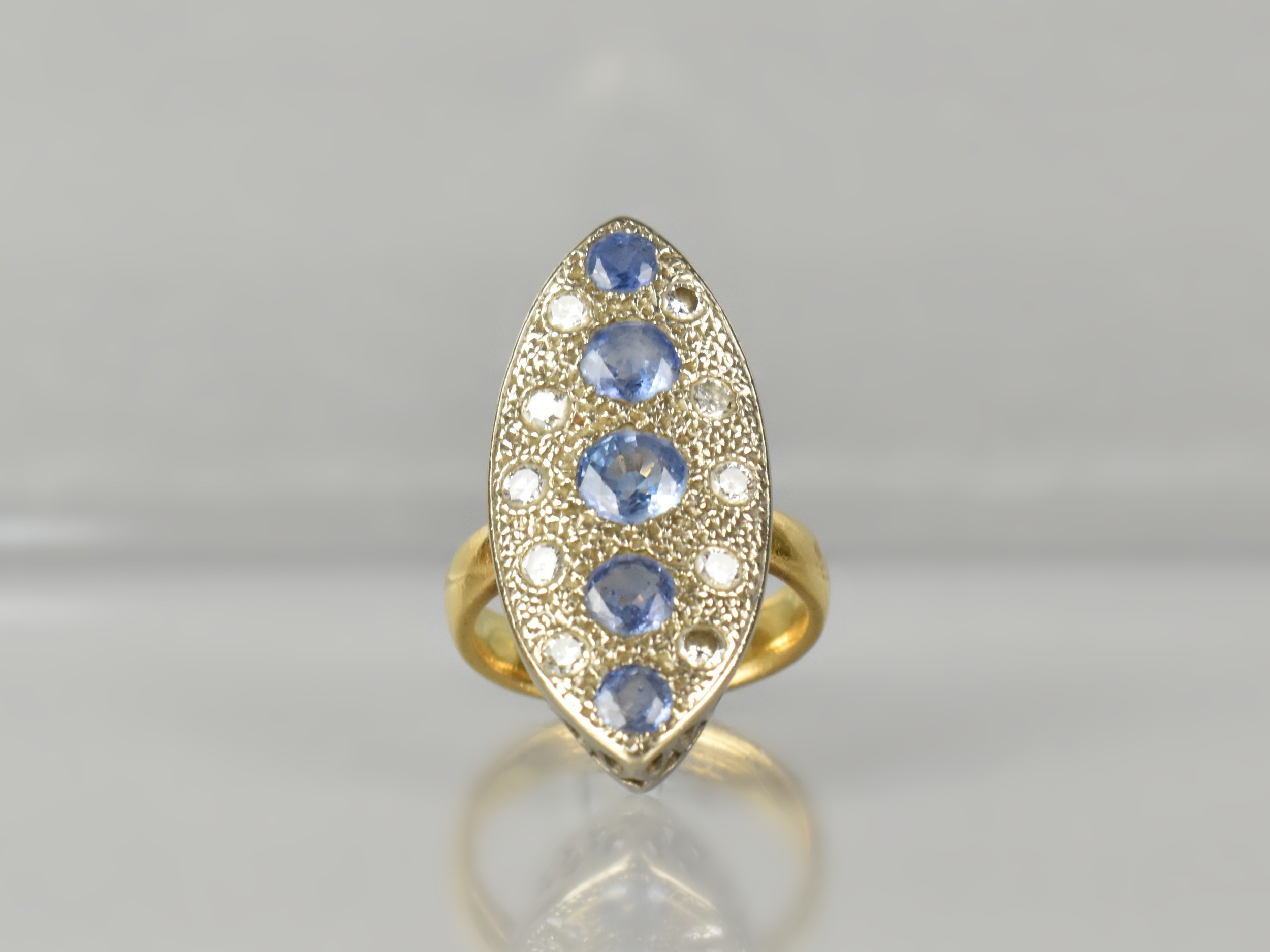 A Large, Sapphire and Diamond Navette Ring, Five Graduated Old Round Cut Sapphires Measuring 5mm Diameter, Smallest 3.4mm with Ten Old Round Cut Diamonds Measuring 2.3mm Diameter to the Edges of the White Metal Textured Head, Head Measuring 31.0mm by 14.5mm, to a 22ct Gold Band (Please Note this is an Amalgamation), Total Weight 10.2gms, Size N.5