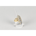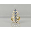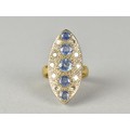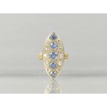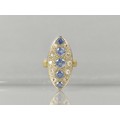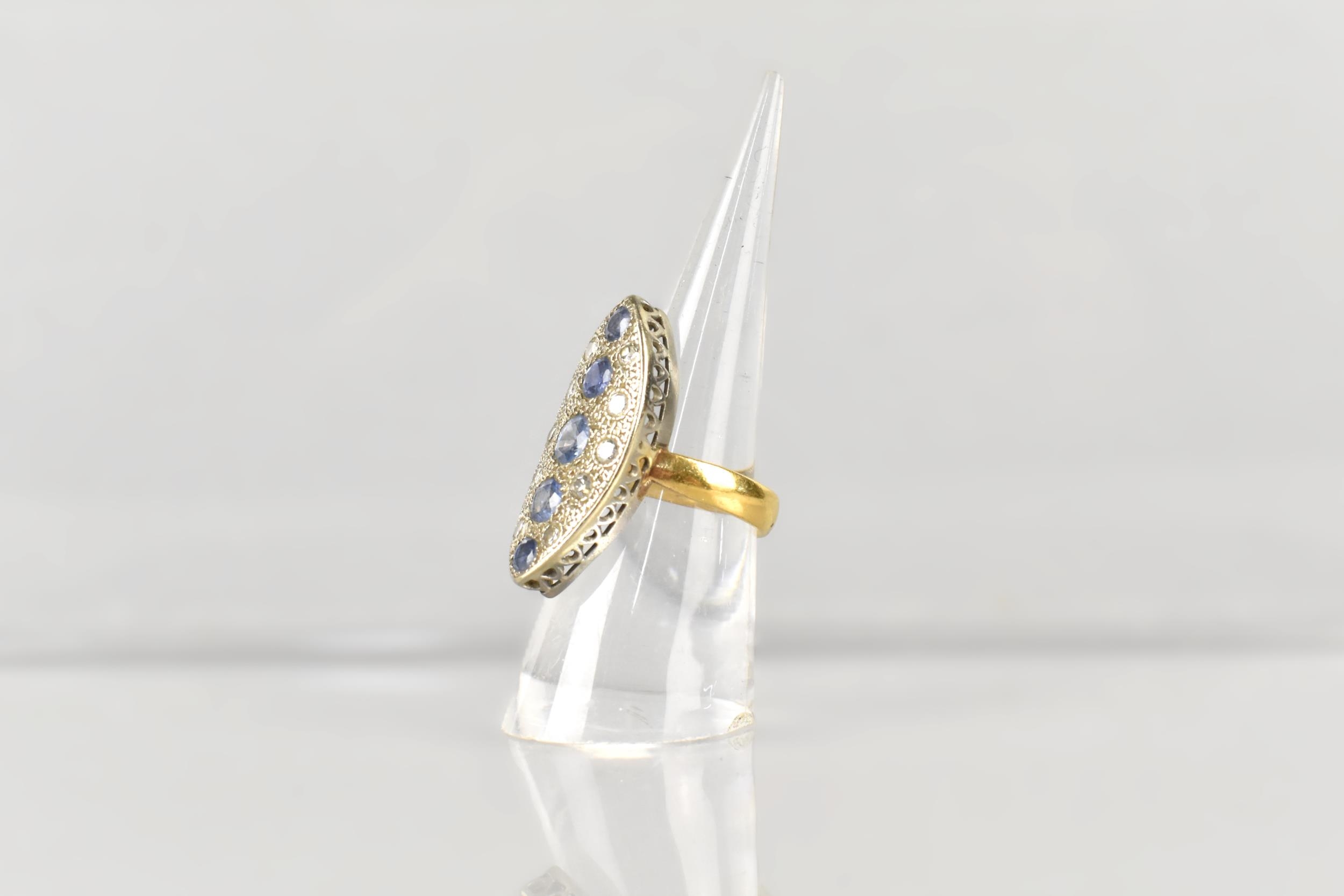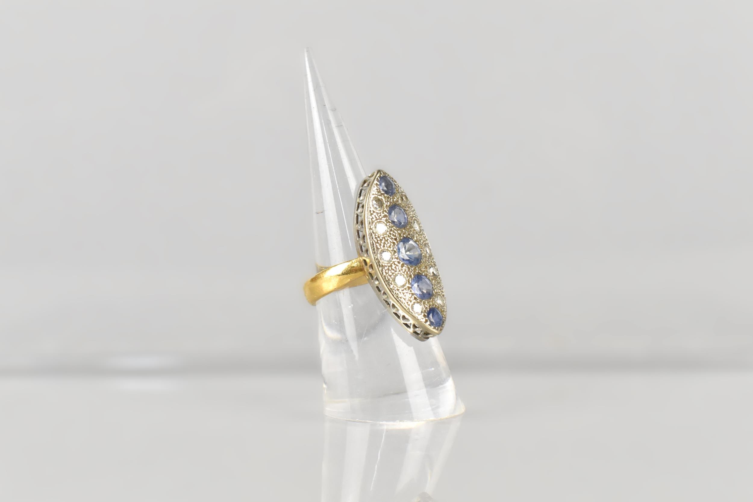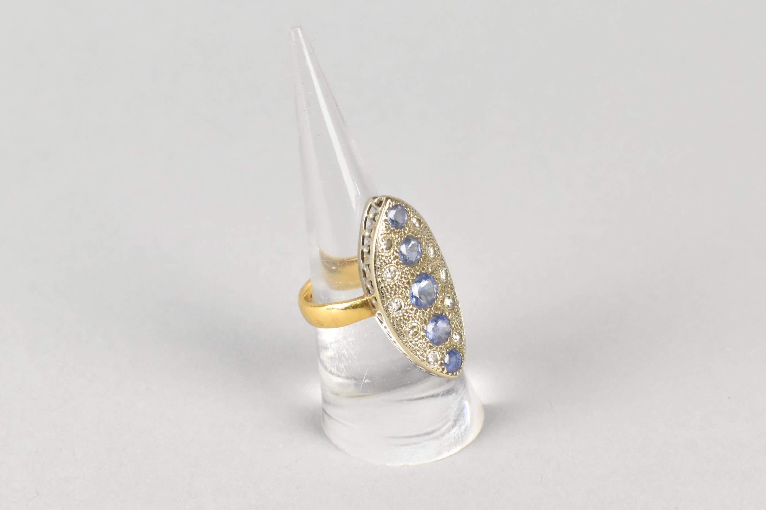 A Large, Sapphire and Diamond Navette Ring, Five Graduated Old Round Cut Sapphires Measuring 5mm Diameter, Smallest 3.4mm with Ten Old Round Cut Diamonds Measuring 2.3mm Diameter to the Edges of the White Metal Textured Head, Head Measuring 31.0mm by 14.5mm, to a 22ct Gold Band (Please Note this is an Amalgamation), Total Weight 10.2gms, Size N.5