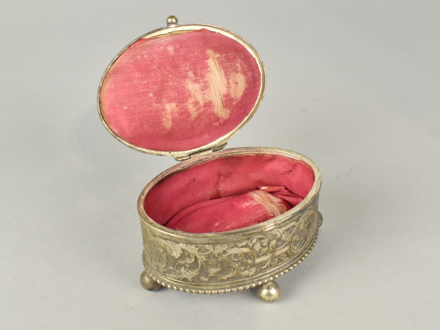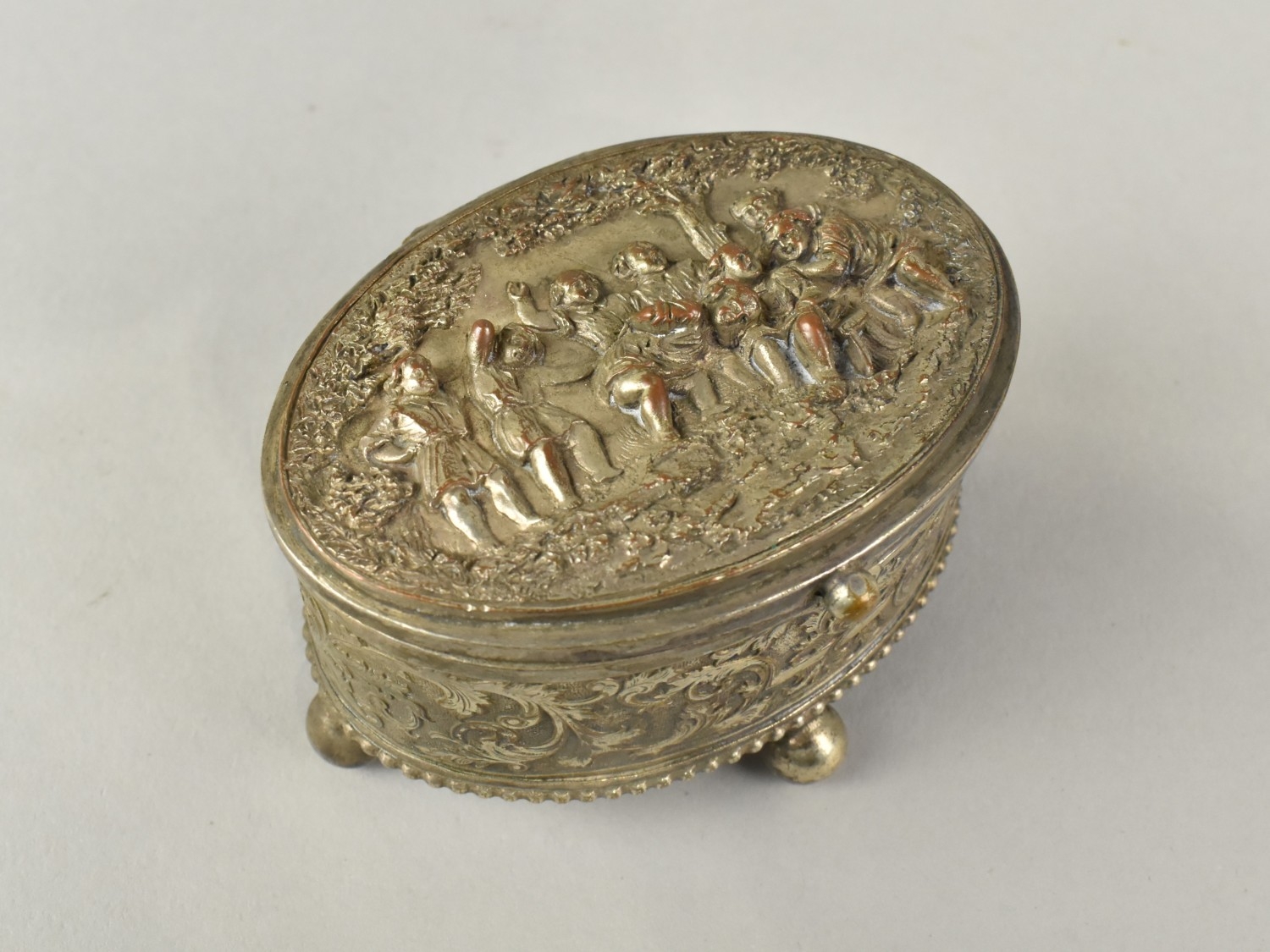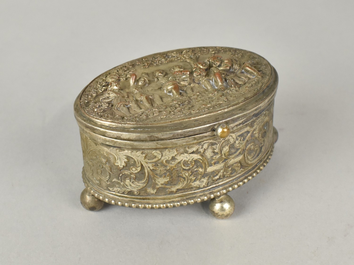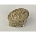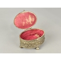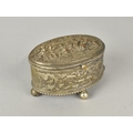 A Continental Oval Silver Plated Jewellery Casket with Hinged Lid having Relief Decoration, Probably French, 8cms Wide