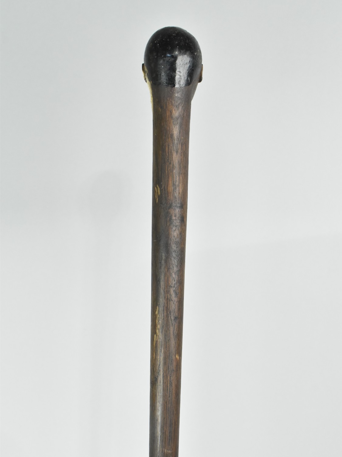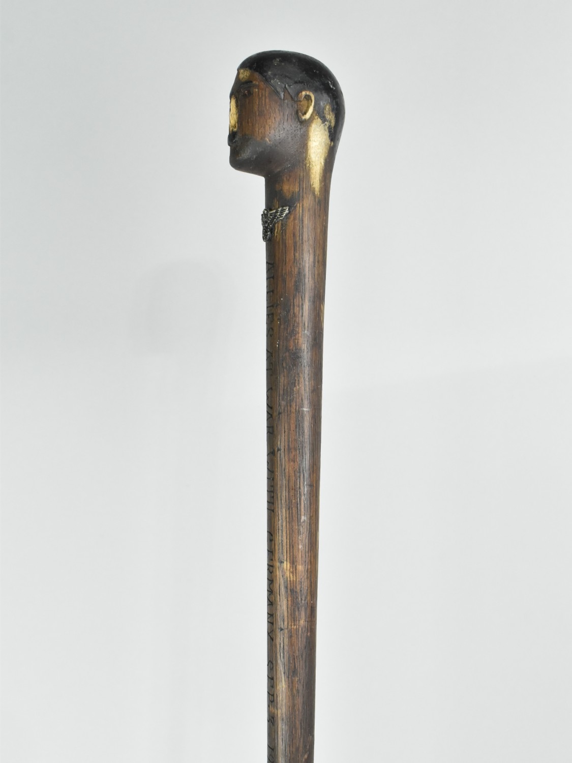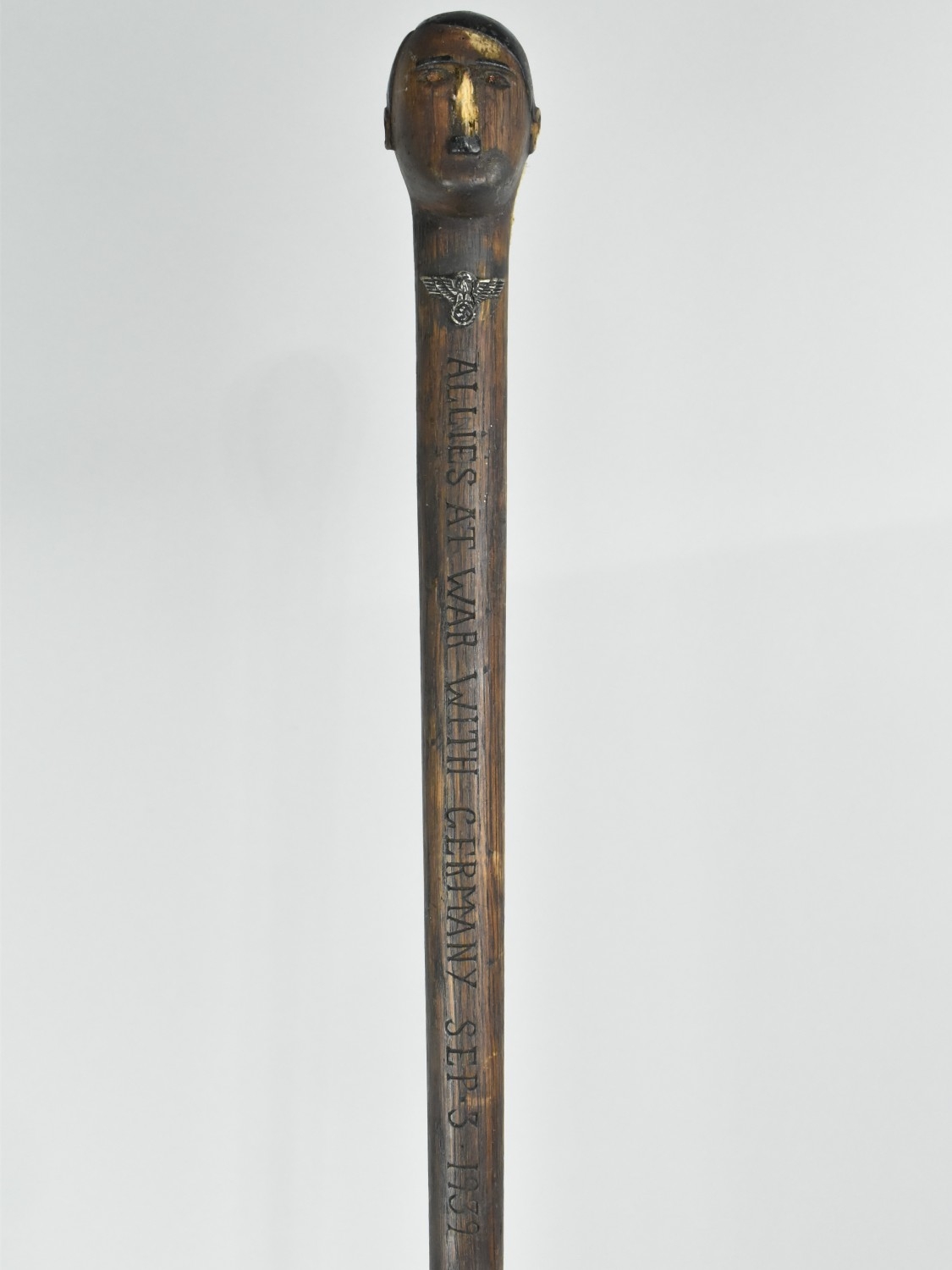 A Trench Art Carved Wooden Walking Stick Inscribed "Allies At War With Germany Sep 3 1939" The handle in the form of a Bust of Hitler. Loss to nose. 78cms long