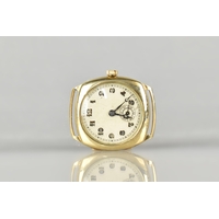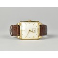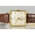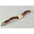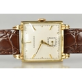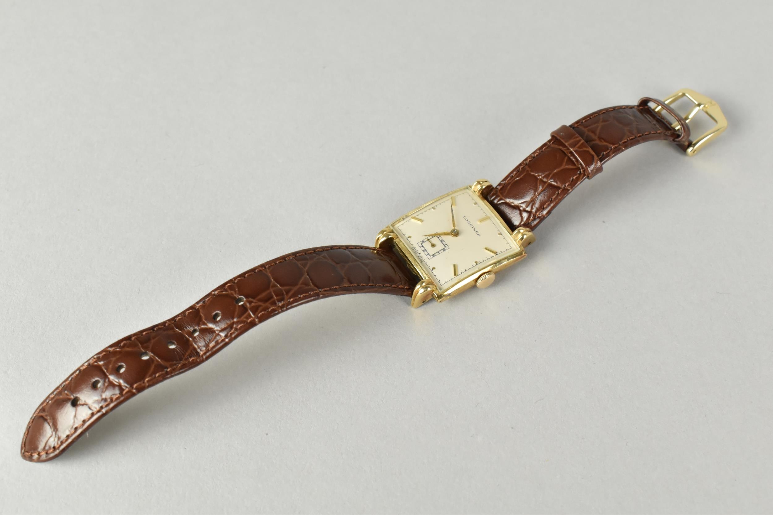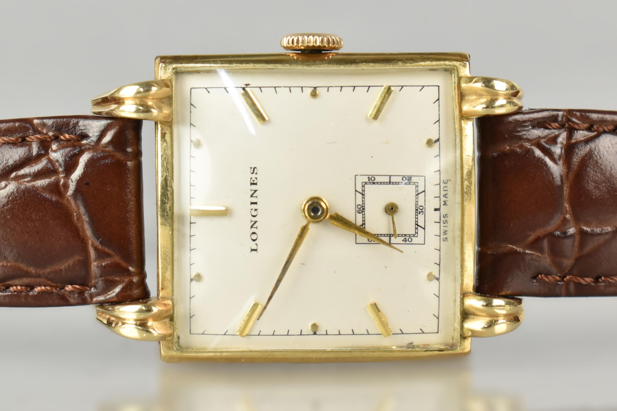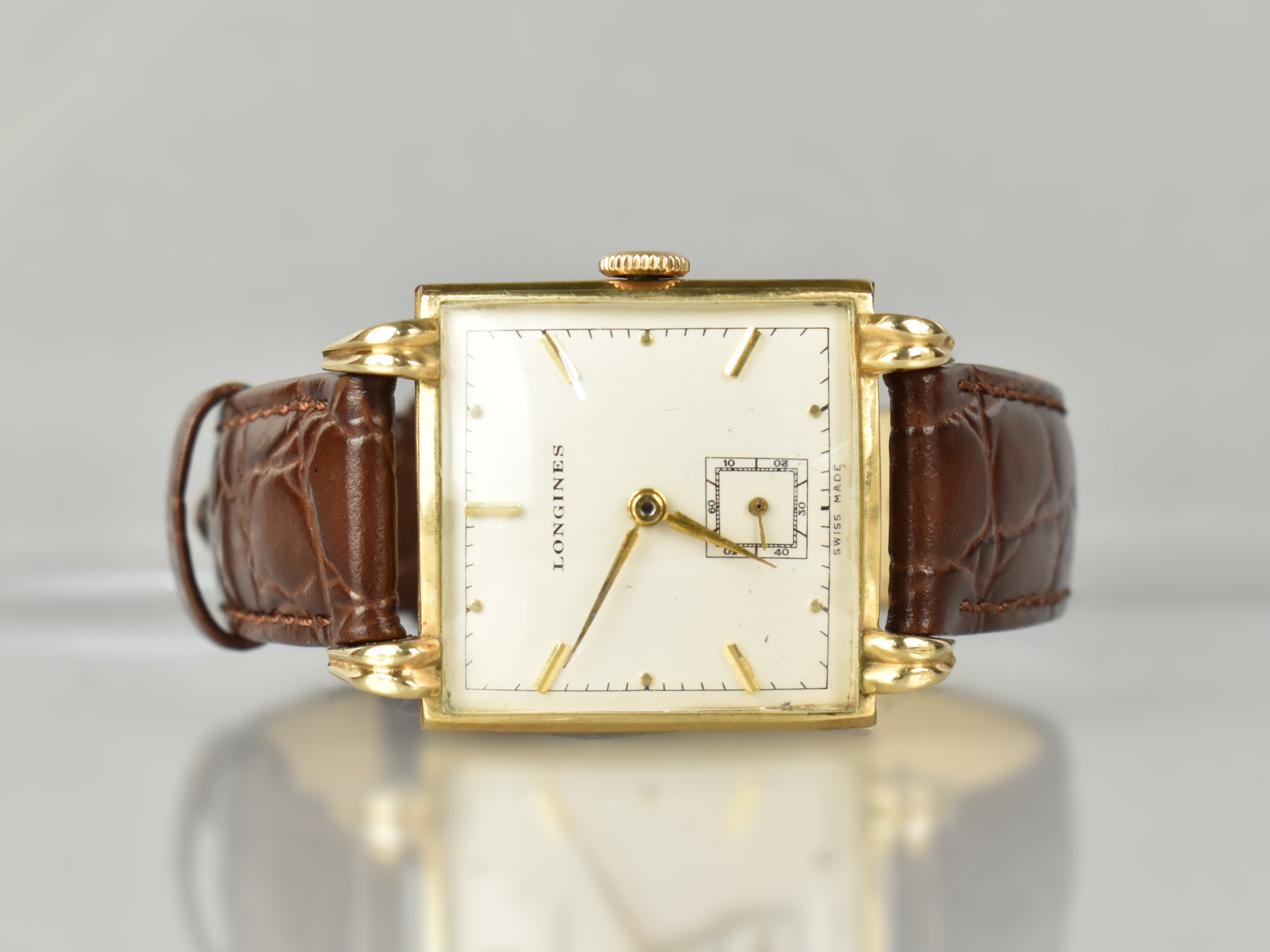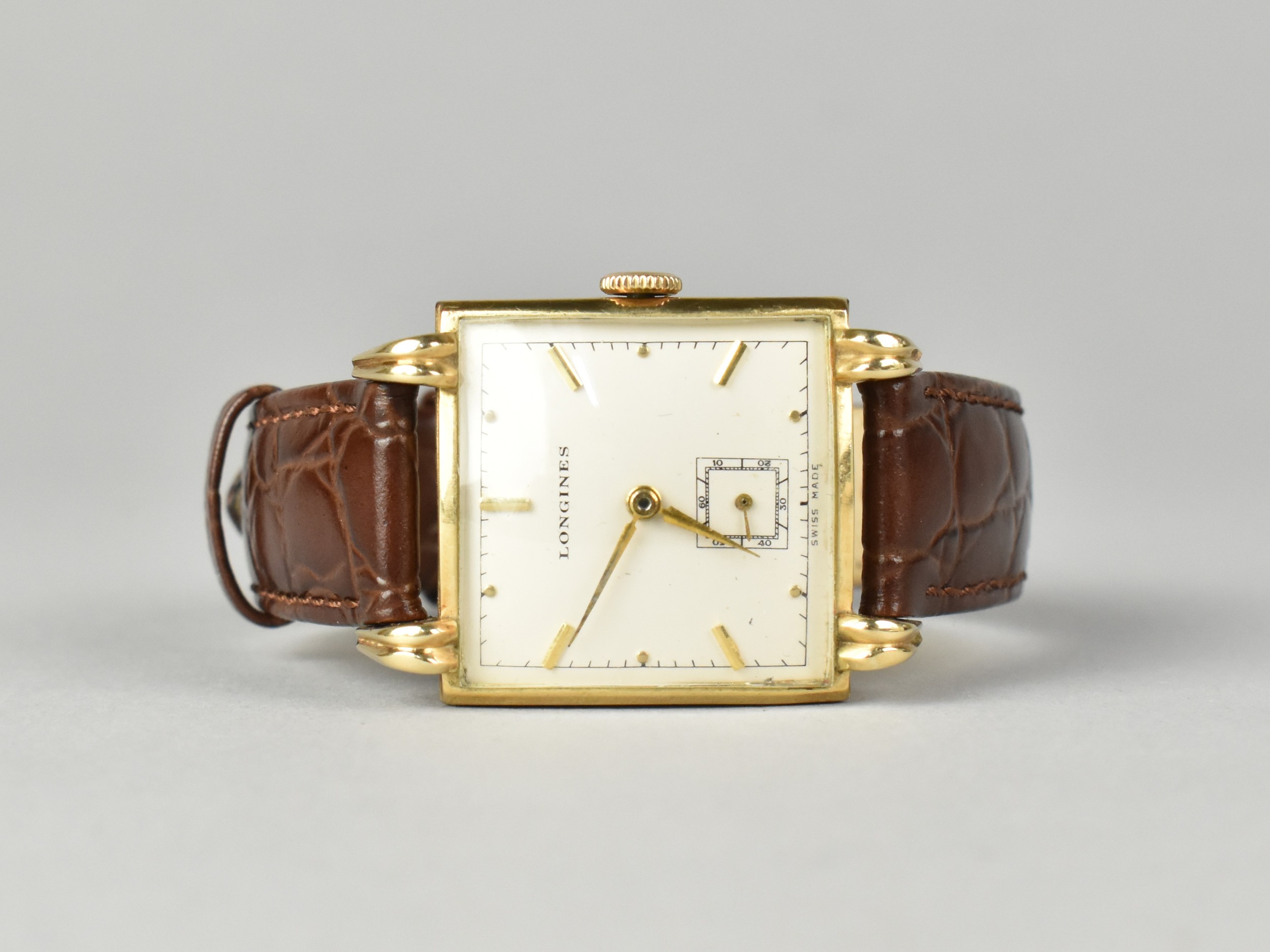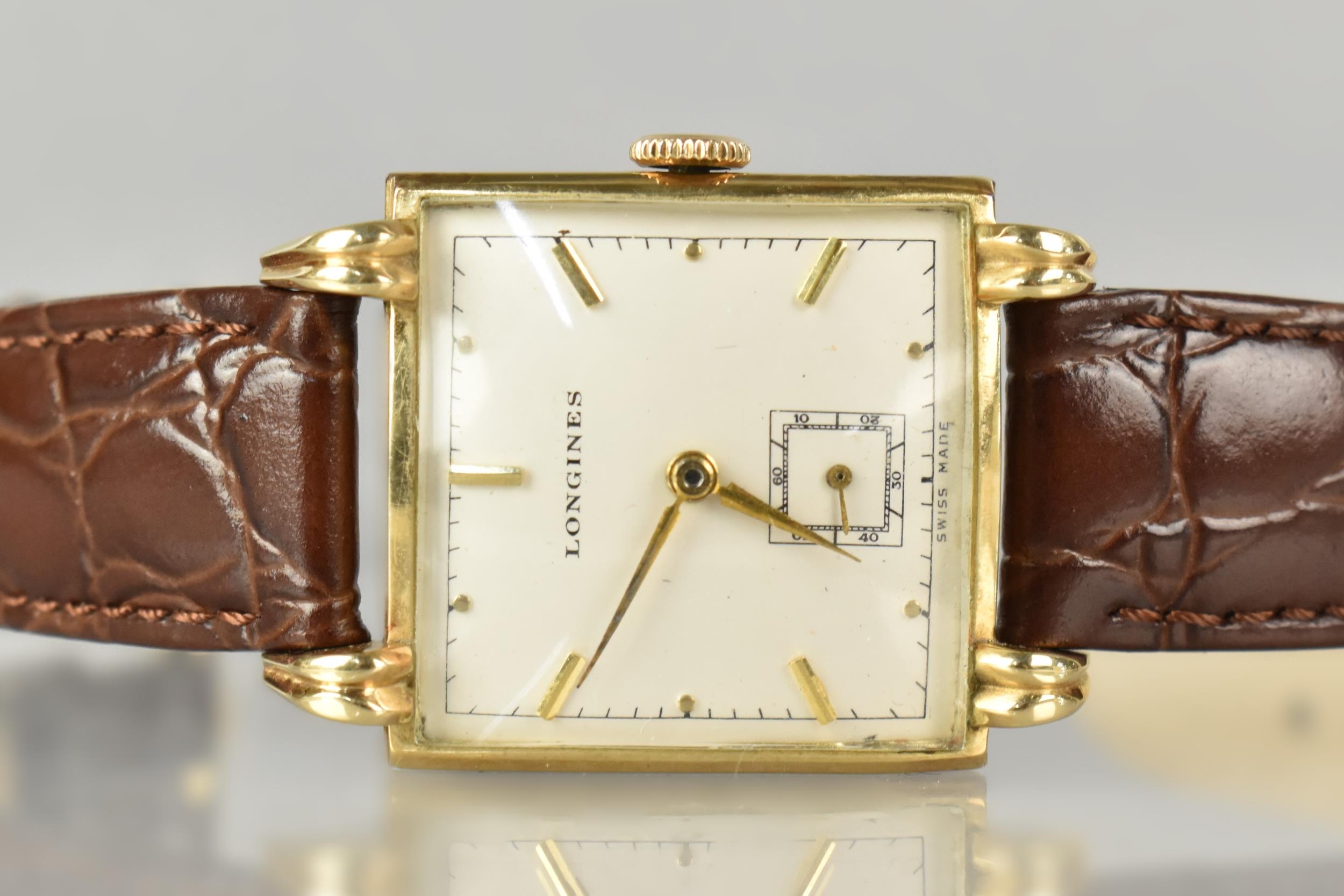 A 14ct Gold Cased Longines Wristwatch, Square Champagne Dial with Gilt Metal Lance Hands and Baton Hour Indicators, Minute Chapter Ring and Subsidiary Seconds Indicator at 6 O'Clock, Inscribed Below Swiss Made, Square Case Measuring 25.7mm Wide Excluding Crown and Fluted Lugs, Inscribed to the Interior with Swiss Hallmarks for 14ct Gold and Longines Watch Co, Numbered 335725, 17 Jewel Movement Numbered 6992411 on Chocolate Faux Crocodile Hirsch Strap, Not Currently Working
