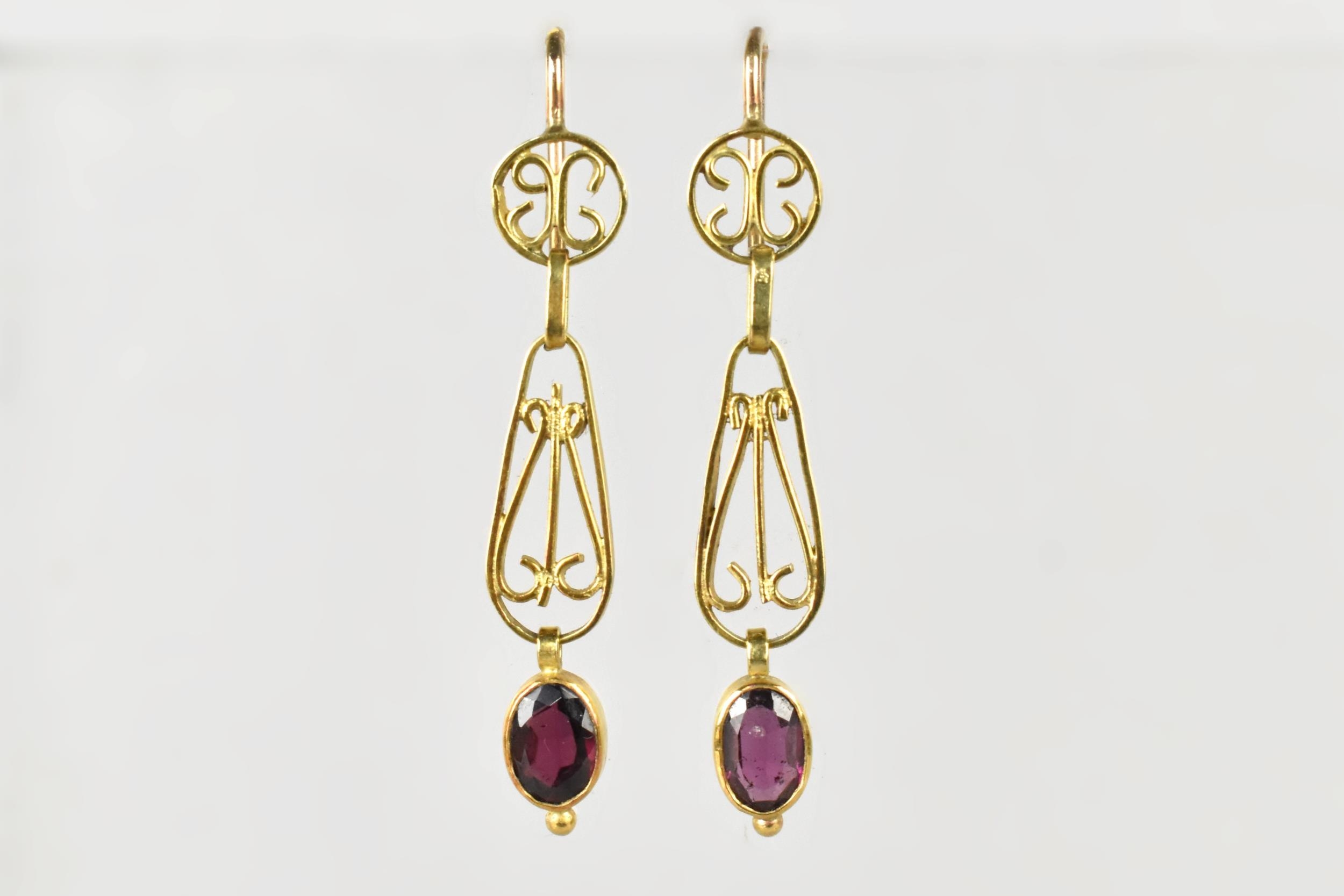 A Pair of Gold Coloured Metal and Garnet Set Drop Earrings Each having Bevel Set Oval Cut Stone Drop, Measuring 6.5mm by 4.5mm, Wirework Form to Tear Drop Shaped Body and Surmounted by Similarly Decorated Circular Panel, Fish Hook Backs, 3.5gms, 44mm Total Drop