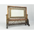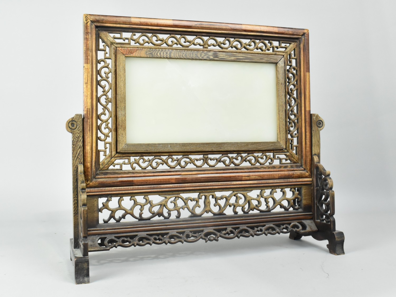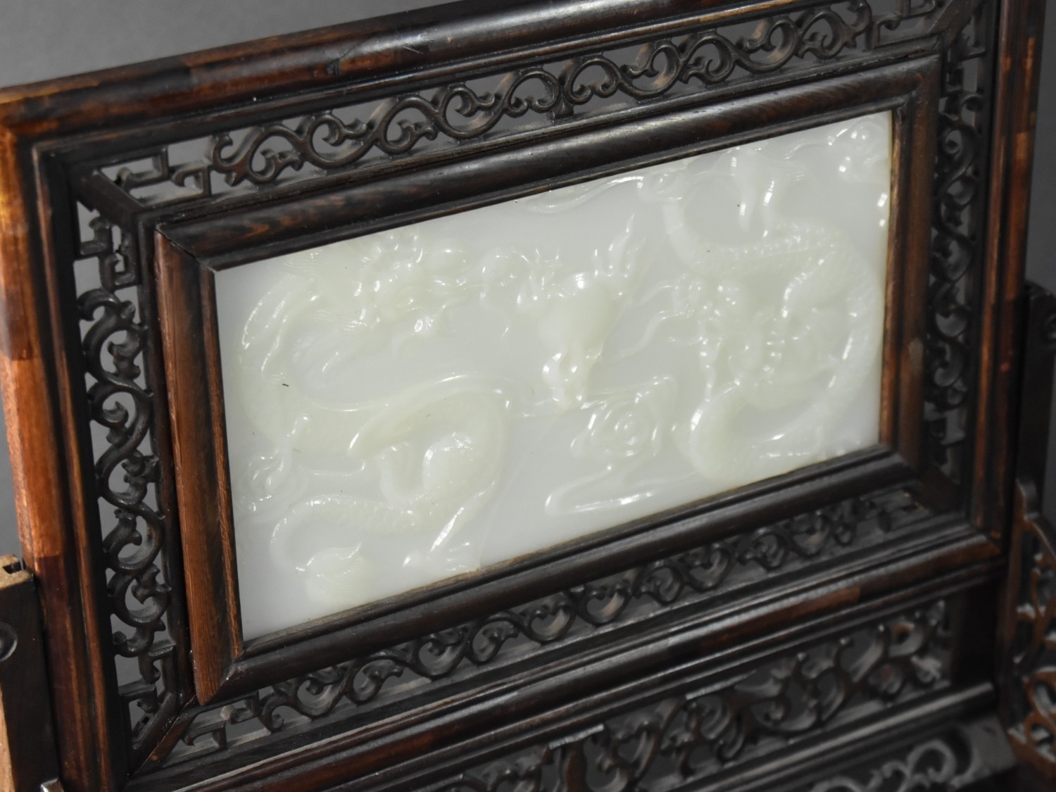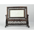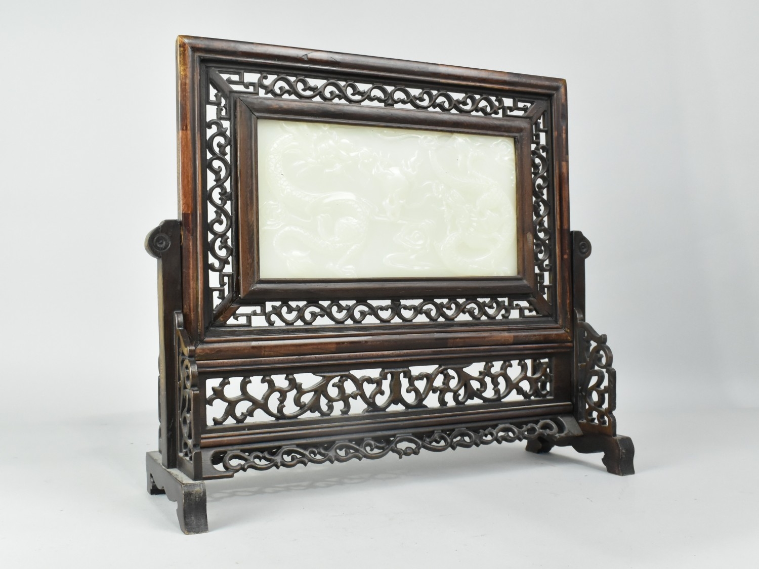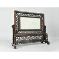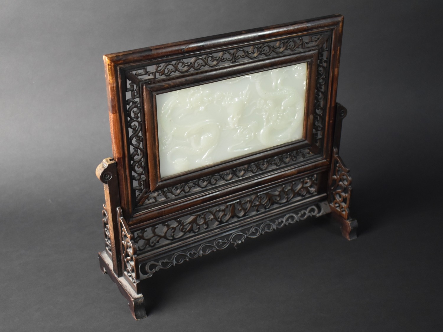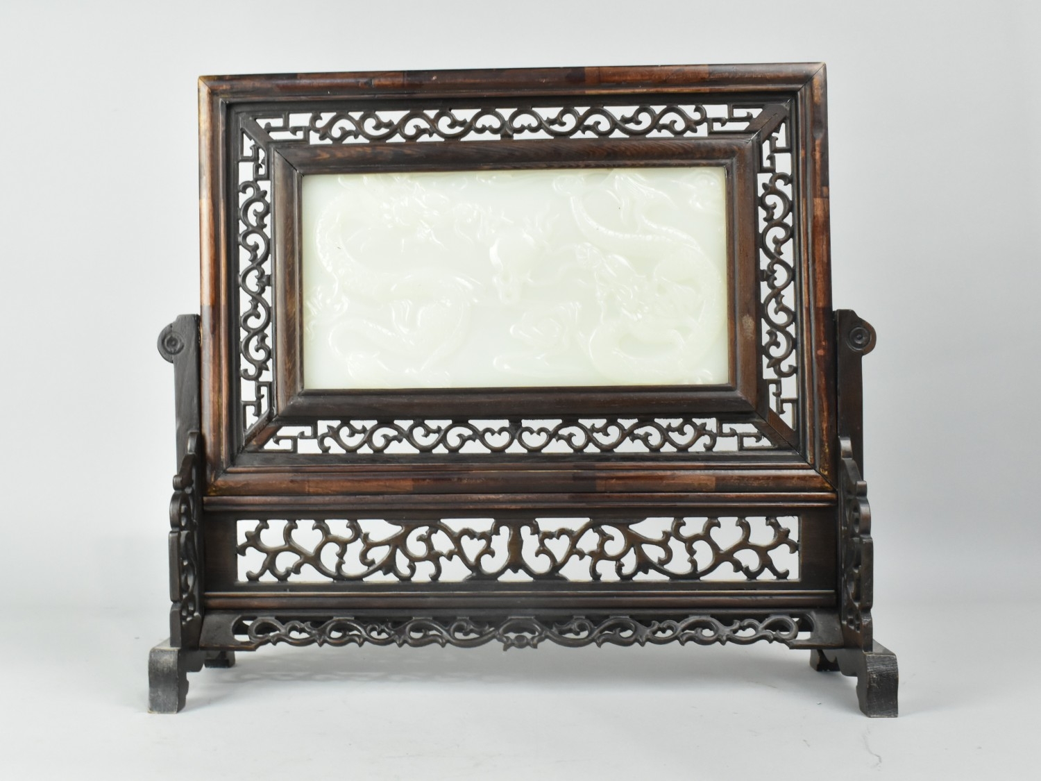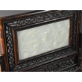 A 20th Century Chinese Carved Wood Table Screen with Inset Jade Panel, the One Side Carved in Shallow Relief with Dragons (Panel Cracked), 38x33cm high
