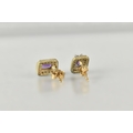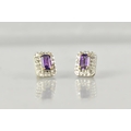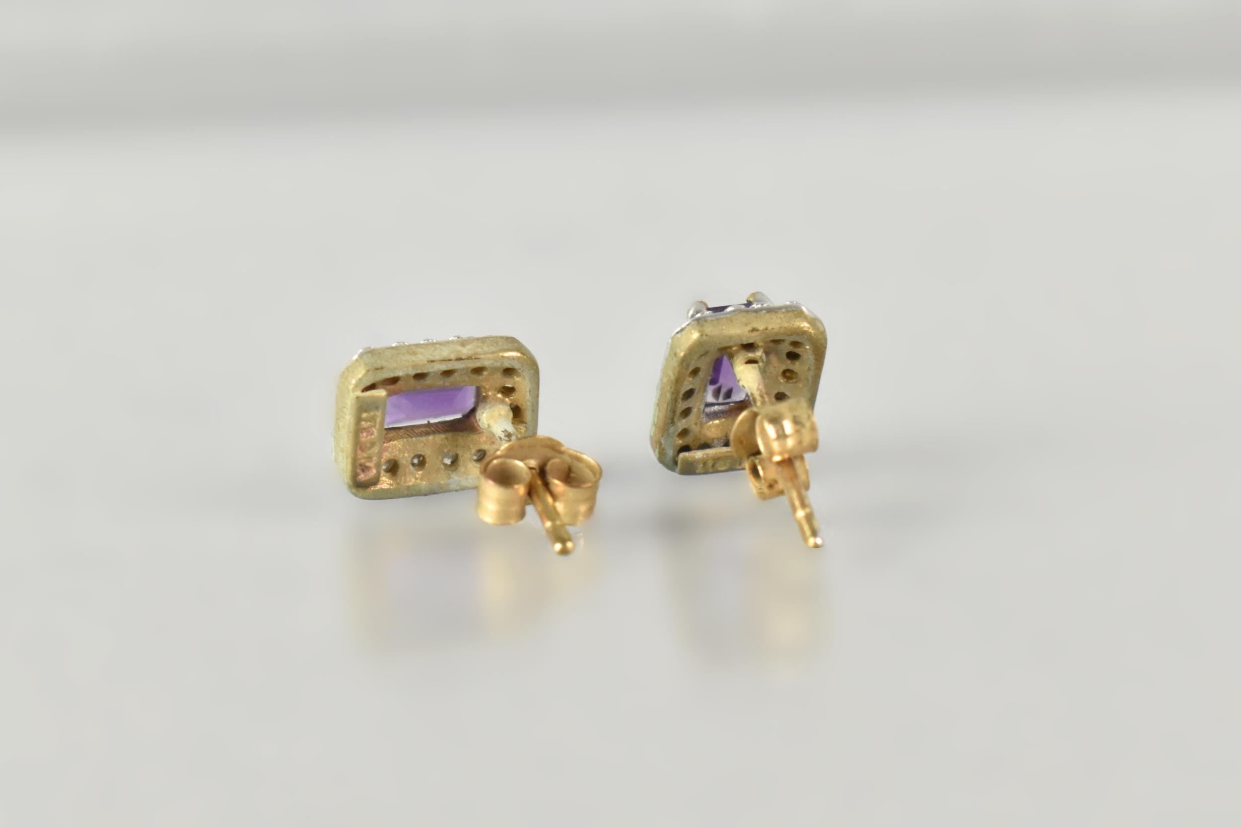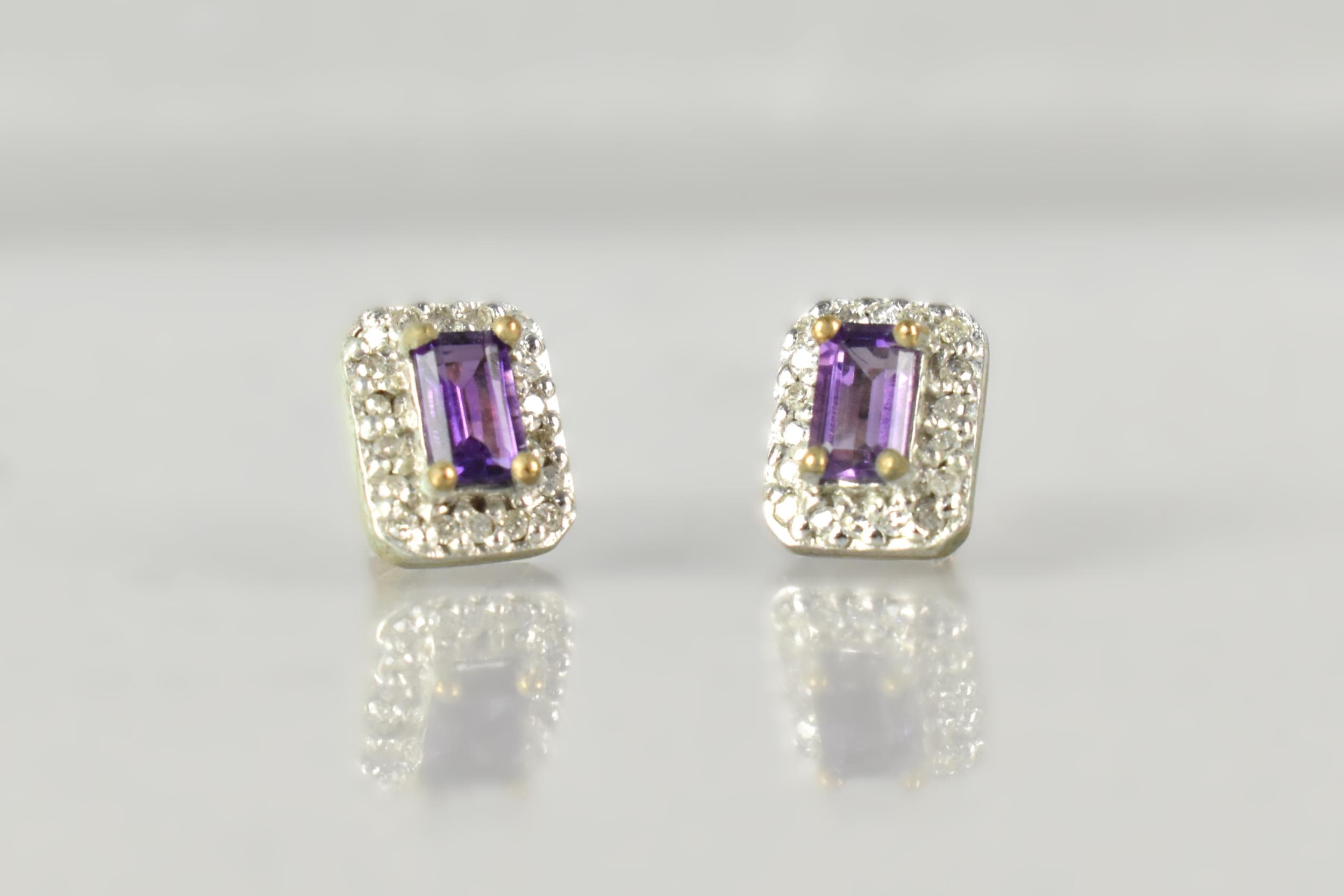 A Pair of Diamond and Amethyst Earrings, Emerald Cut Amethyst Measuring 5.1mm by 3.1mm and Supported in Four Gold Metal Tipped Prongs and with Halo of Eighteen Small Round Cut Diamonds in White Metal, Stamped Verso 375 Dia, 1.6gms Total Weight