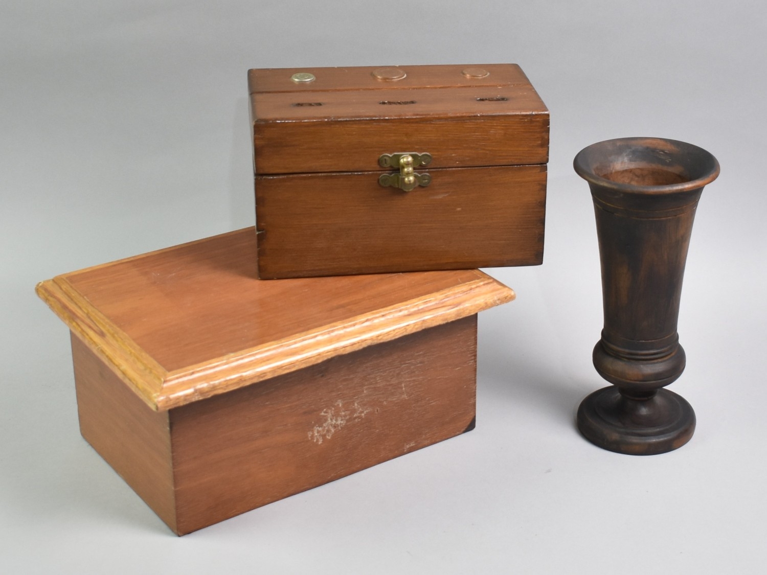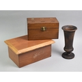 Three Pieces of Treen to comprise Turned Vase, 23cms High, Three Slot Rectangular Money Box with Mounted QEII 5p, 2p and 1p, 22.5cms Wide and a Wooden Box with Hinged Lid, 31cms Wide