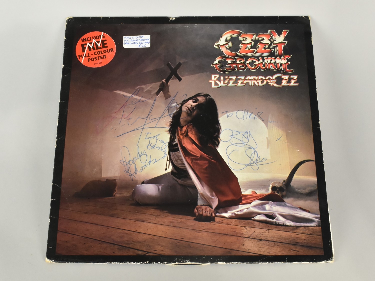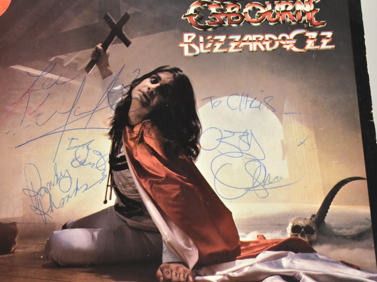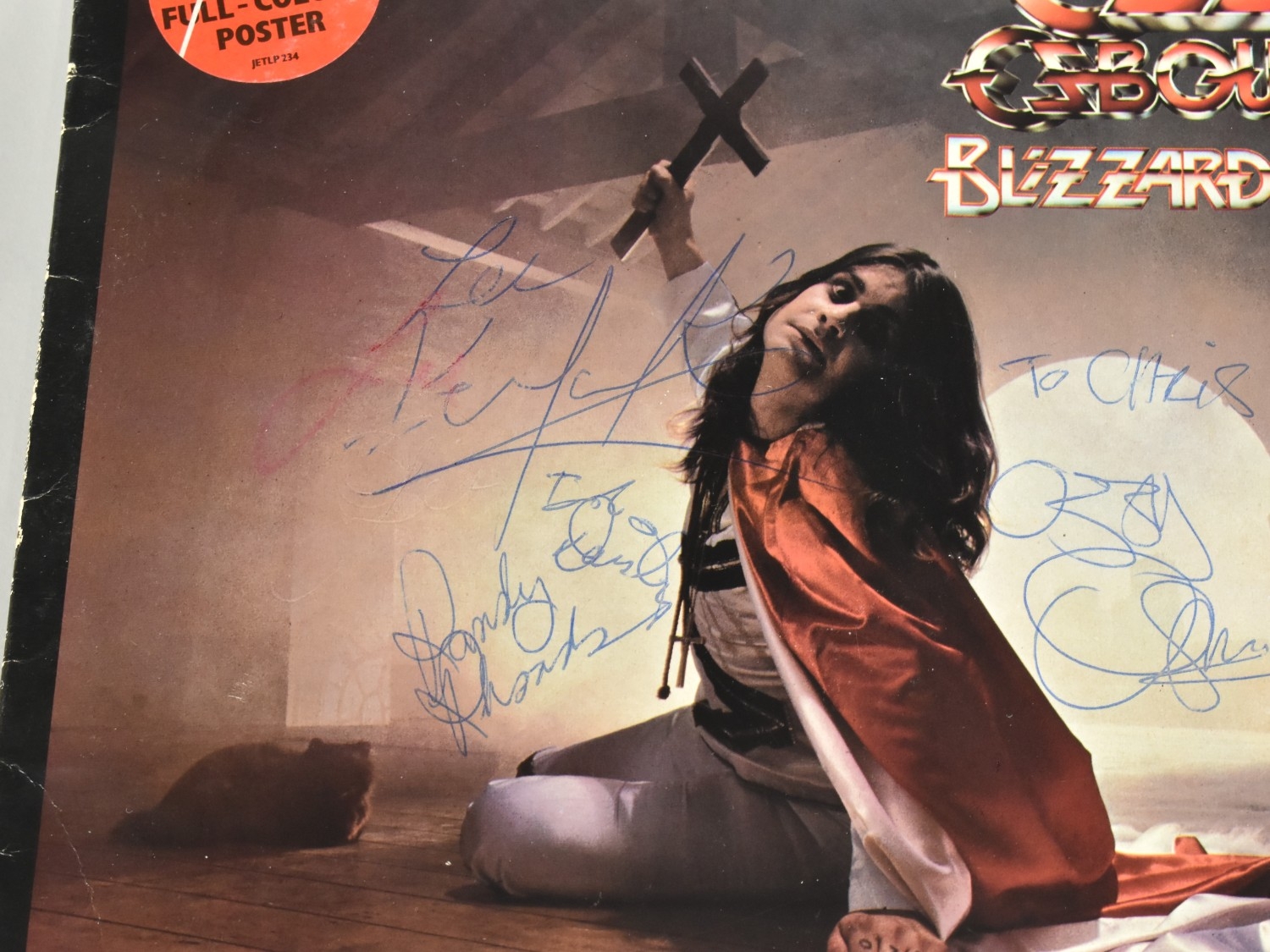 A Signed Ozzy Osbourne 'Blizzard of Ozz' LP by Jet Records, (Jet LP234) with Lyric Sleeve but no Poster, Autographed by All Band Members 'To Chris' by Ozzy Osbourne, Randy Rhoads, Lee Kerslake and Rob Daisley