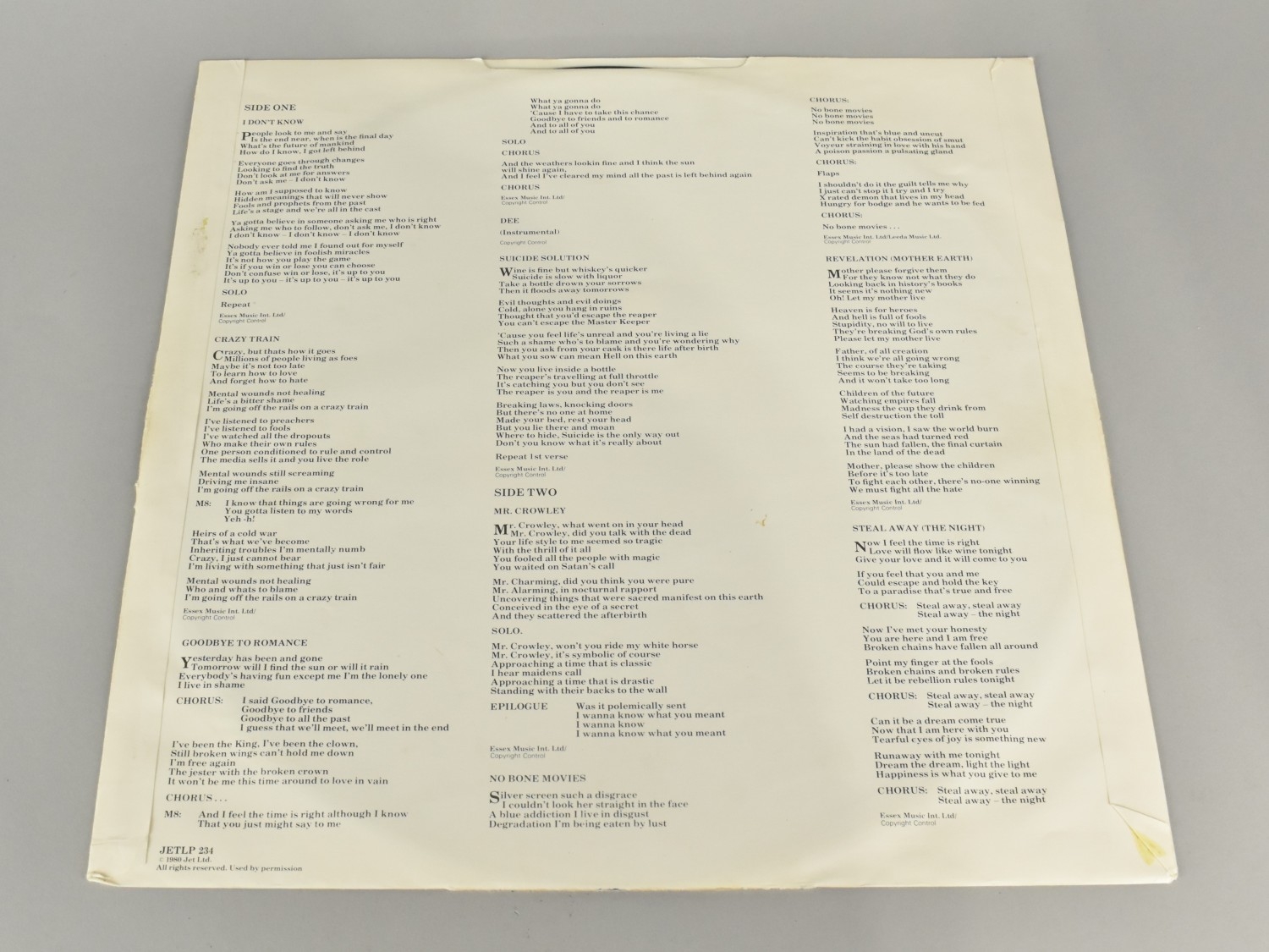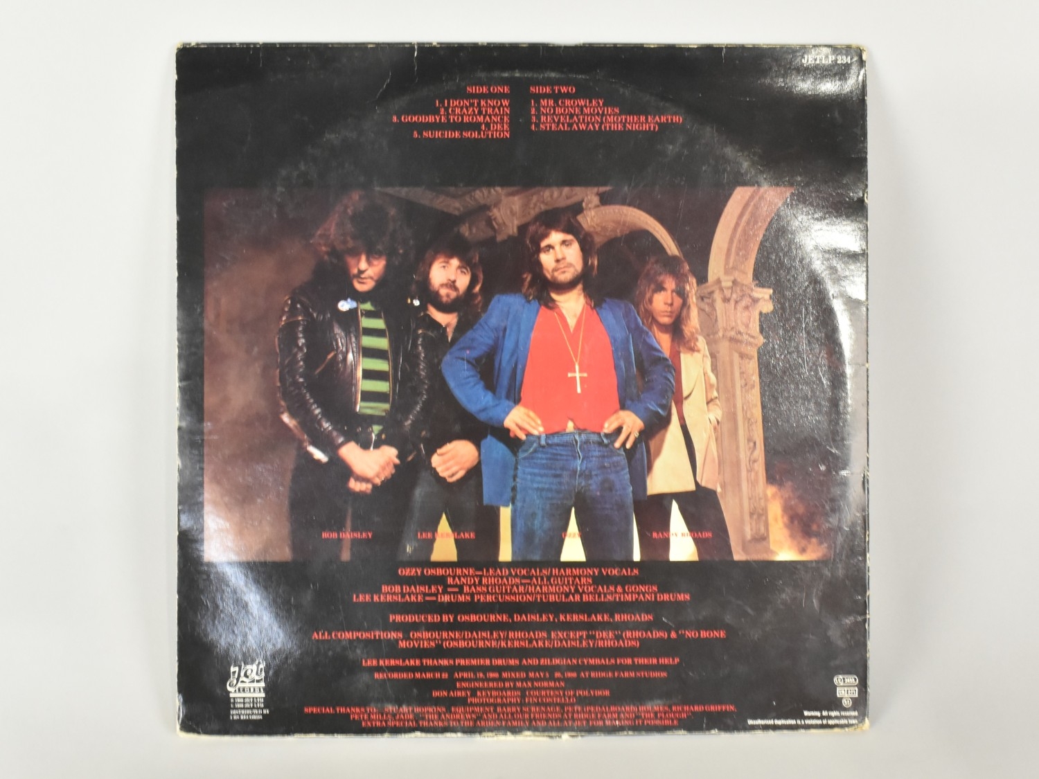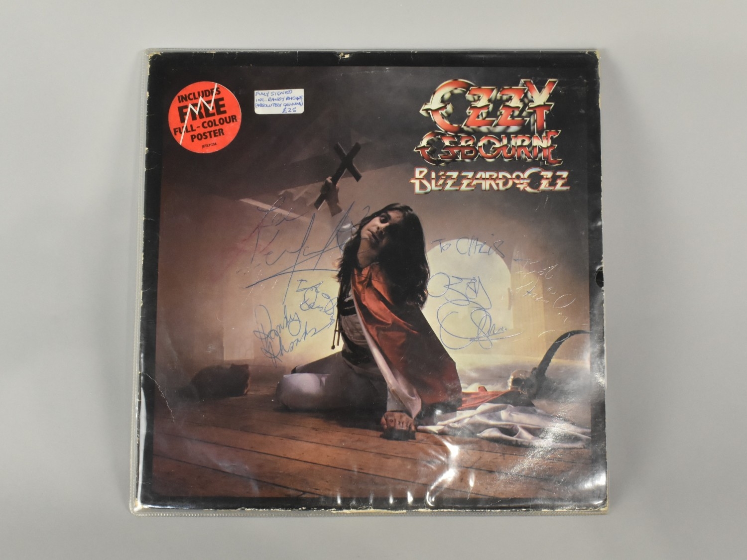 A Signed Ozzy Osbourne 'Blizzard of Ozz' LP by Jet Records, (Jet LP234) with Lyric Sleeve but no Poster, Autographed by All Band Members 'To Chris' by Ozzy Osbourne, Randy Rhoads, Lee Kerslake and Rob Daisley