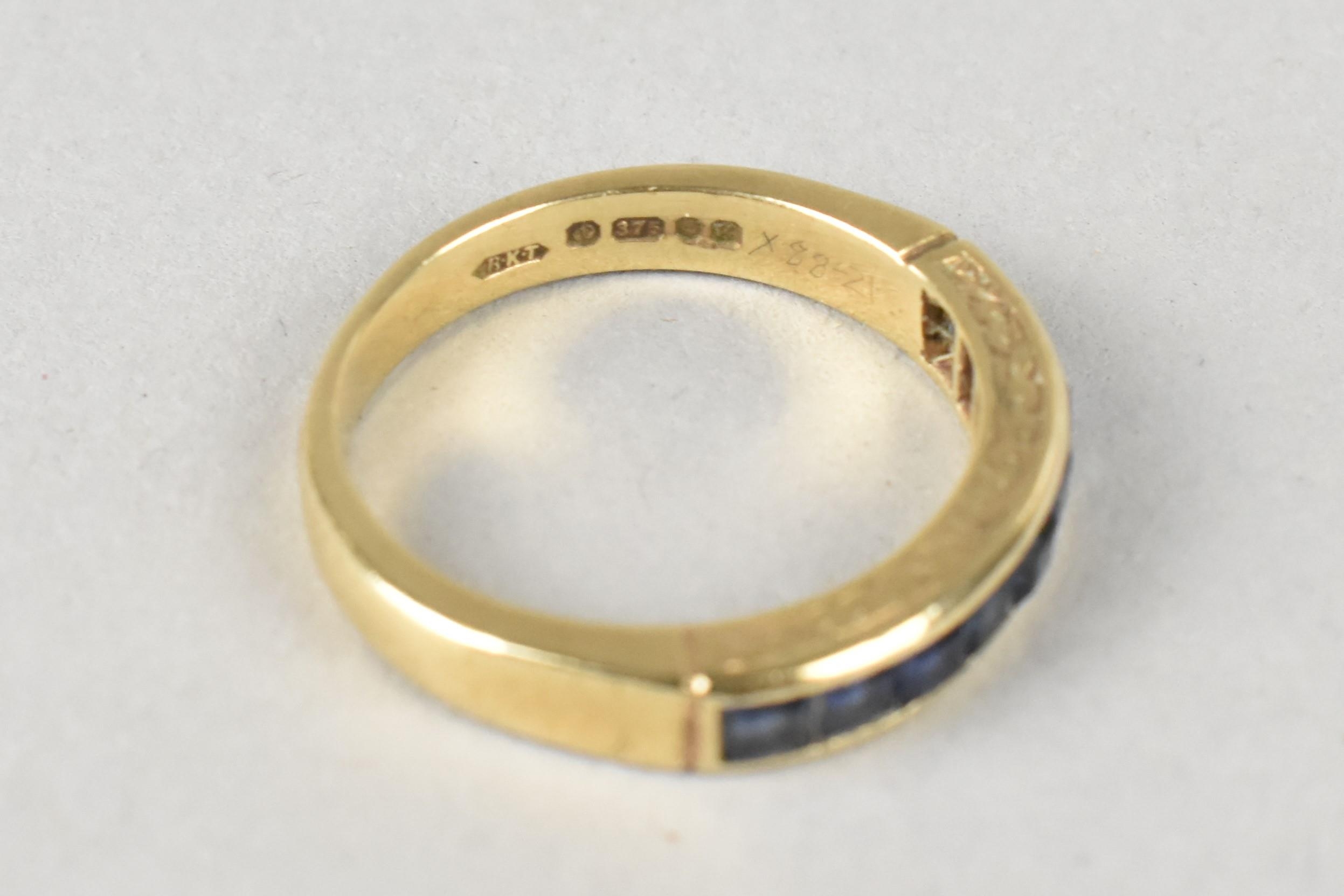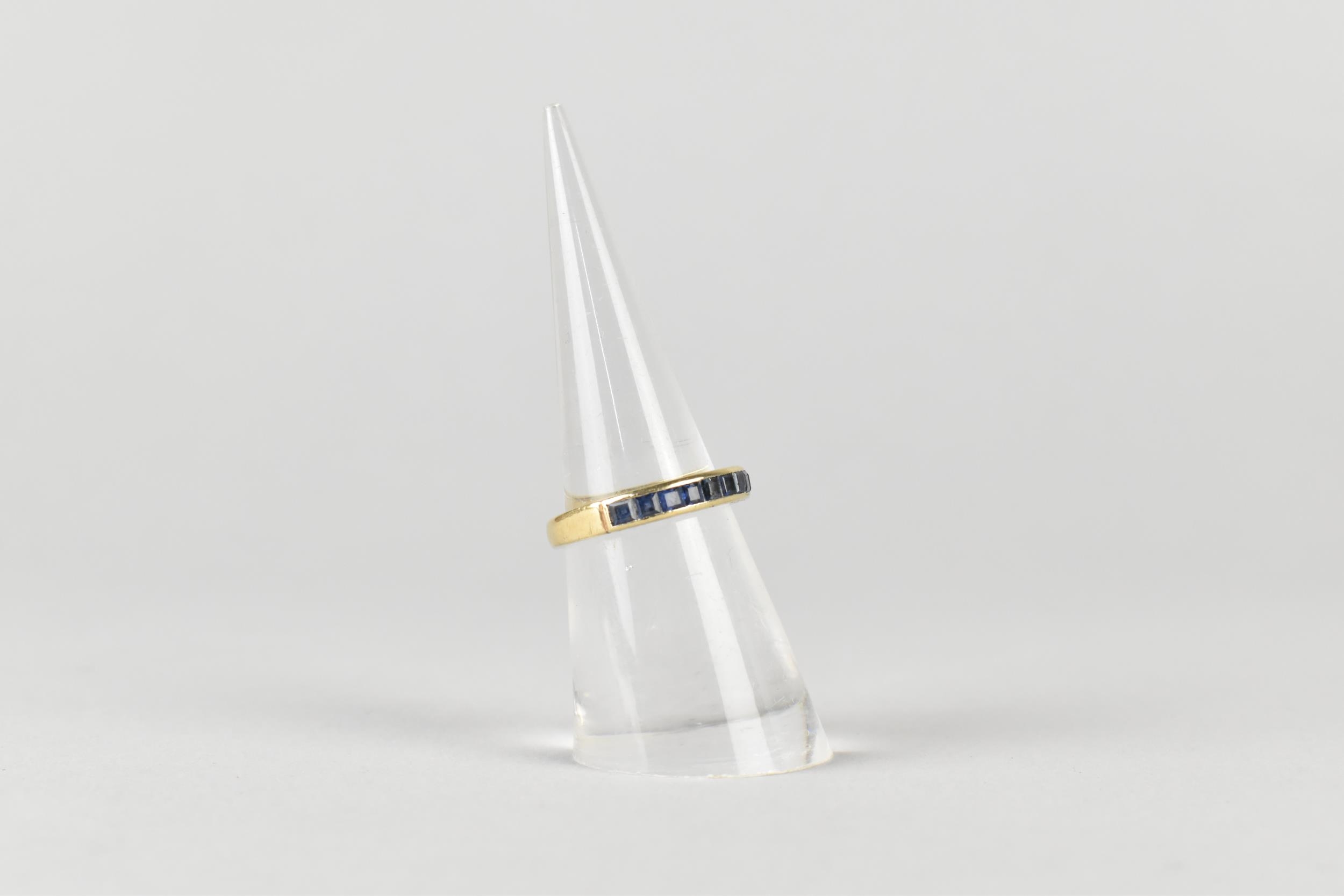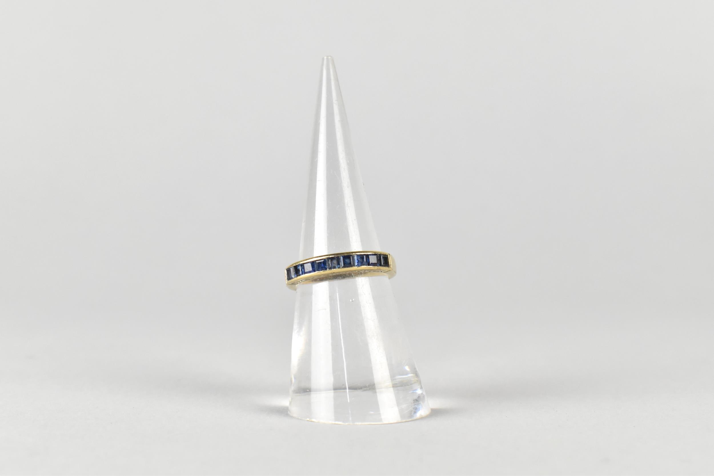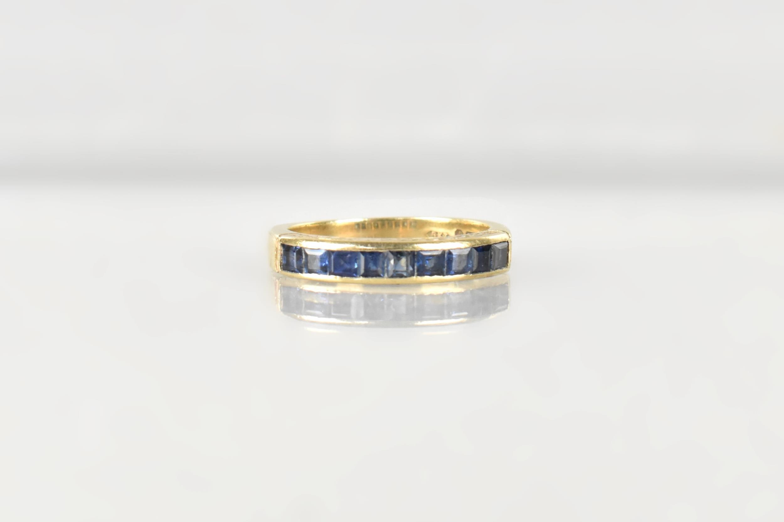 A Sapphire Mounted 9ct Gold Half Eternity Ring, Channel Set Square Cut Stones in a Rectangular Recess, Gallery with Engraved Decoration, London Hallmark for 1984 and Makers Mark BKT, Size M.5, 3.1gms