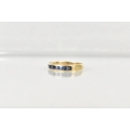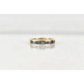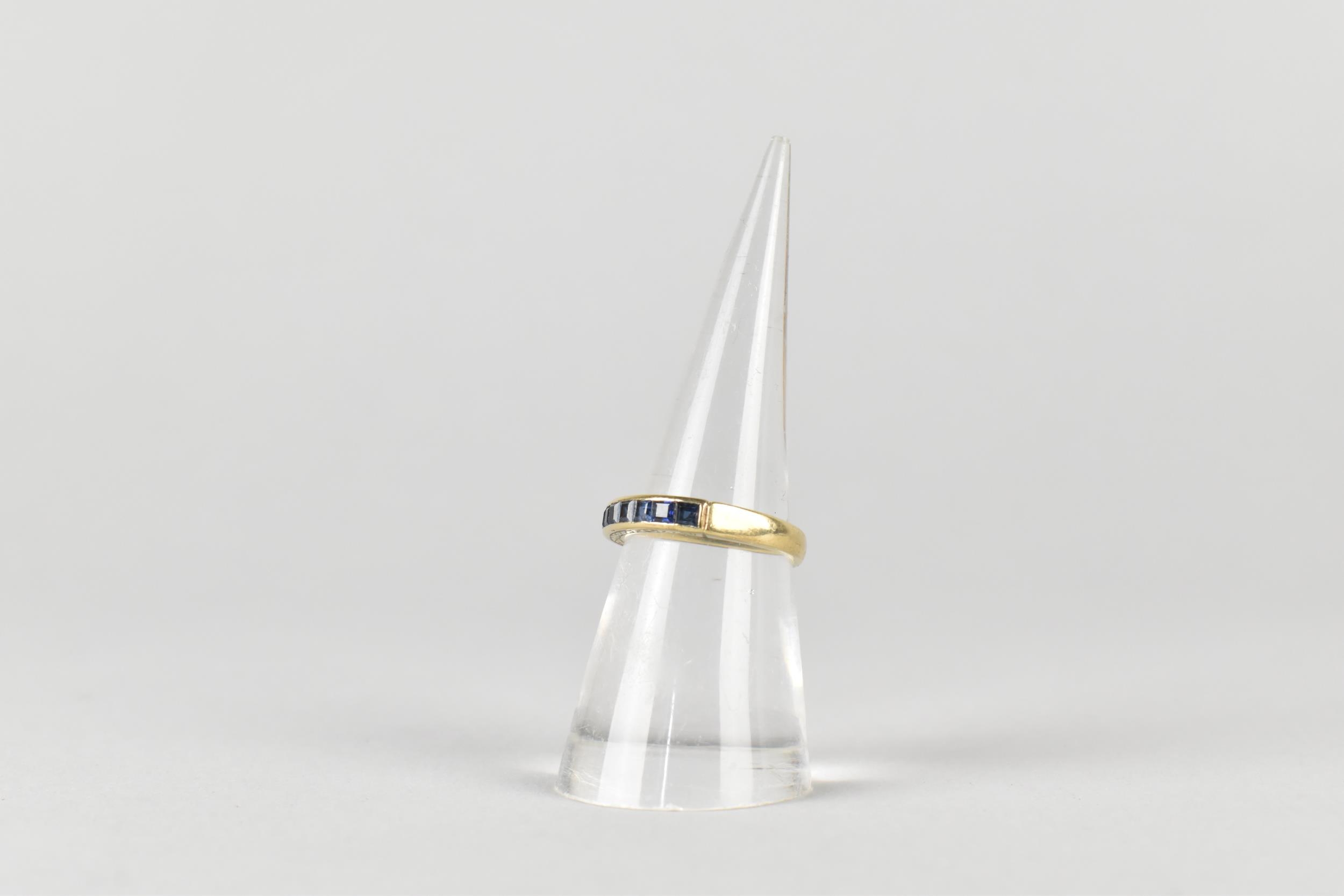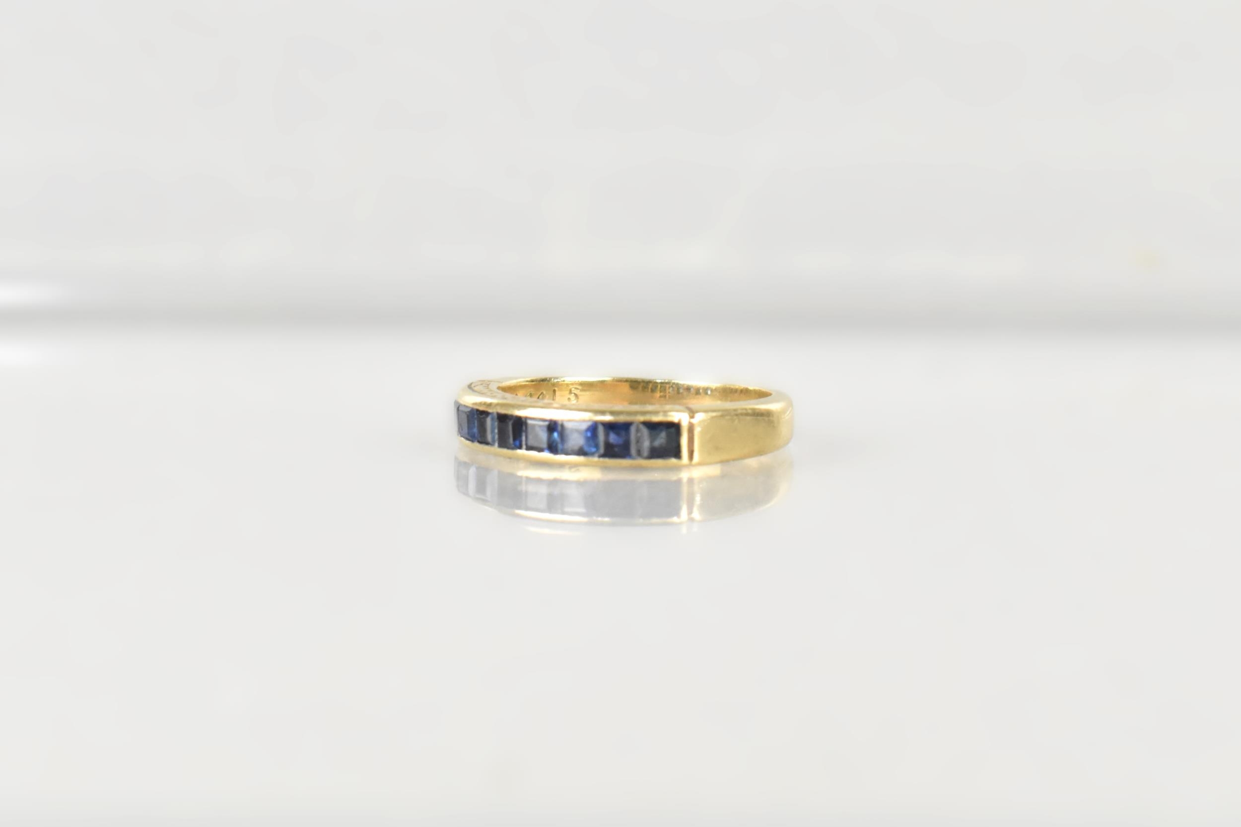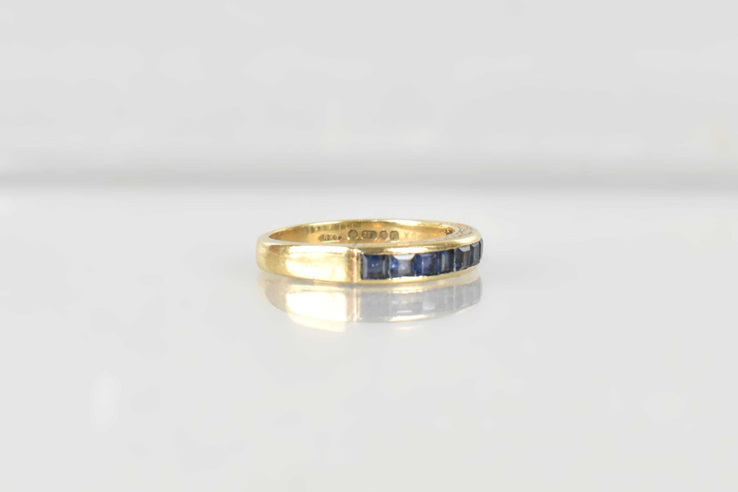 A Sapphire Mounted 9ct Gold Half Eternity Ring, Channel Set Square Cut Stones in a Rectangular Recess, Gallery with Engraved Decoration, London Hallmark for 1984 and Makers Mark BKT, Size M.5, 3.1gms