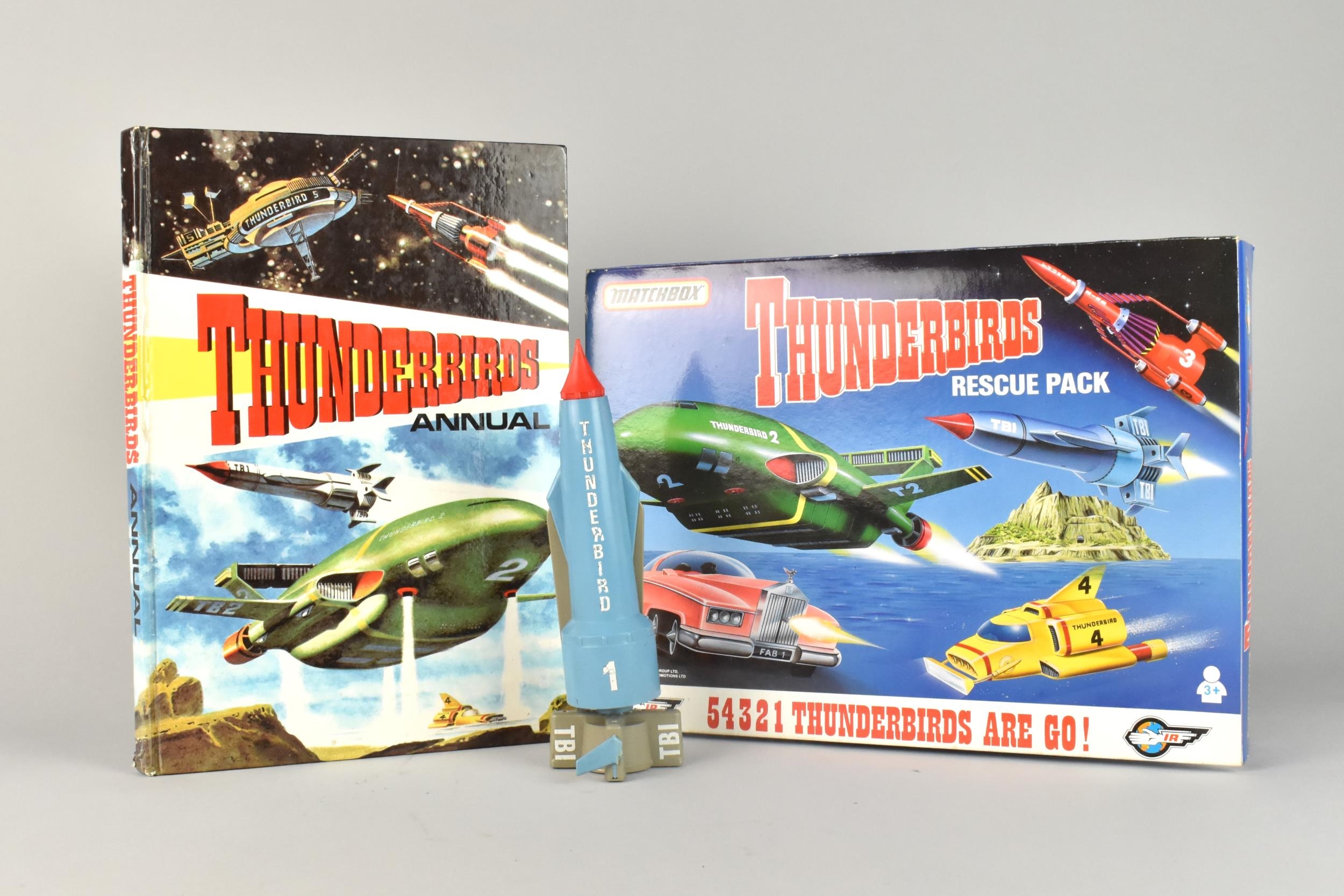 A Matchbox Thunderbirds Vehicle 'Rescue Pack' together with a Friction Thunderbird 1 (AF) and a 1966 Annual