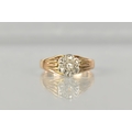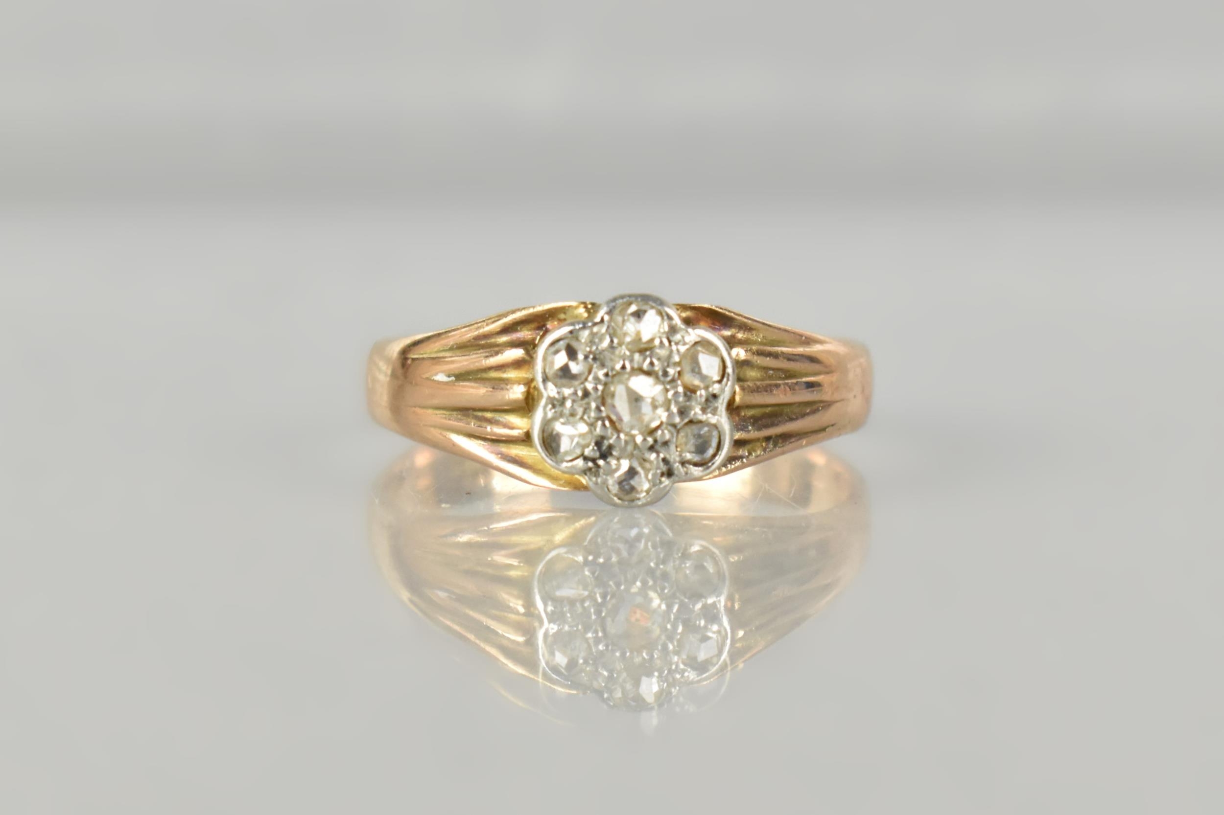 A 9ct Rose Gold and Platinum Diamond Mounted Daisy Ring, Primary Rose Cut Stone Measuring 1.7mm Diameter Approx and with Six Similarly Cut Diamond 'Petals' to Surround, Each Approx 1.3mm Diameter, Tapered Fluted Shoulders to a Polished Wide D Shape Band, Stamped to the Interior '9ct Plat', 2.4gms, Size M