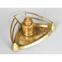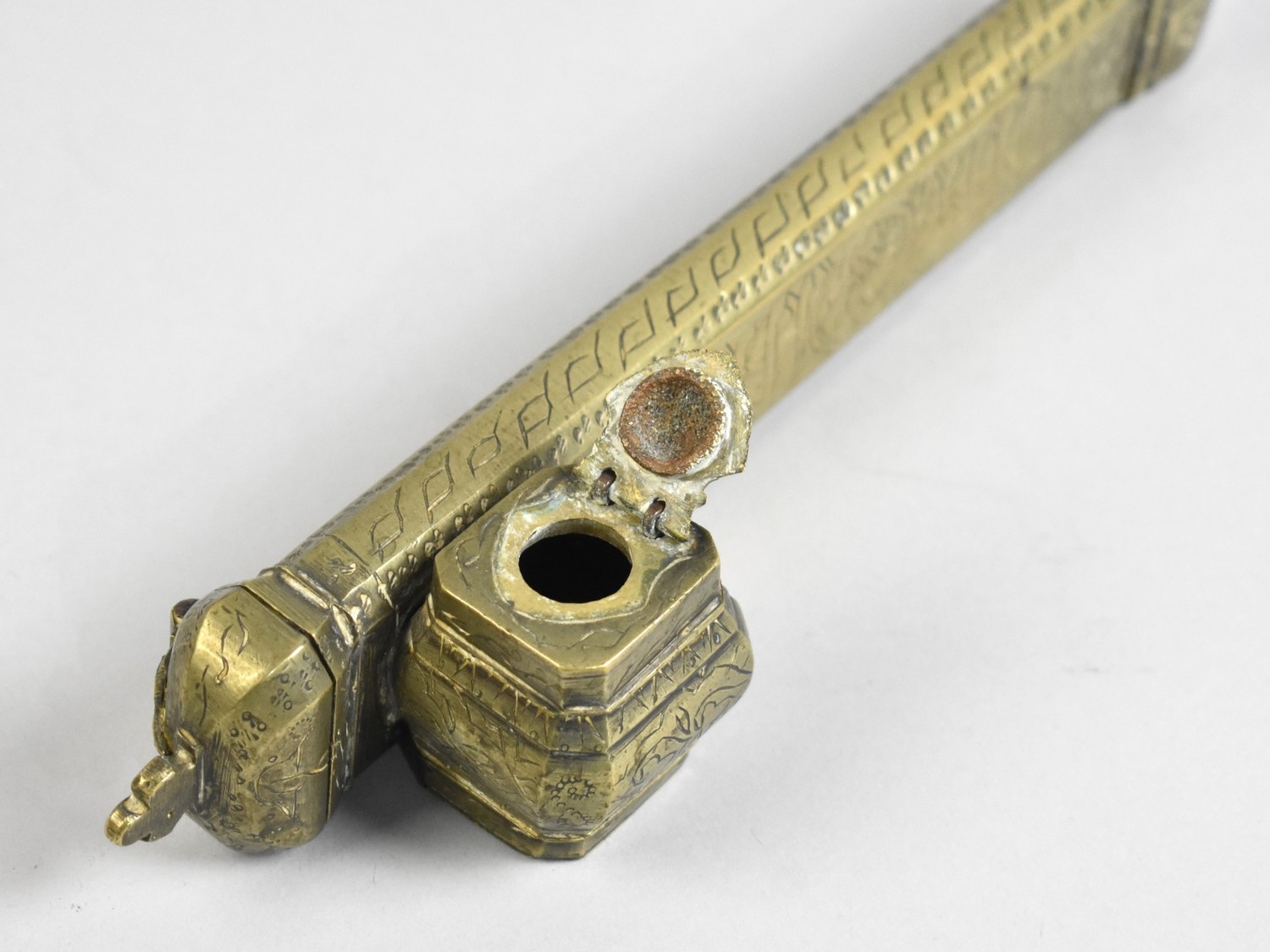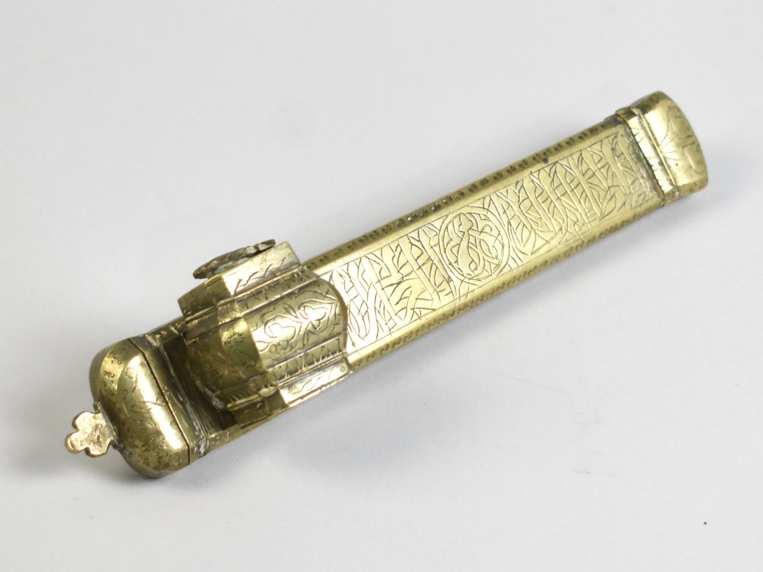 An Engraved Brass Ottoman or Persian Qalamdan or Scribes Case with Inkwell and Pen Holder