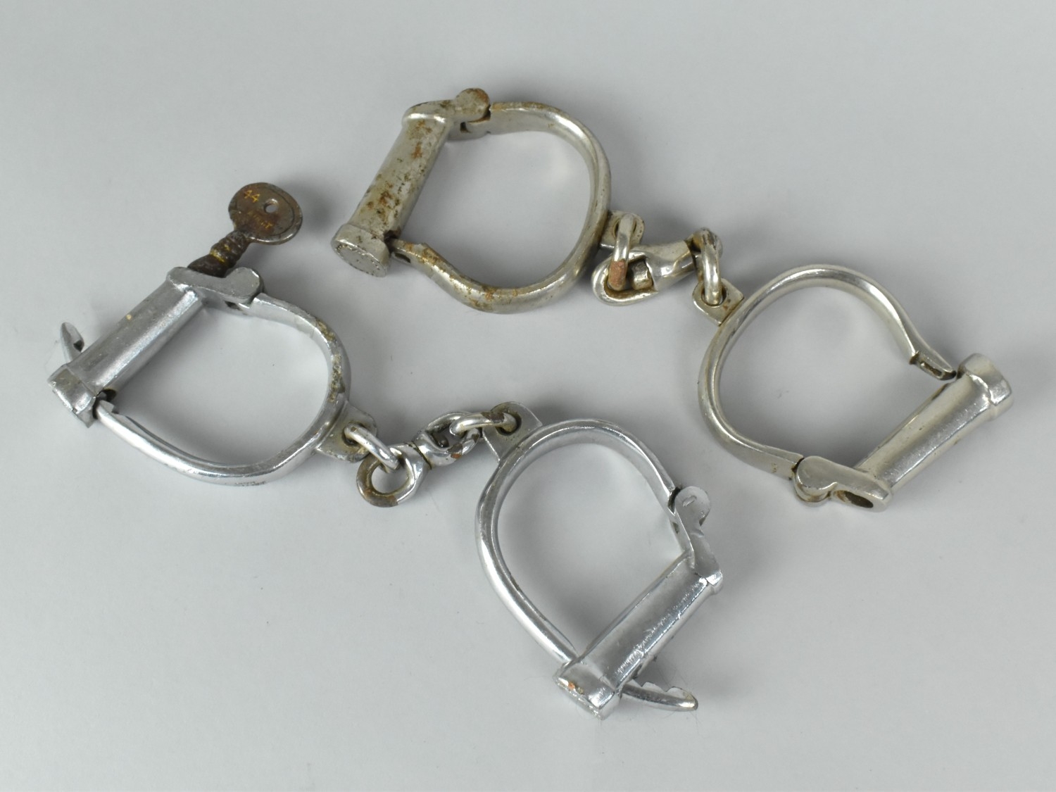 Two Pairs of Vintage Police Handcuffs by Hiatt, one with Key