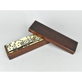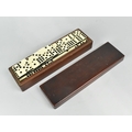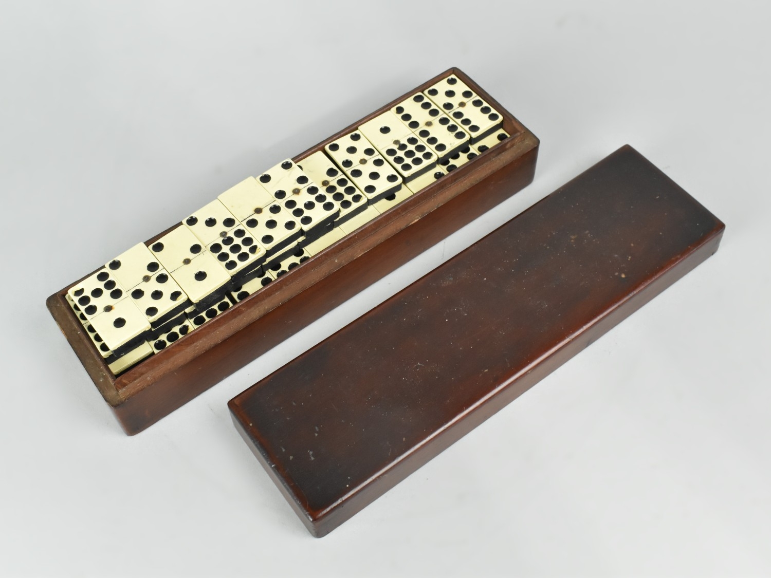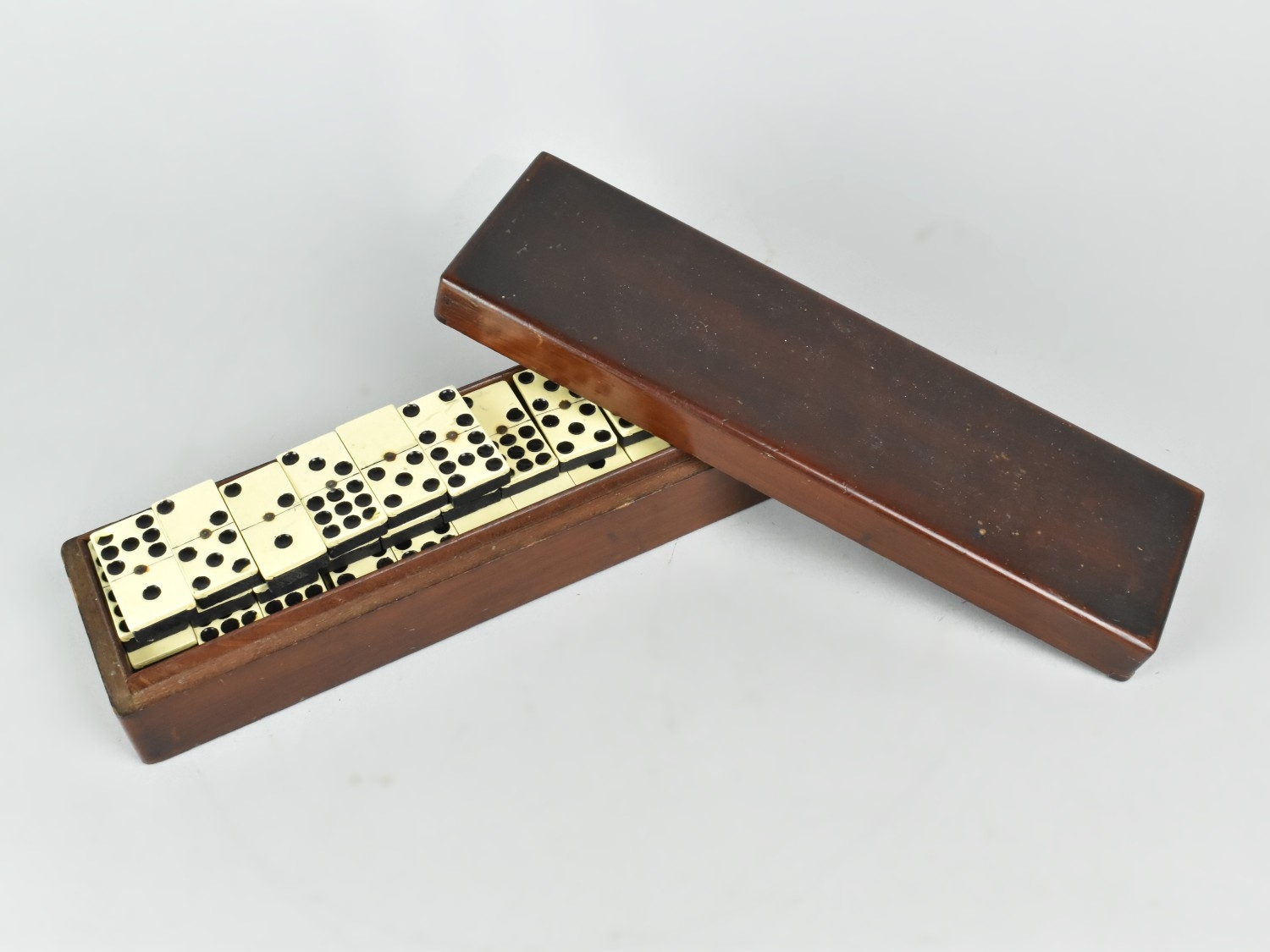 A Late Victorian Mahogany Box Containing Bakelite and Wooden Nine Spot Dominoes