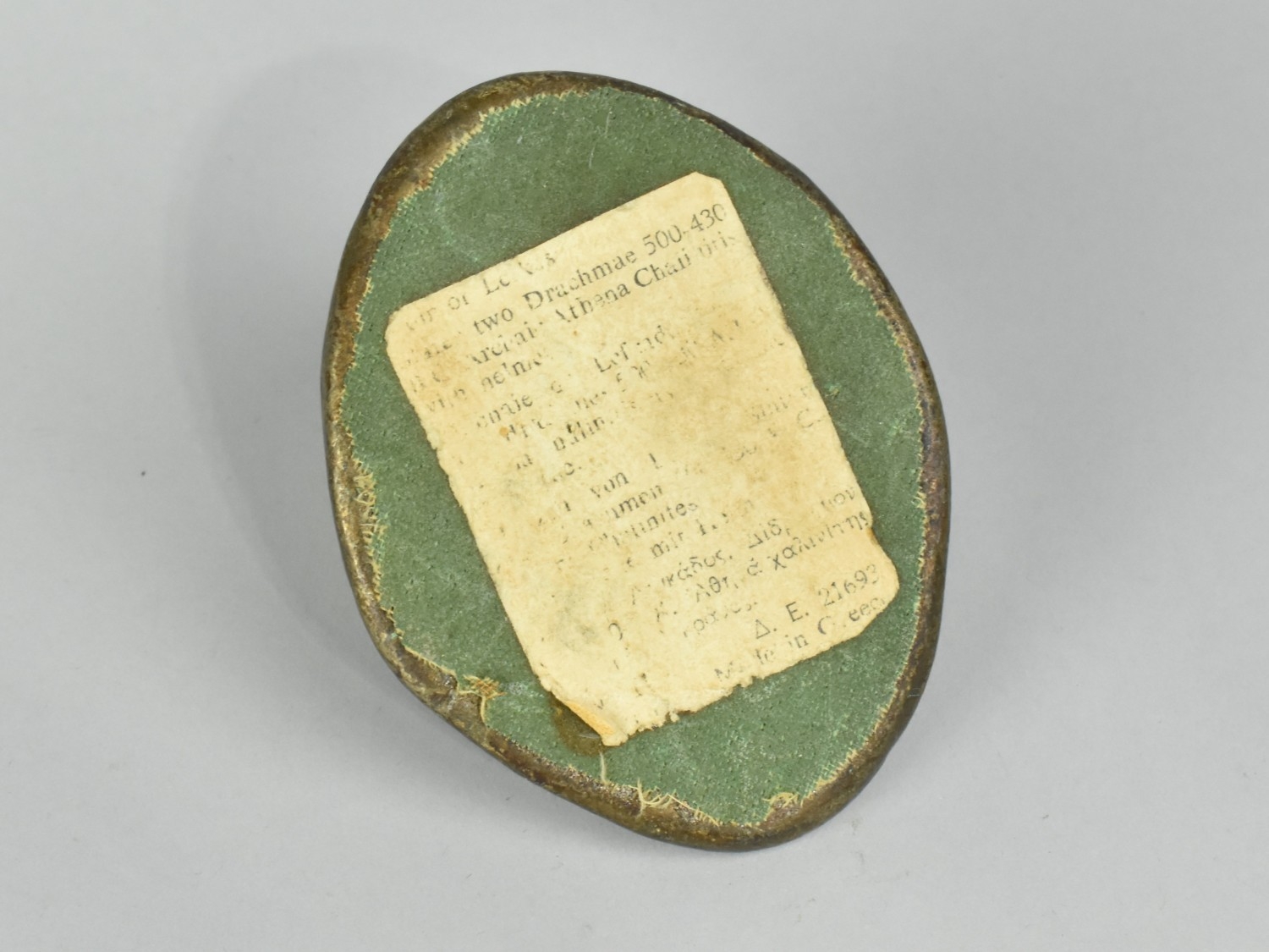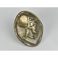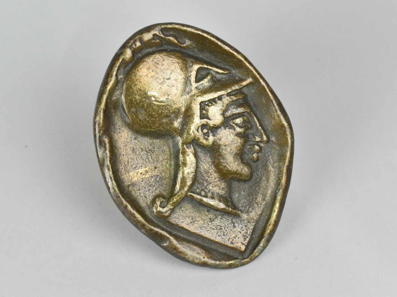 A Replica Souvenir of an Ancient Greek Bronze Medal or Coin with the bust of Athena Chalinitis wearing helmet. 9cms High. Paper label Verso but very worn.